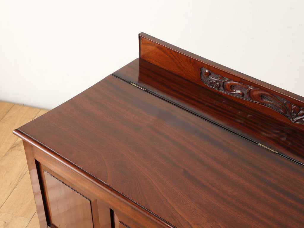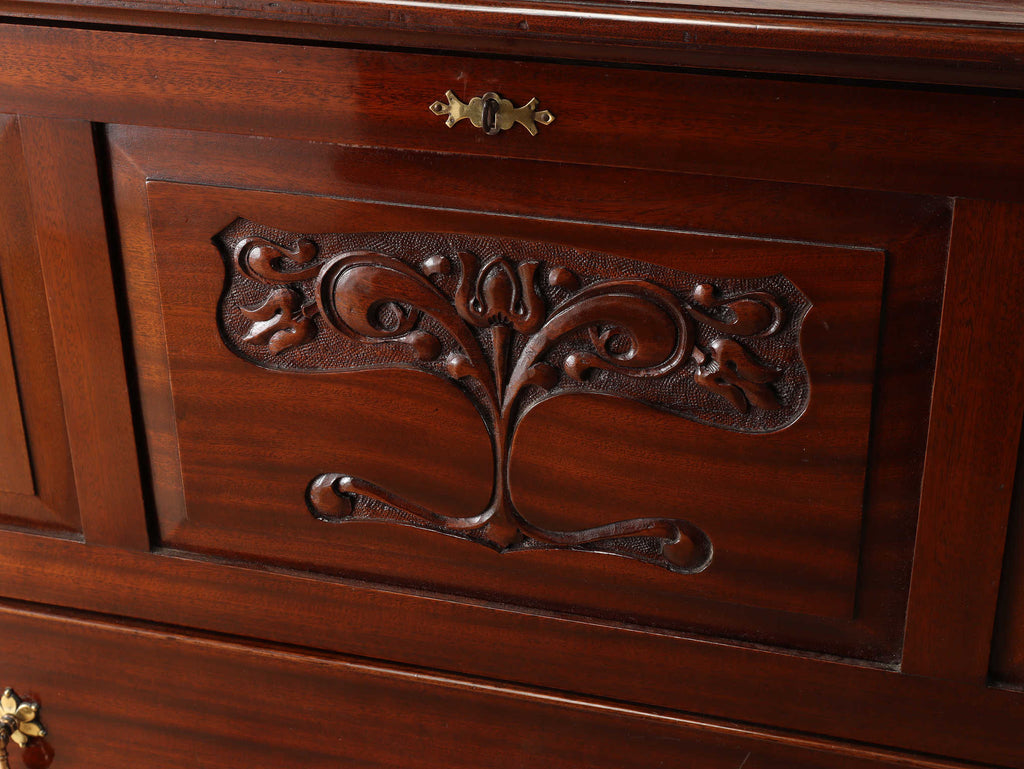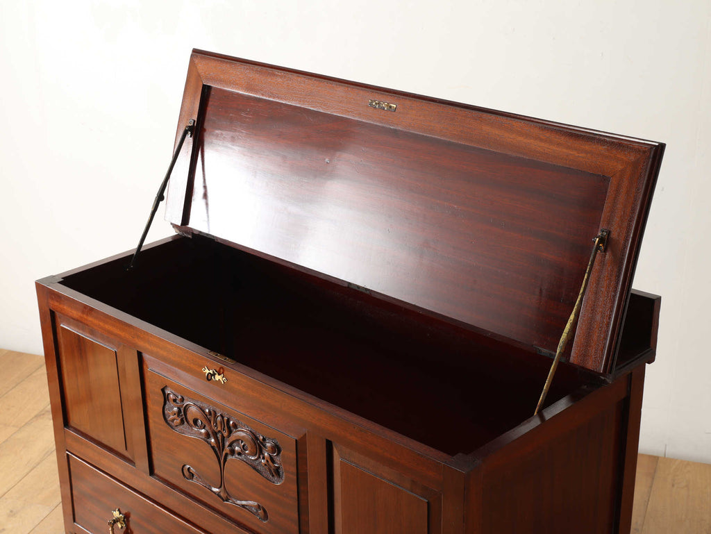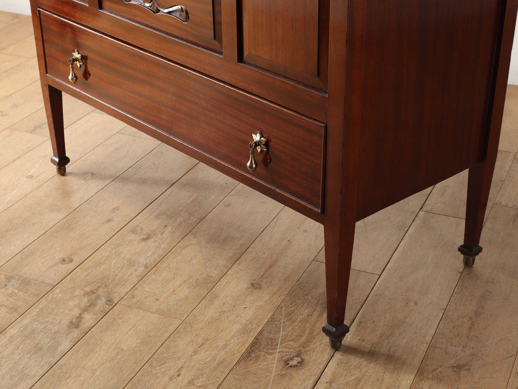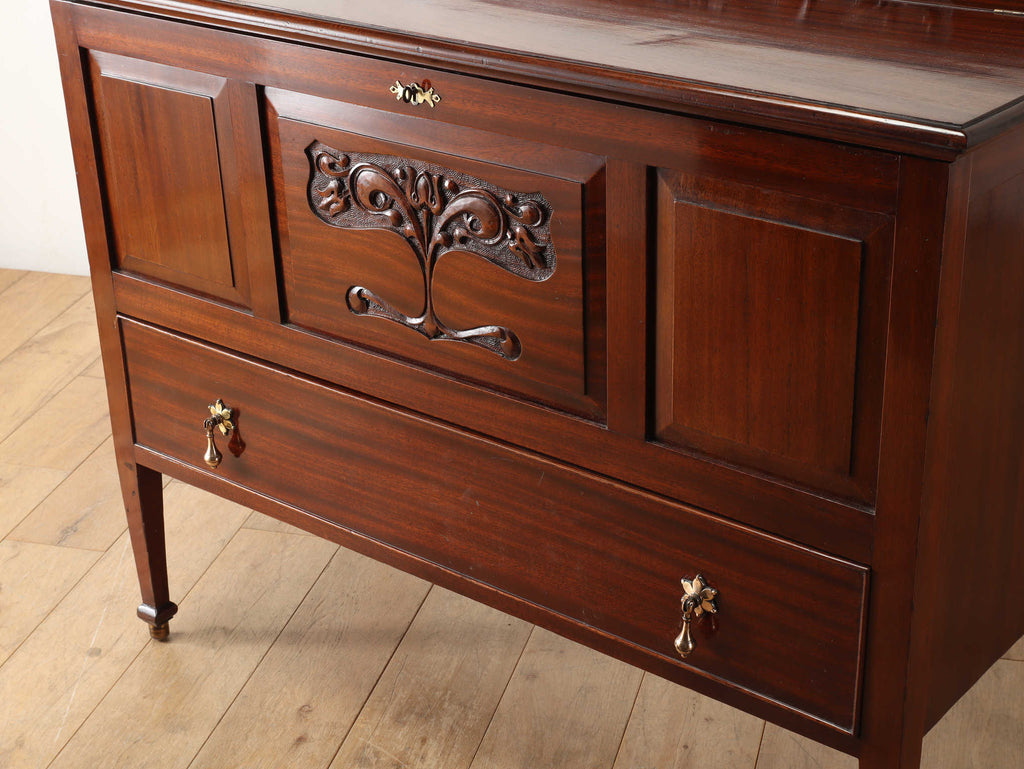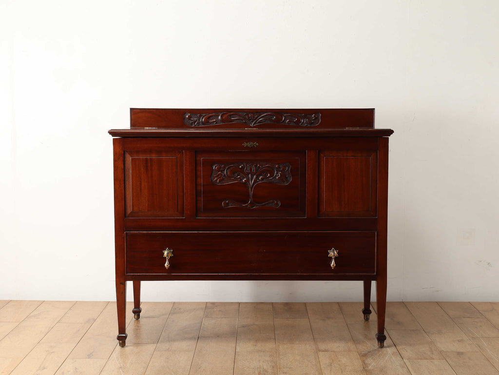 推定1910年イギリス製のアールヌーボーチェストです。アールヌーボーとは、フランス語で「新しい芸術」を意味する言葉。この様式の特徴としては、主に植物をモチーフにした美しいデザインが挙げられるでしょう。その様式ならではの、緩やかな曲線で描かれた美しい彫刻が目を引くチェストです。マホガニーの艶めく美しい木目も相まって優美な一品ですが、スッキリとしたシルエットが大変魅力的。細部まで美しく仕上げられたチェストで、インテリアにスパイスを与えてみてはいかがでしょうか。