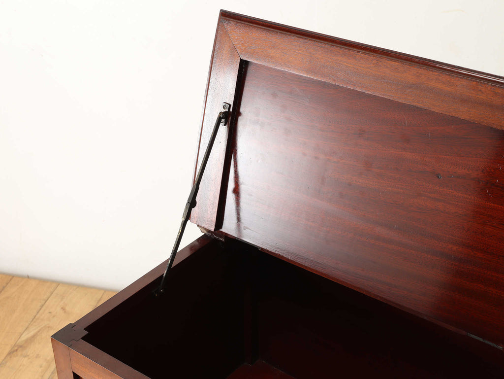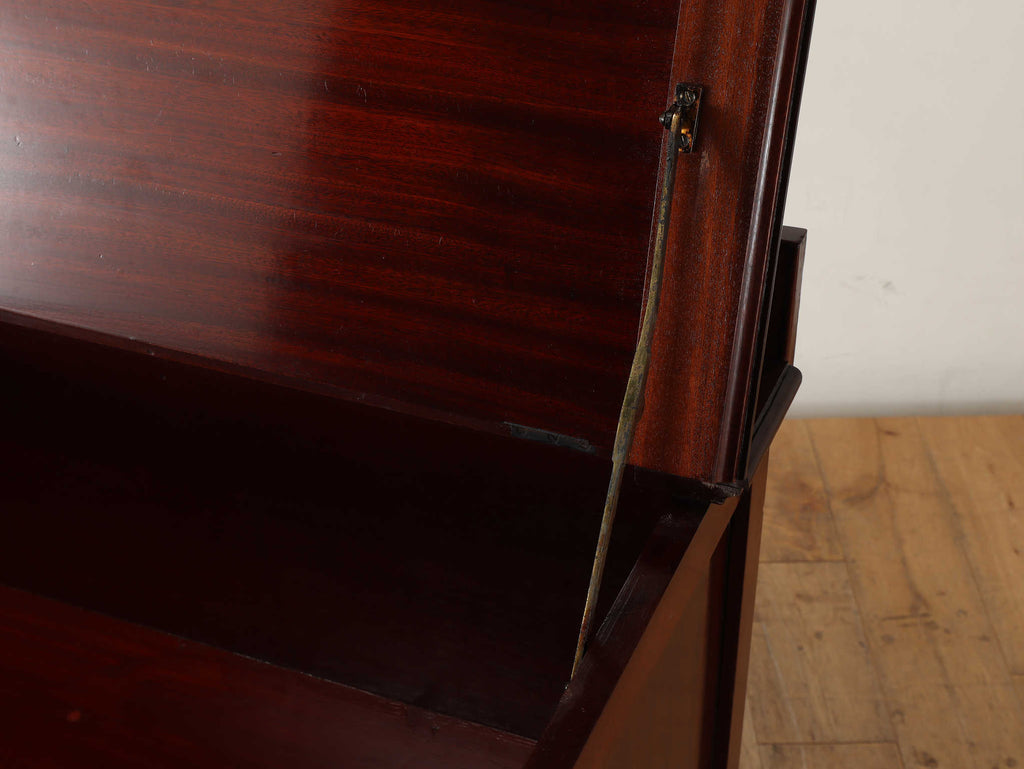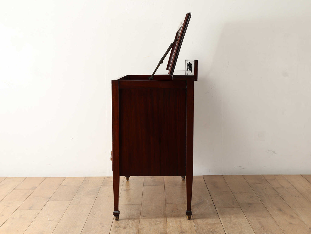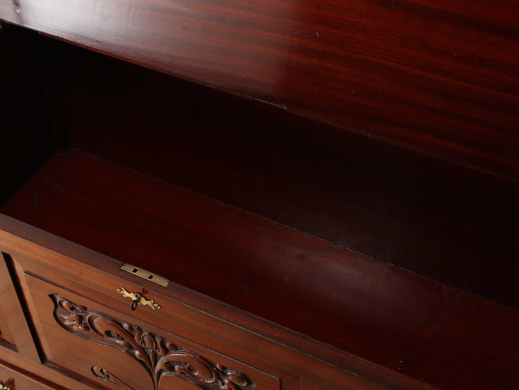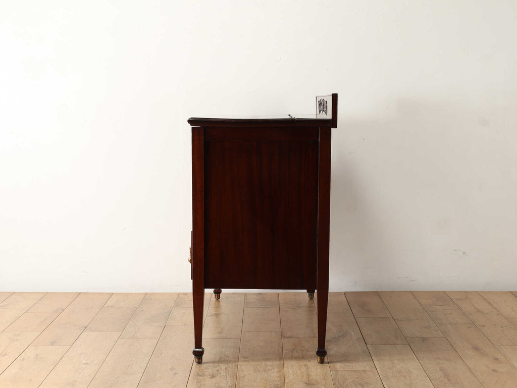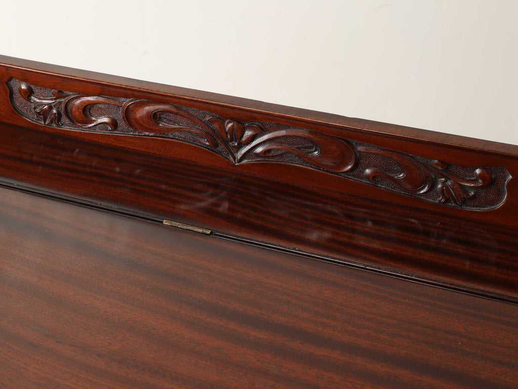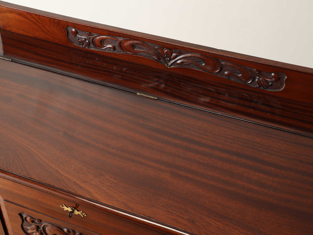 推定1910年イギリス製のアールヌーボーチェストです。アールヌーボーとは、フランス語で「新しい芸術」を意味する言葉。この様式の特徴としては、主に植物をモチーフにした美しいデザインが挙げられるでしょう。その様式ならではの、緩やかな曲線で描かれた美しい彫刻が目を引くチェストです。マホガニーの艶めく美しい木目も相まって優美な一品ですが、スッキリとしたシルエットが大変魅力的。細部まで美しく仕上げられたチェストで、インテリアにスパイスを与えてみてはいかがでしょうか。
