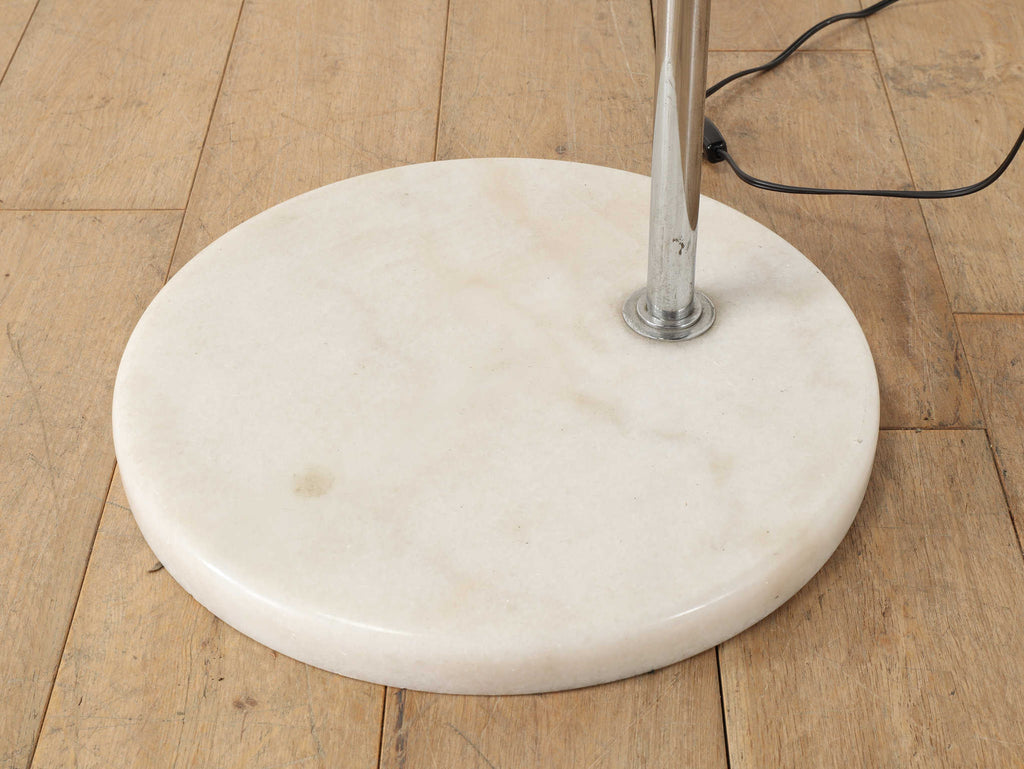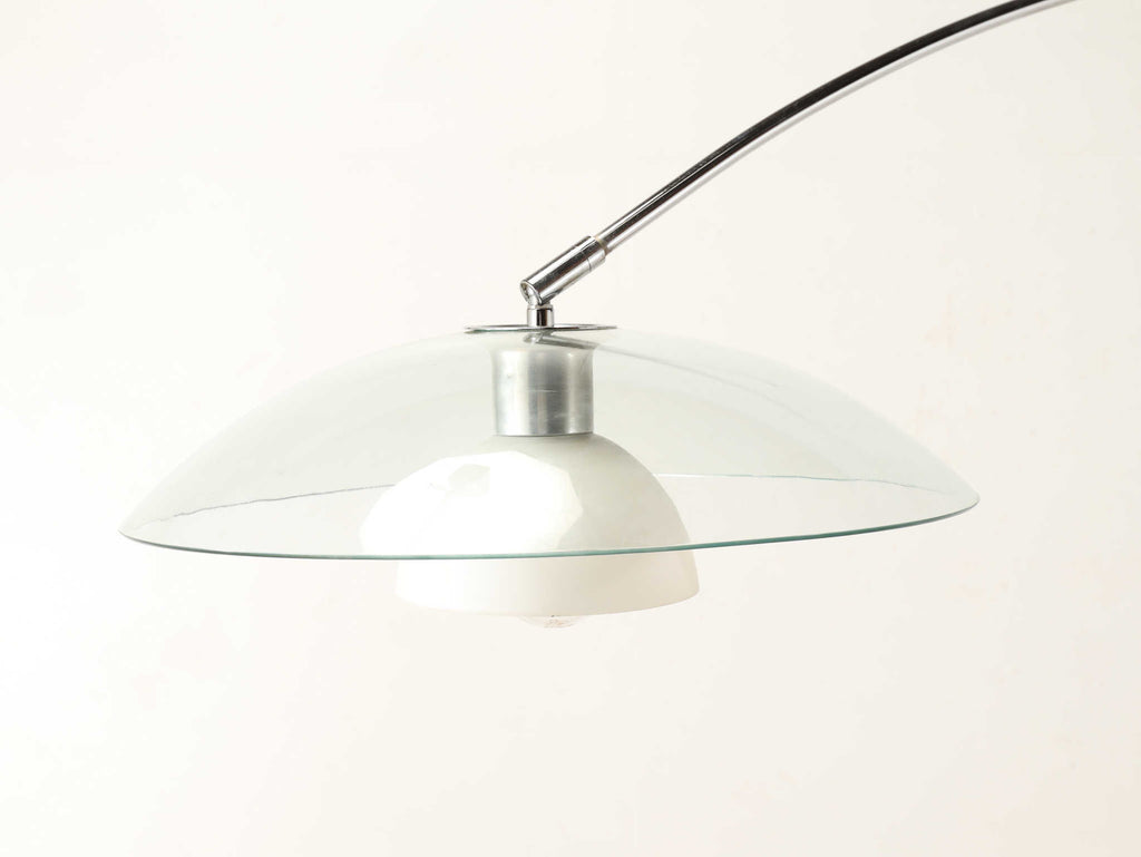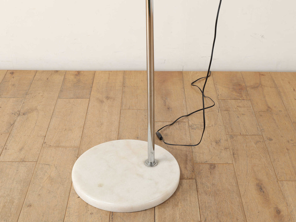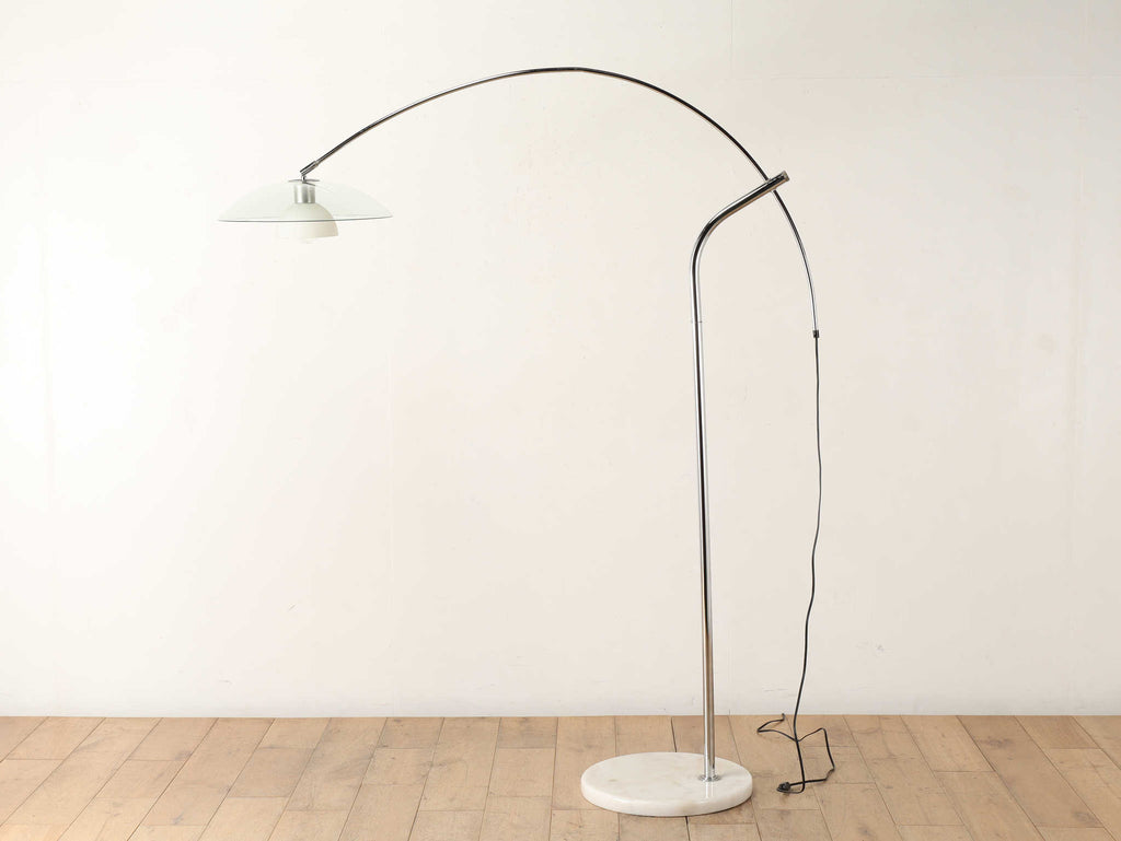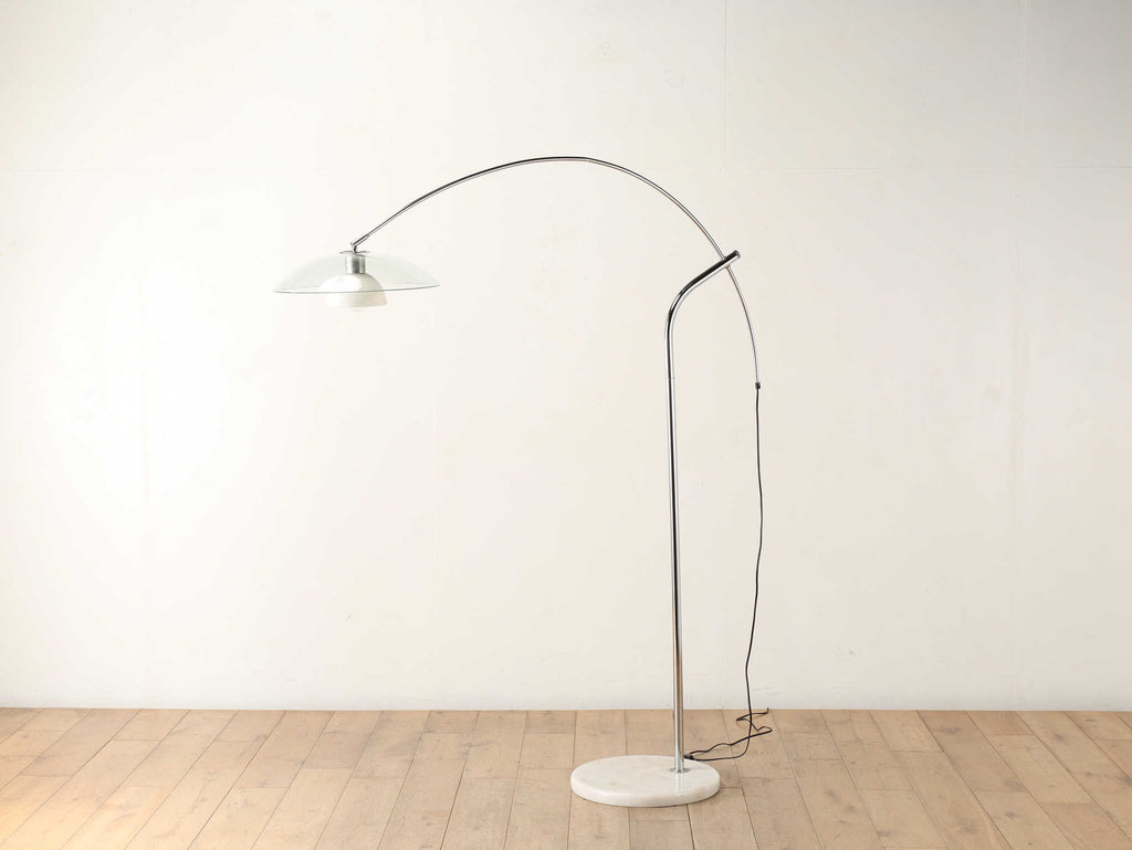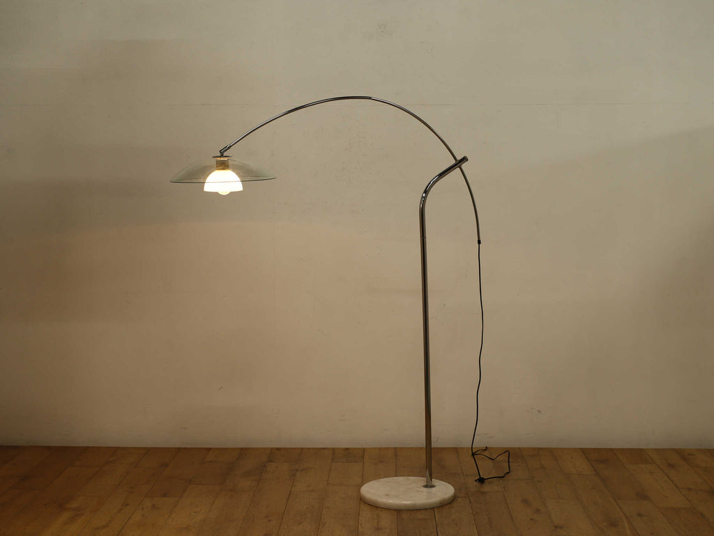 イタリア、1960年代(推定)のアークランプ。アークランプはその名の通り、弧を描くデザインが特徴的です。シーリングランプを取り付けられない場所でも、代わりとなって上から照らしてくれます。シェードは丸くボリューム感のあるものが多い中、こちらはグラスですっきりとしたシルエット。土台のマーブルや、クロムの支柱と相まって、軽やかですっきりとしたデザインとなっております。アンティークはもちろん、現代の家具とも合わせやすい逸品です。