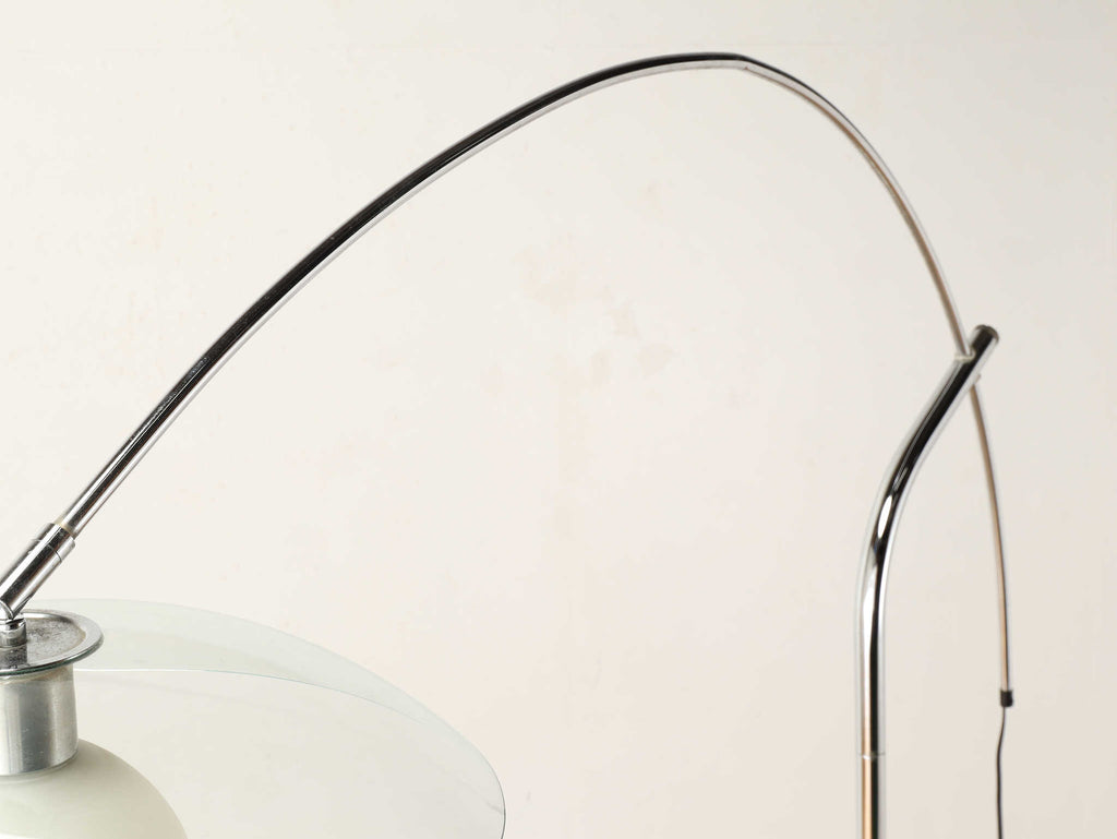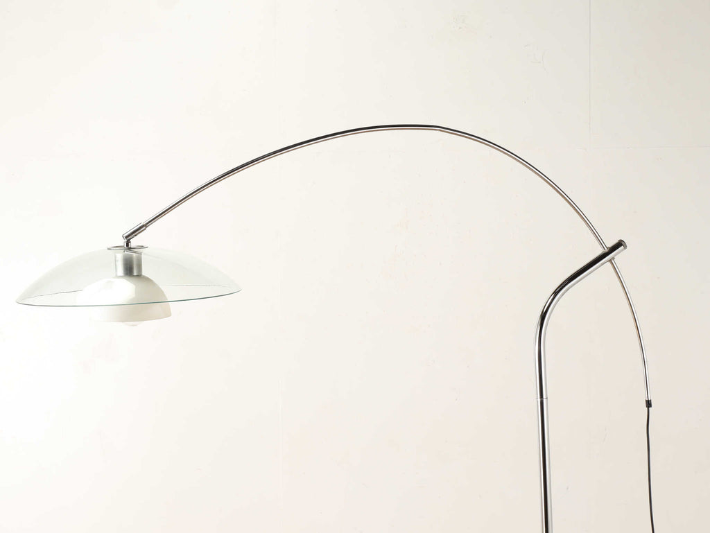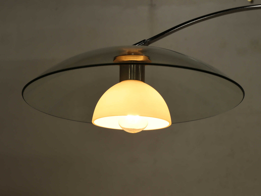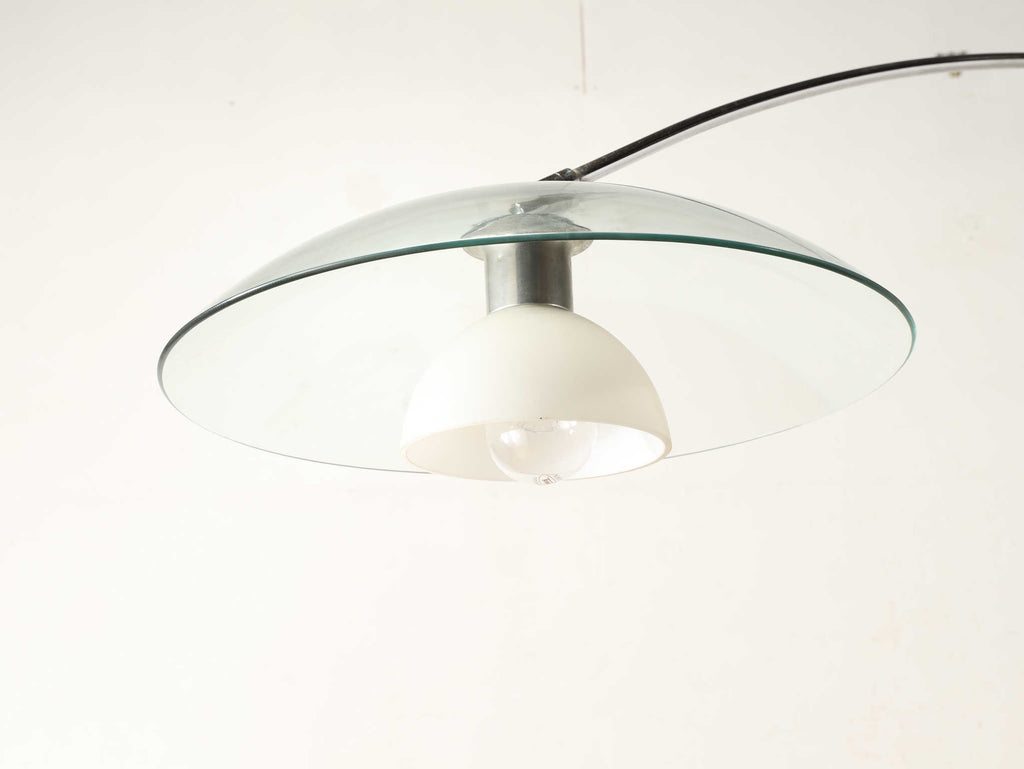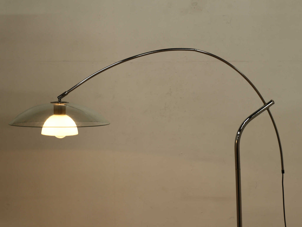 イタリア、1960年代(推定)のアークランプ。アークランプはその名の通り、弧を描くデザインが特徴的です。シーリングランプを取り付けられない場所でも、代わりとなって上から照らしてくれます。シェードは丸くボリューム感のあるものが多い中、こちらはグラスですっきりとしたシルエット。土台のマーブルや、クロムの支柱と相まって、軽やかですっきりとしたデザインとなっております。アンティークはもちろん、現代の家具とも合わせやすい逸品です。
