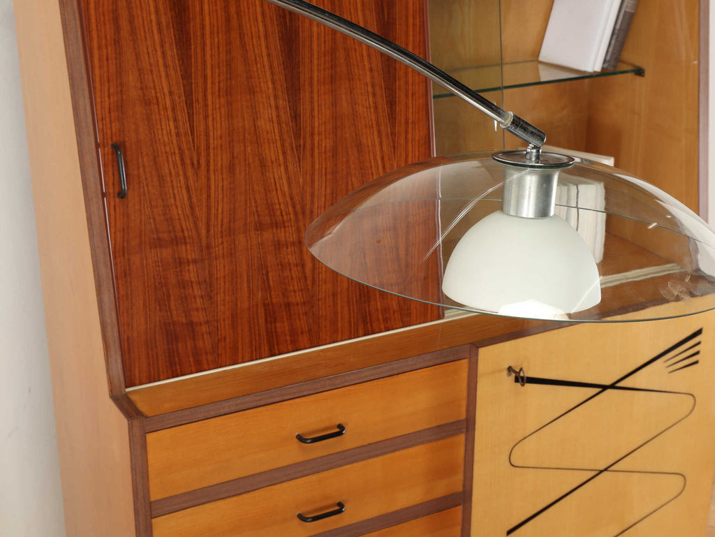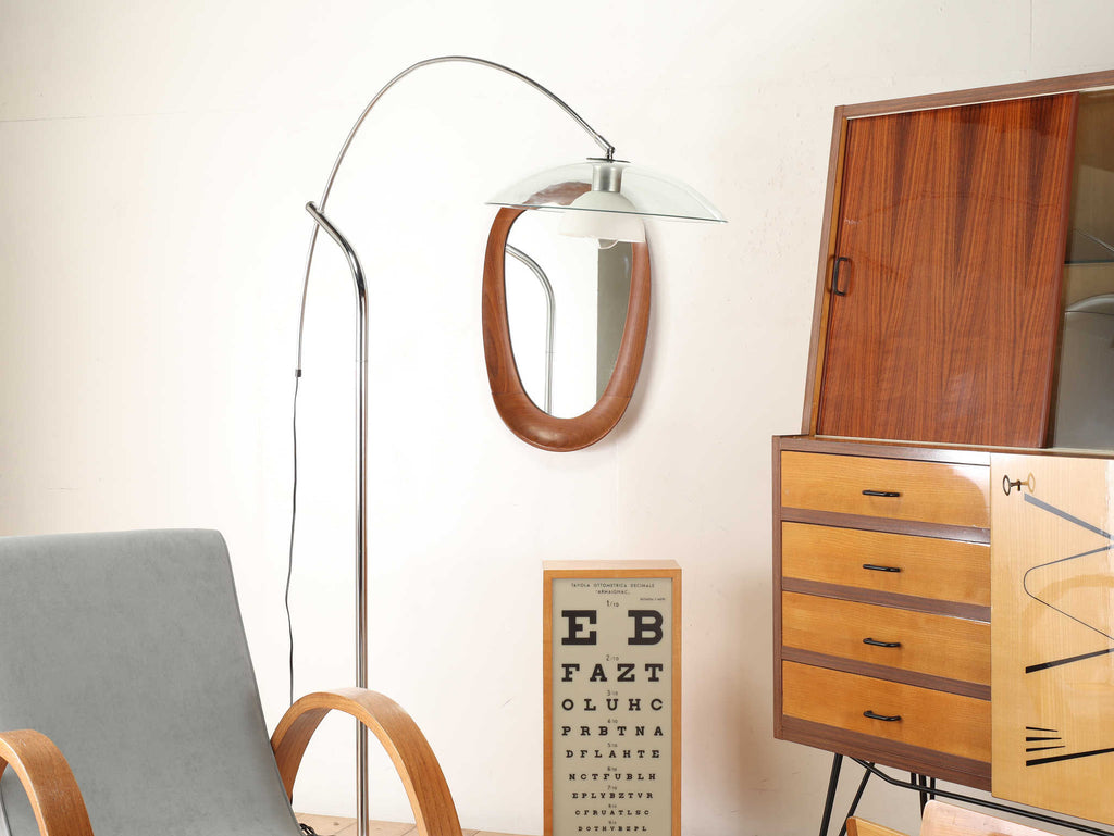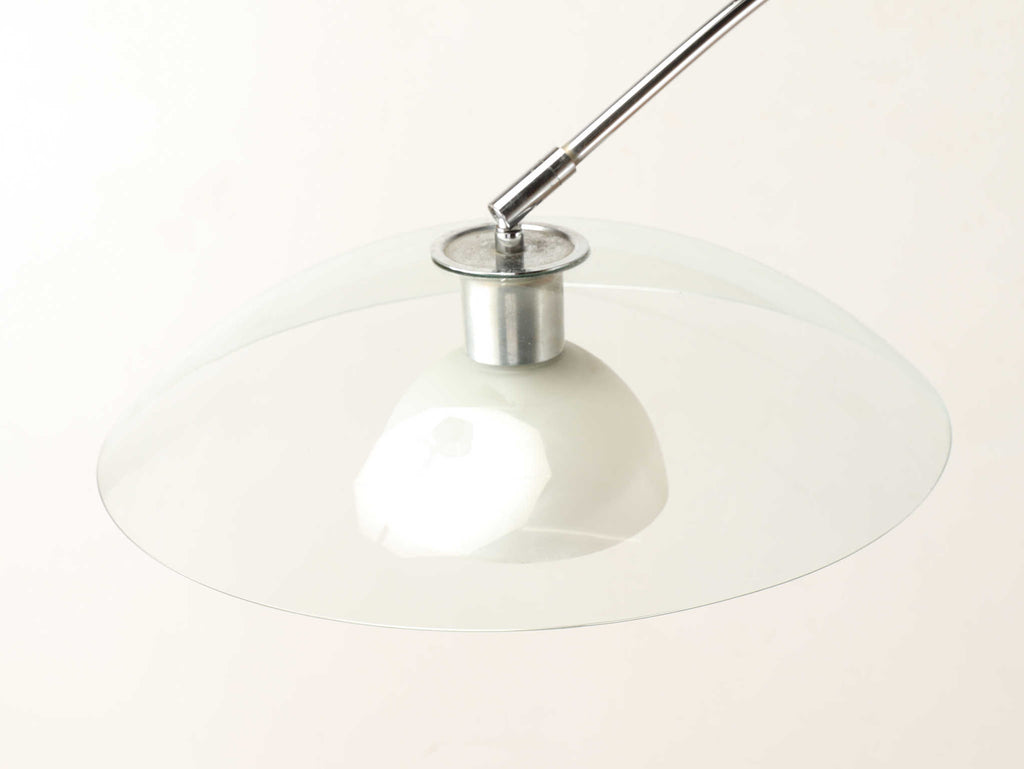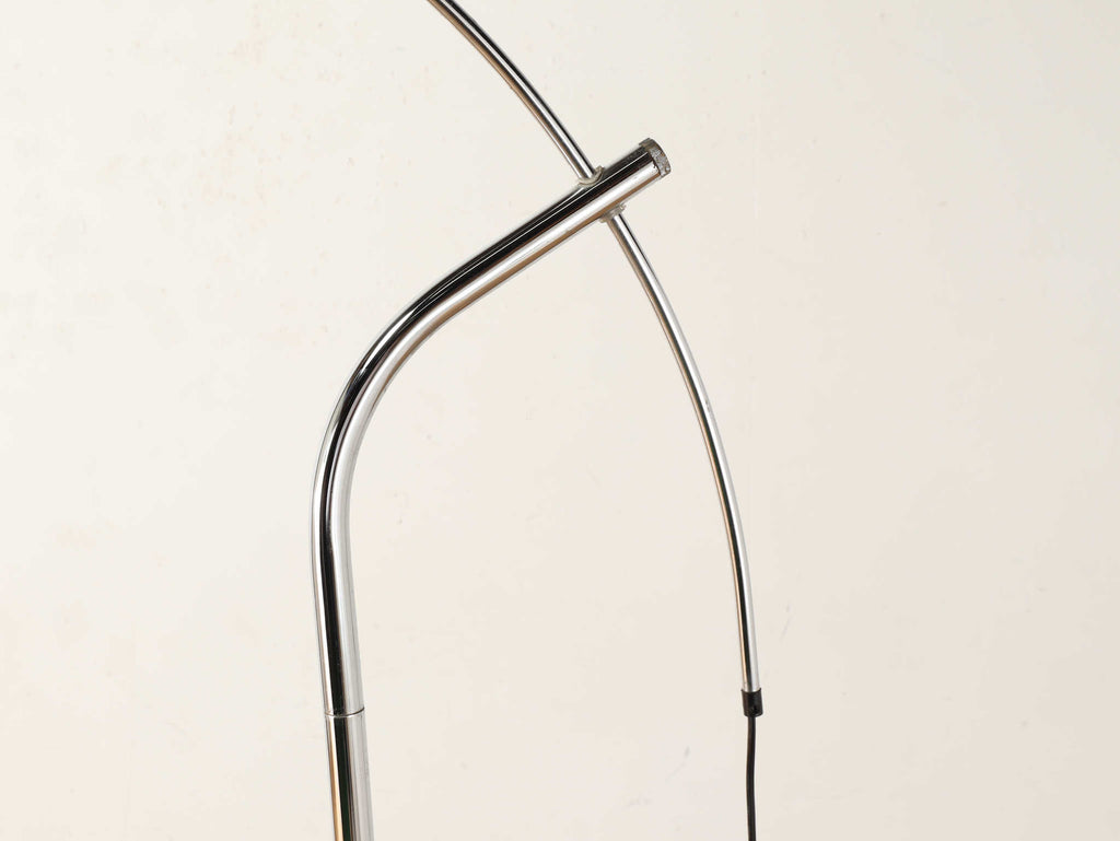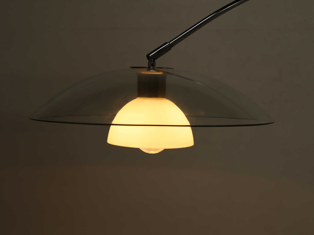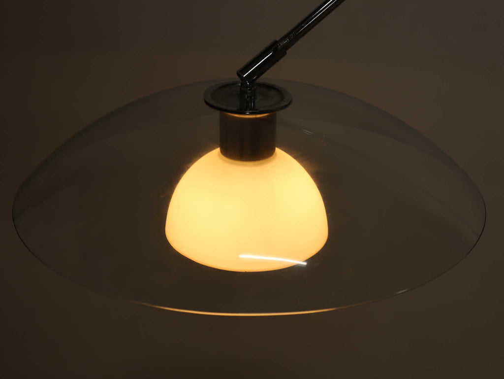 イタリア、1960年代(推定)のアークランプ。アークランプはその名の通り、弧を描くデザインが特徴的です。シーリングランプを取り付けられない場所でも、代わりとなって上から照らしてくれます。シェードは丸くボリューム感のあるものが多い中、こちらはグラスですっきりとしたシルエット。土台のマーブルや、クロムの支柱と相まって、軽やかですっきりとしたデザインとなっております。アンティークはもちろん、現代の家具とも合わせやすい逸品です。