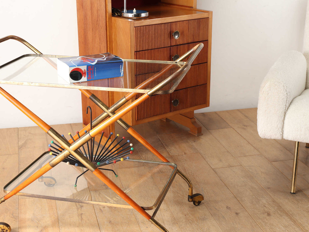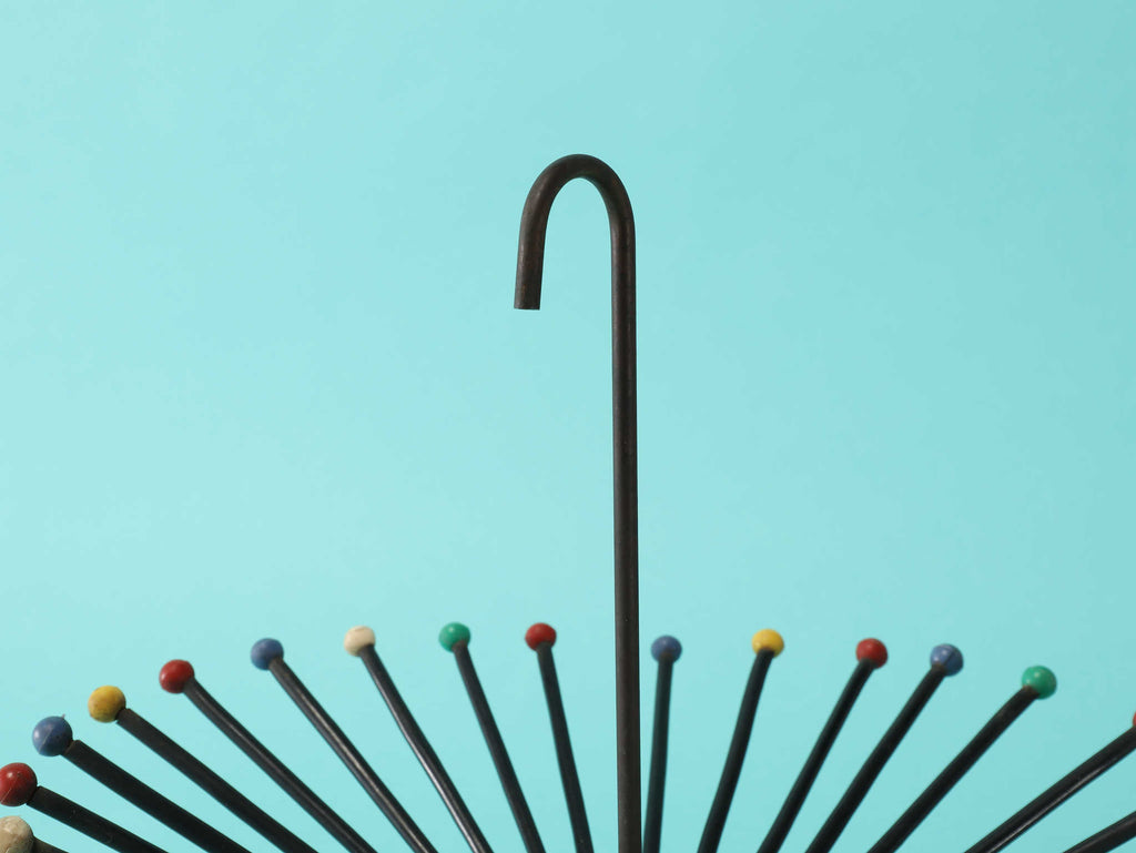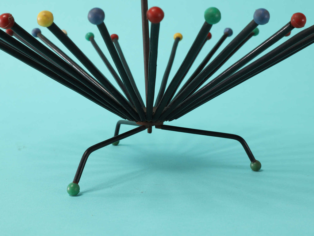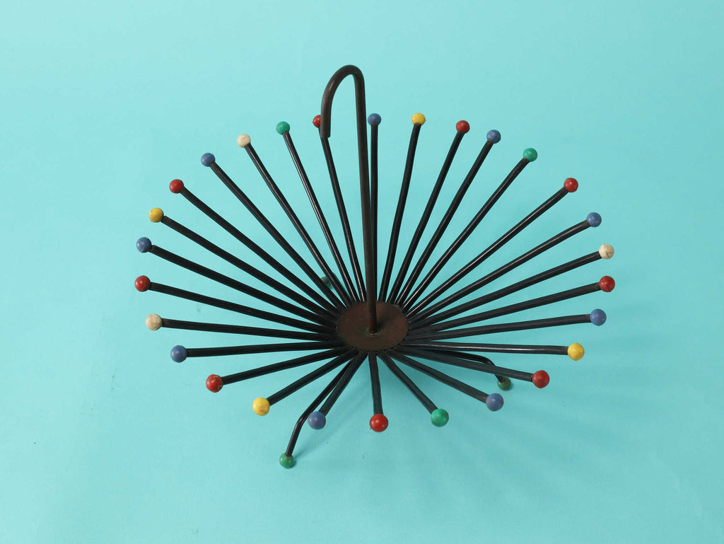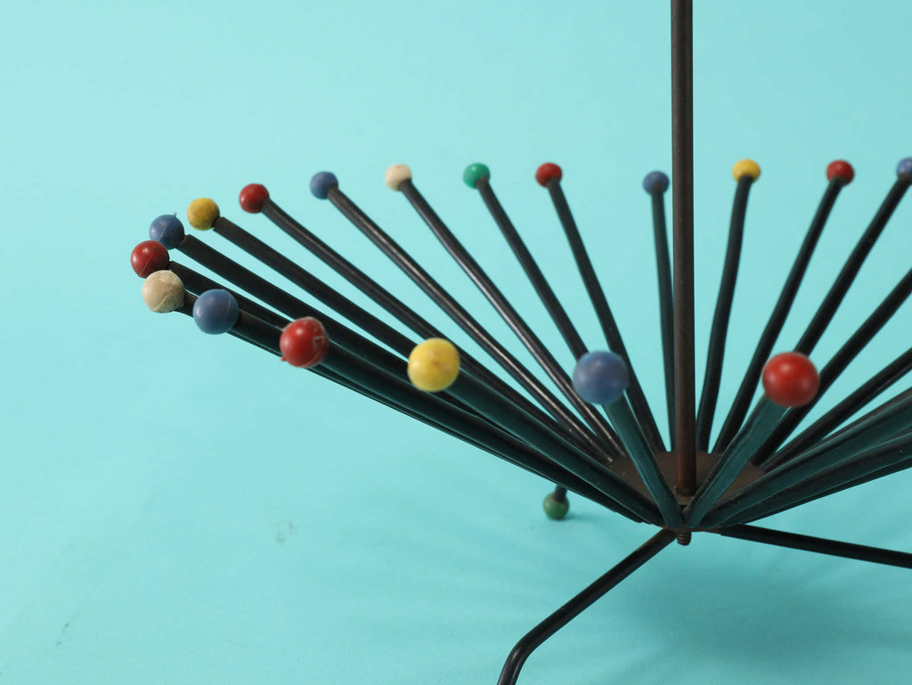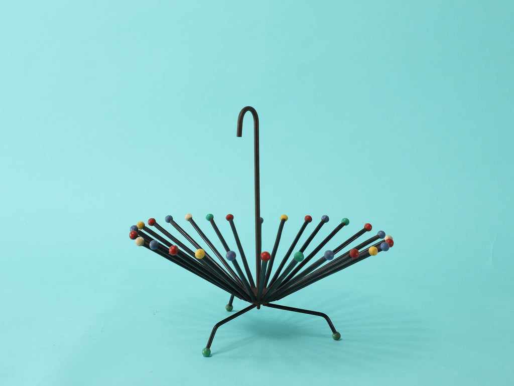 黒いマットなメタルフレームの先端に、カラフルなボールがついたユニークで可愛らしいトレイバスケット。このカラフルなデザインはイームズの「Hang It All」を彷彿とさせるもので、特にミッドセンチュリー期フランスで好まれていたデザインのようです。無駄の無い洗練された構造と遊び心のあるスパイスが小さいながらもお部屋のアクセントとして活躍してくれることでしょう。傘の柄のような可愛い把手も付いてますので、物を置いて自由に移動も容易です。実用的なアクセサリーとして自由な発想でこちらを取り入れて、空間作りをお楽しみください。