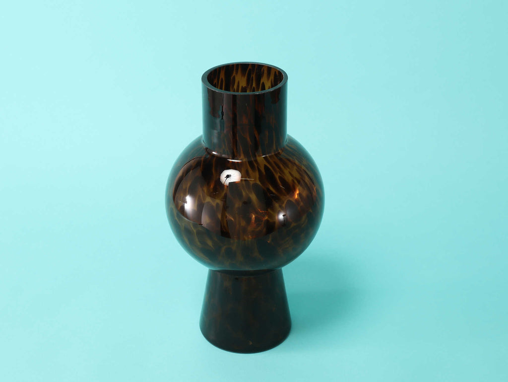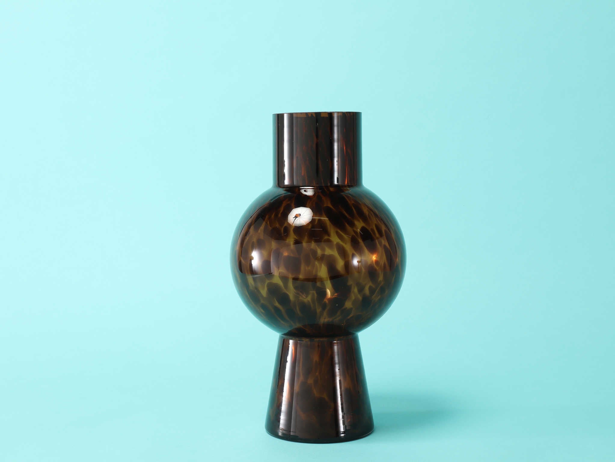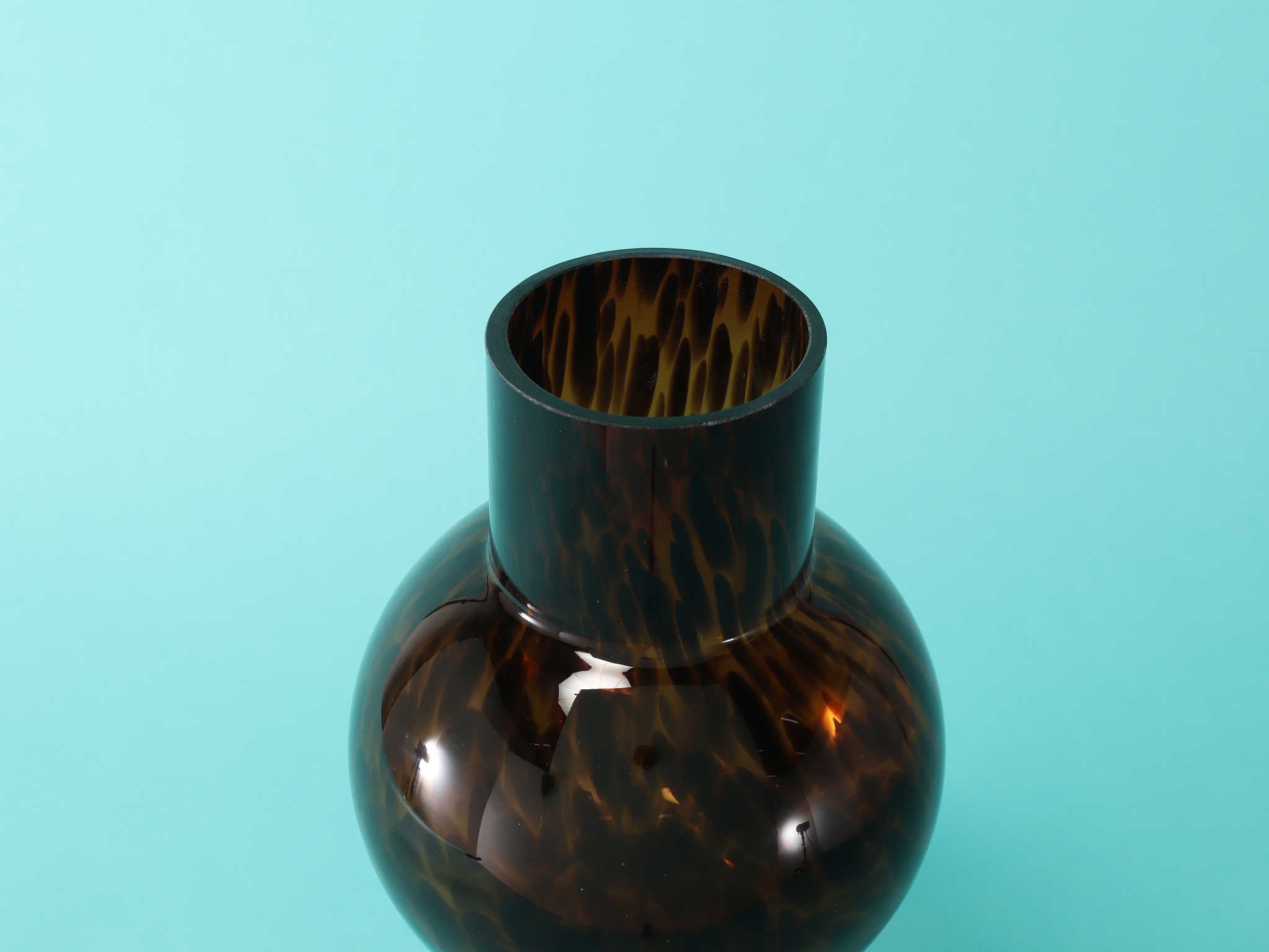 ガラス製の花瓶ですが、べっ甲のような柄と丸みのあるフォルムがインテリアで映えるデザインのため、このまま飾っていただくこともおすすめです。大きさはLとMのサイズ違いがあります。2つ並べていただくと高低差が生まれ、より空間のアクセントとして活躍してくれるアイテムとなります。