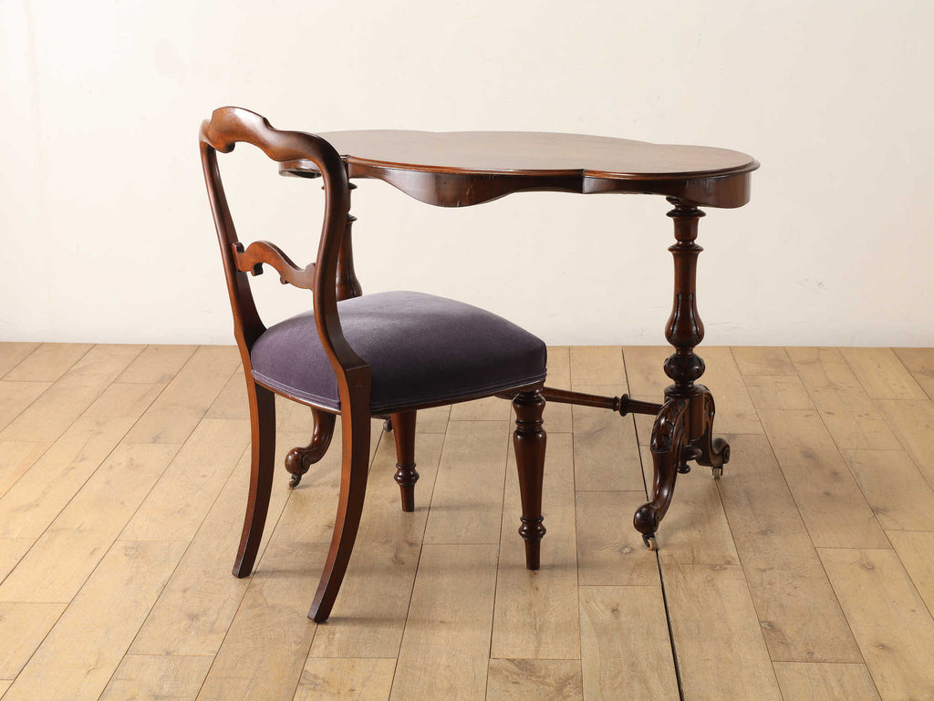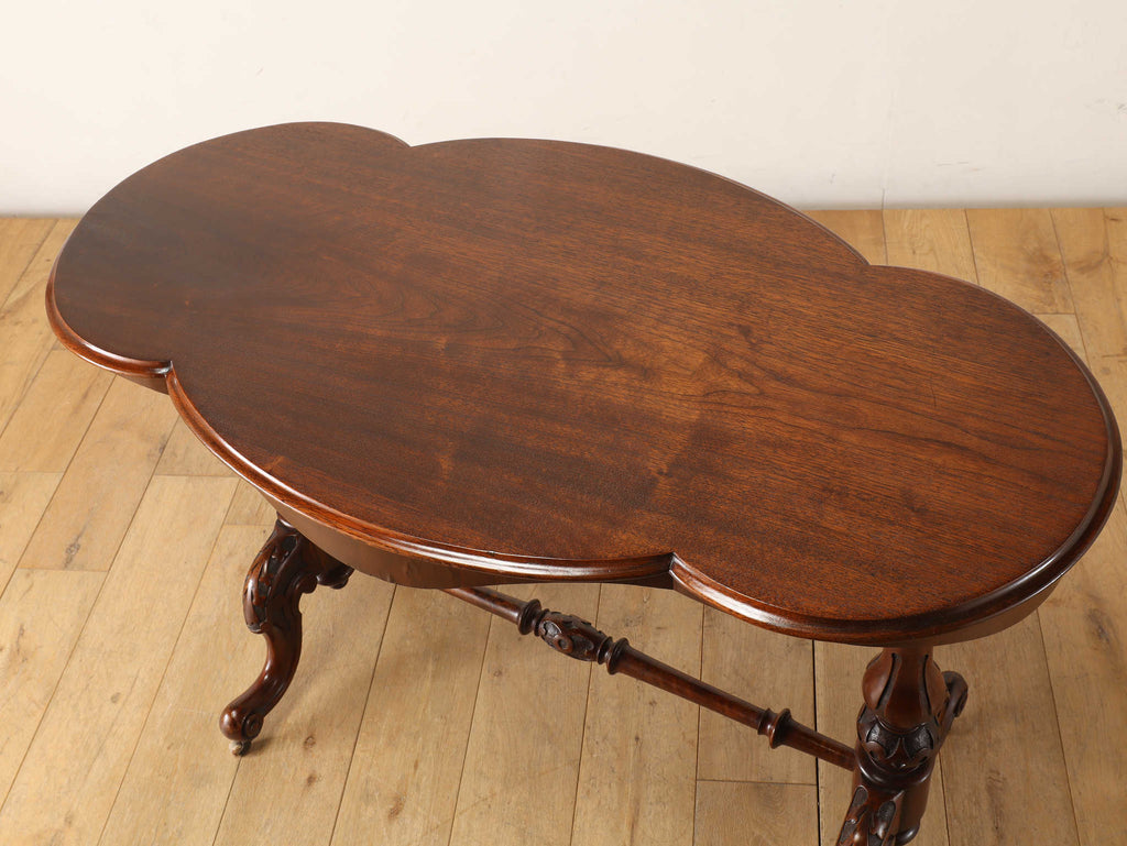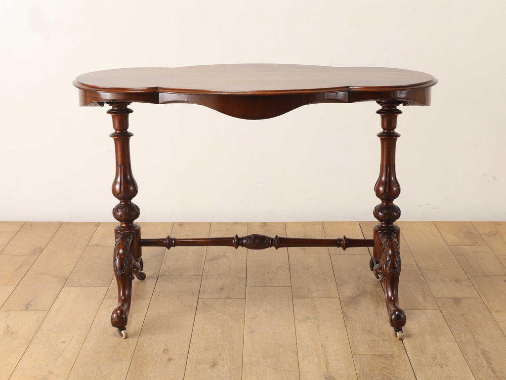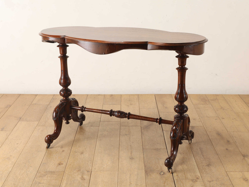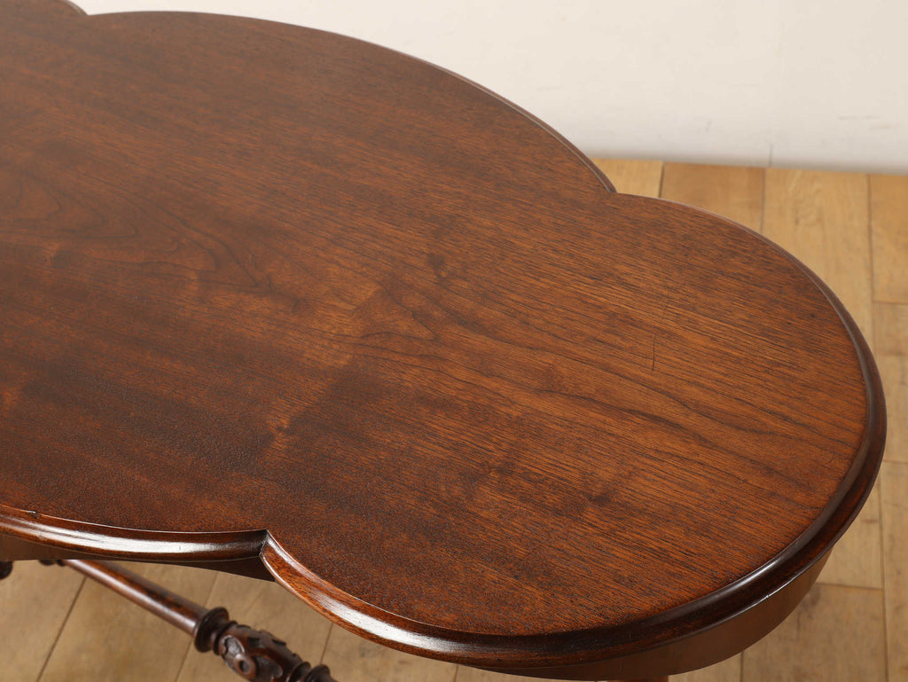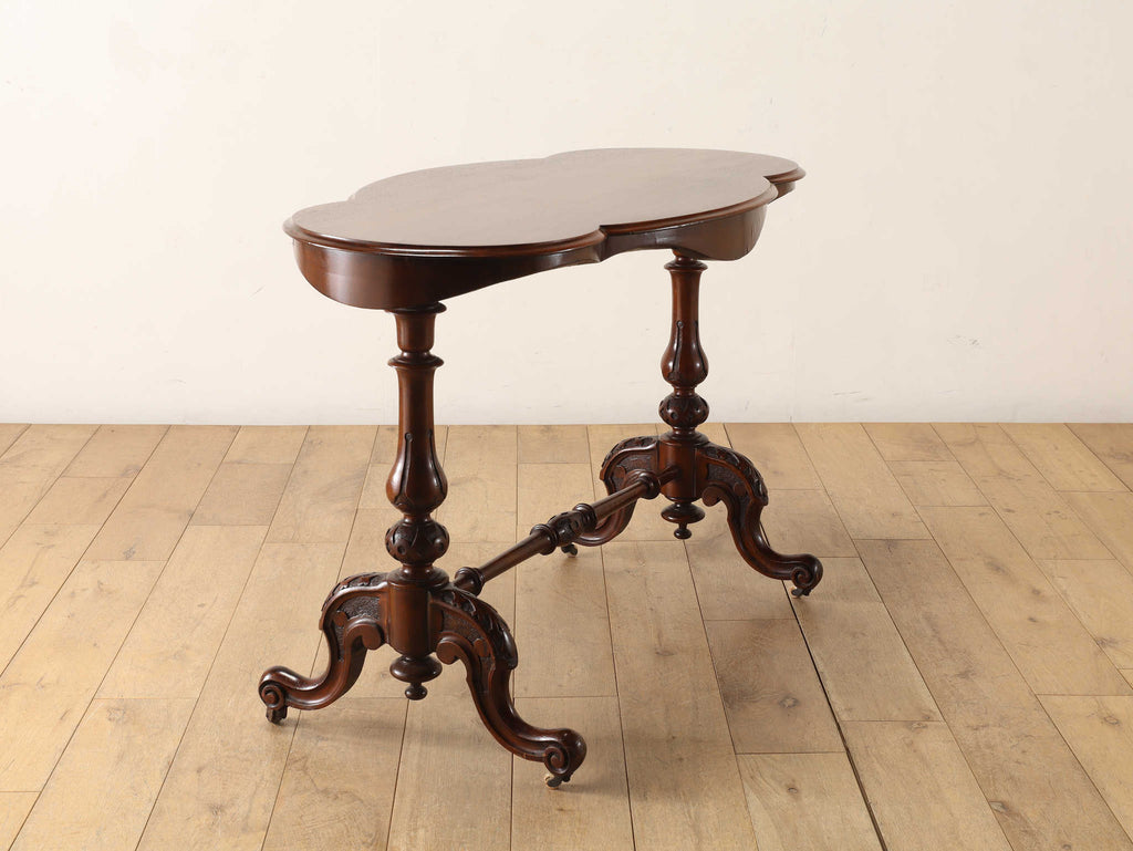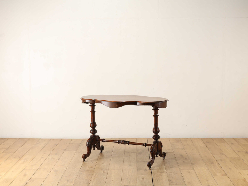 ヴィクトリア時代後期に作製されたと推測される、柔らかなデザインが織りなす曲線美を存分に感じることが出来るテーブルです。この年代のマホガニー材は非常にツヤと質、そして杢目模様が素晴らしく、20世紀から現代までの家具には見られない特有の上品な美しさを感じることができます。雲のようなデザインの天板、その幕板にも波型の躍動感のあるシルエットを見ることができます。2本脚型のすっきりと見えるデザインはお部屋に与える圧迫感が軽減され、重厚な木質でお部屋にアクセントを与えつつも重たい雰囲気にはなりません。特に脚のデザインは非常に立体的で見事な彫刻です。視覚的にも目を引く分、より一層脚の抜け感を感じることが出来るでしょう。猫脚の先にはキャスターが付いており、移動が容易で嬉しいポイントです。壁面にコンソールテーブルとして使用するのも良いですが、空間に置けるデザインであるためソファサイドやバックに置くデスクや飾り台として取り入れてみてはいかがでしょうか。