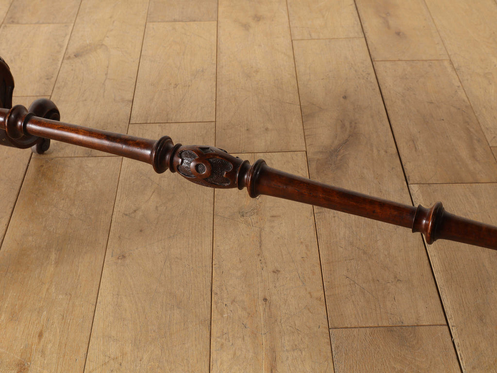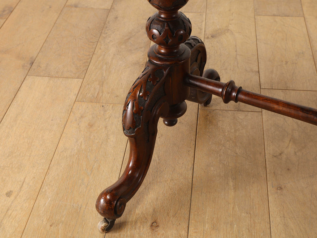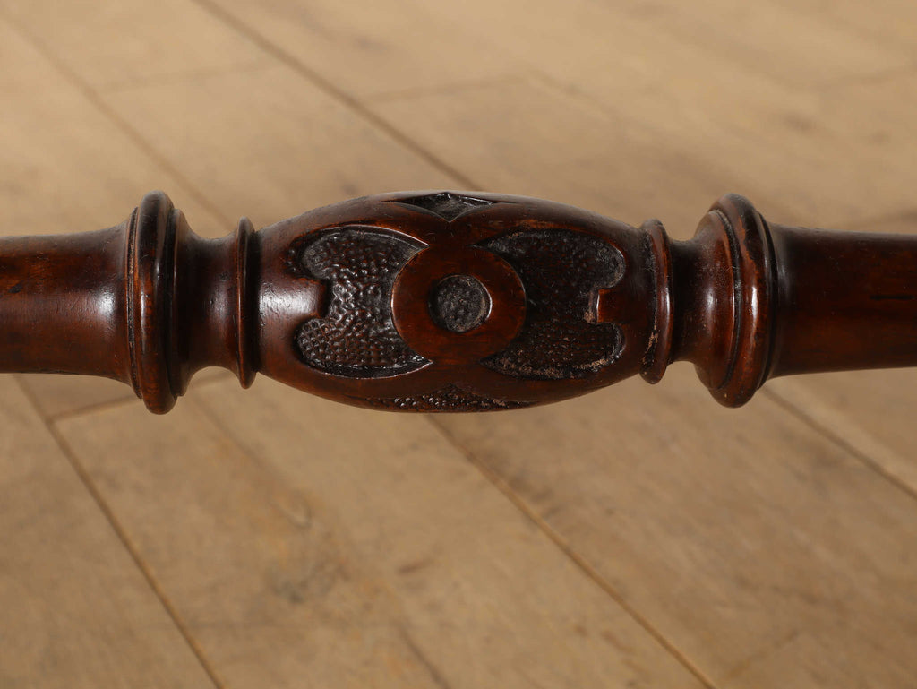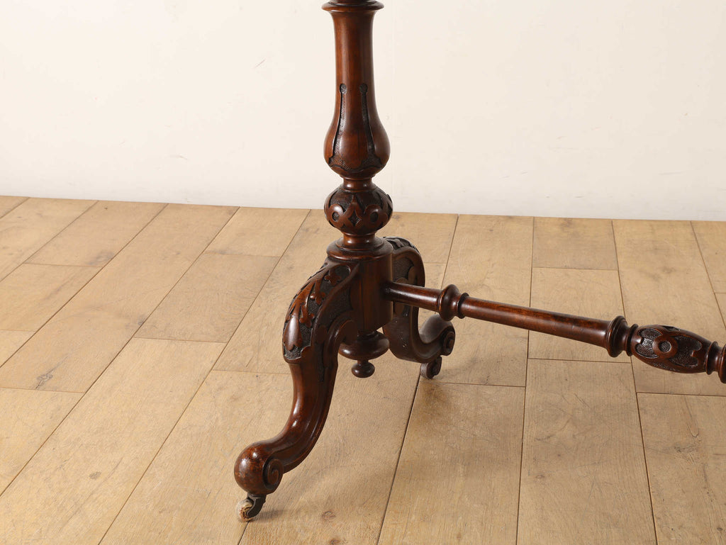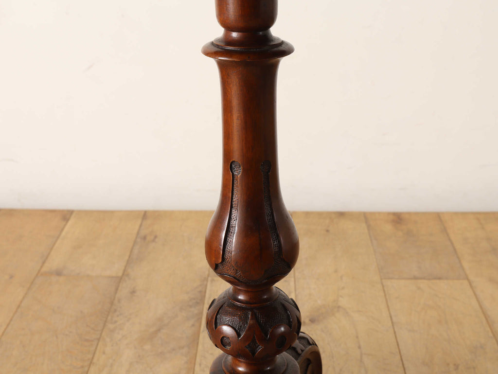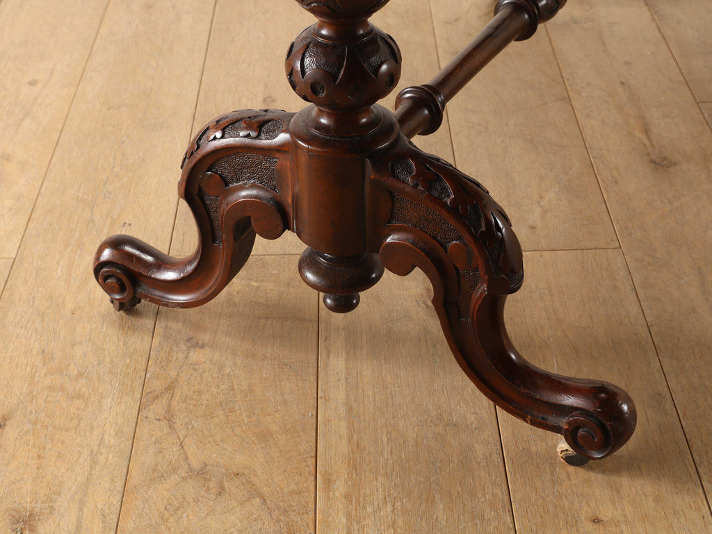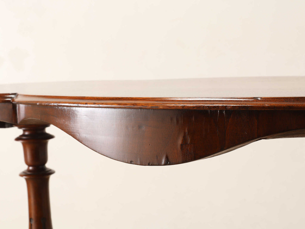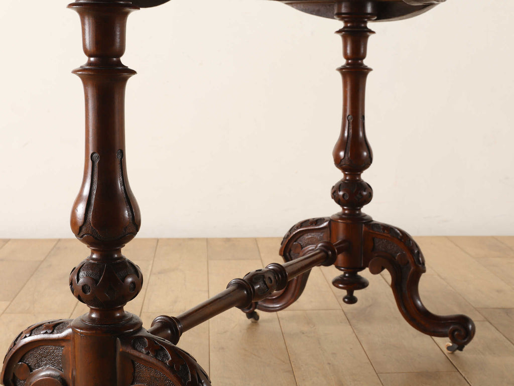 ヴィクトリア時代後期に作製されたと推測される、柔らかなデザインが織りなす曲線美を存分に感じることが出来るテーブルです。この年代のマホガニー材は非常にツヤと質、そして杢目模様が素晴らしく、20世紀から現代までの家具には見られない特有の上品な美しさを感じることができます。雲のようなデザインの天板、その幕板にも波型の躍動感のあるシルエットを見ることができます。2本脚型のすっきりと見えるデザインはお部屋に与える圧迫感が軽減され、重厚な木質でお部屋にアクセントを与えつつも重たい雰囲気にはなりません。特に脚のデザインは非常に立体的で見事な彫刻です。視覚的にも目を引く分、より一層脚の抜け感を感じることが出来るでしょう。猫脚の先にはキャスターが付いており、移動が容易で嬉しいポイントです。壁面にコンソールテーブルとして使用するのも良いですが、空間に置けるデザインであるためソファサイドやバックに置くデスクや飾り台として取り入れてみてはいかがでしょうか。