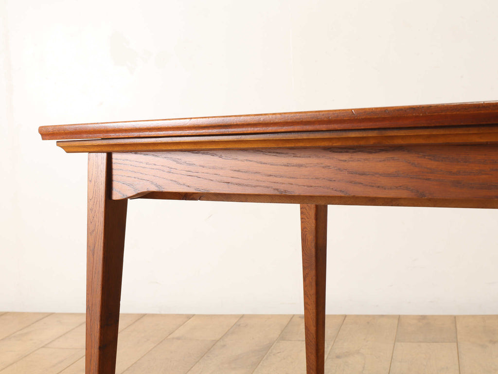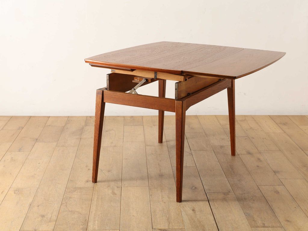 およそ1960年代に作られた、昇降機能の付いたエレベーターテーブル。通常は、ソファに座って使用するコーヒーテーブルとして。天板を上げる事で通常のダイニングレベルの高さに調整して使うことができます。チーク材は耐久性が高く、美しい木目と温かみのある色合いが特徴で、時間と共に深い色合いに変化を楽しむことができるでしょう。1960年代のオリジナルのエレベーターテーブルは非常に希少であり、高い評価を受けています。特にチーク材を使用したものは価値が高く、魅力的なアイテムとなっています。
