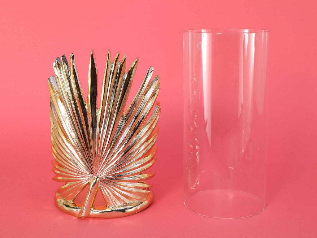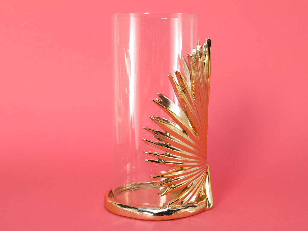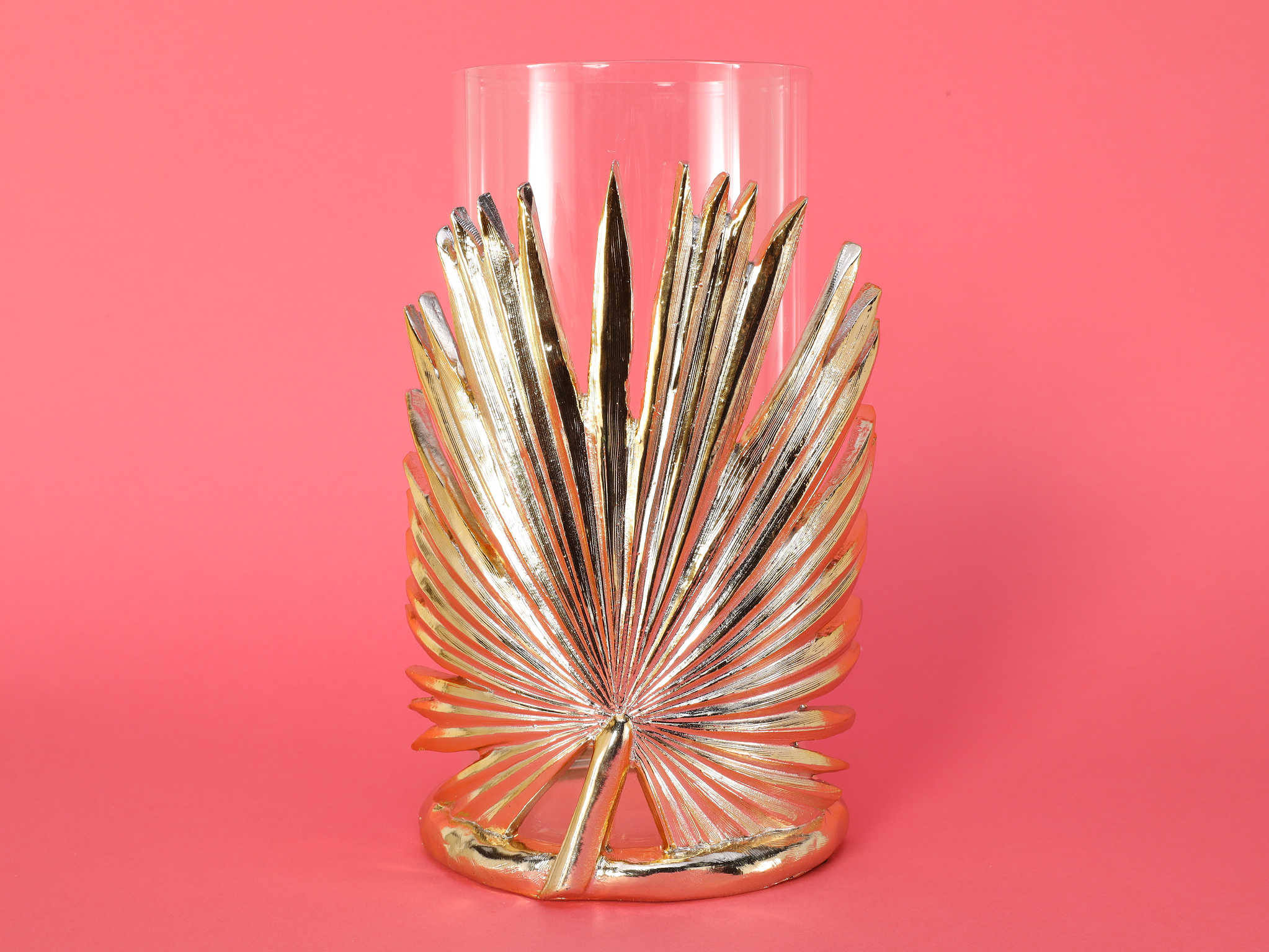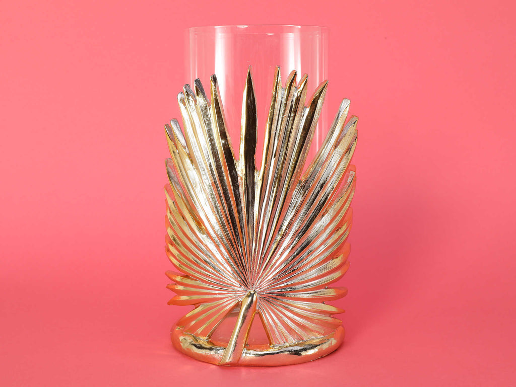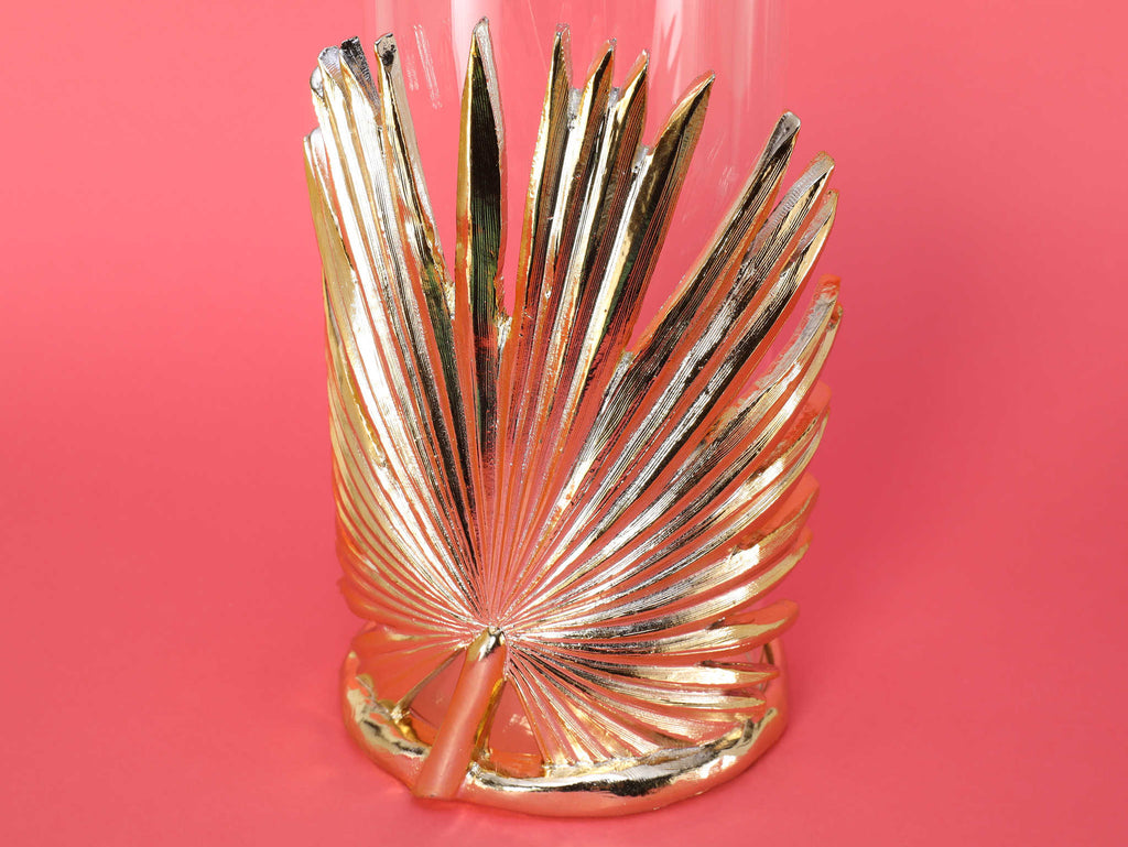 ヤシの葉をモチーフにした装飾が印象的な、パームキャンドルホルダー。ガラスの透明感に、ゴールドカラーのリーフが立体的にあしらわれ、灯りをともすと陰影が美しく浮かび上がります。炎の揺らぎが葉の間を通して広がり、空間に柔らかなリズムと温もりを添えてくれます。テーブルコーディネートの主役としてはもちろん、サイドボードやキャビネットの上に置けば、昼と夜で異なる表情を楽しめるのも魅力。季節を問わず取り入れやすく、日常のひとときを少し特別に演出してくれるキャンドルホルダーです。