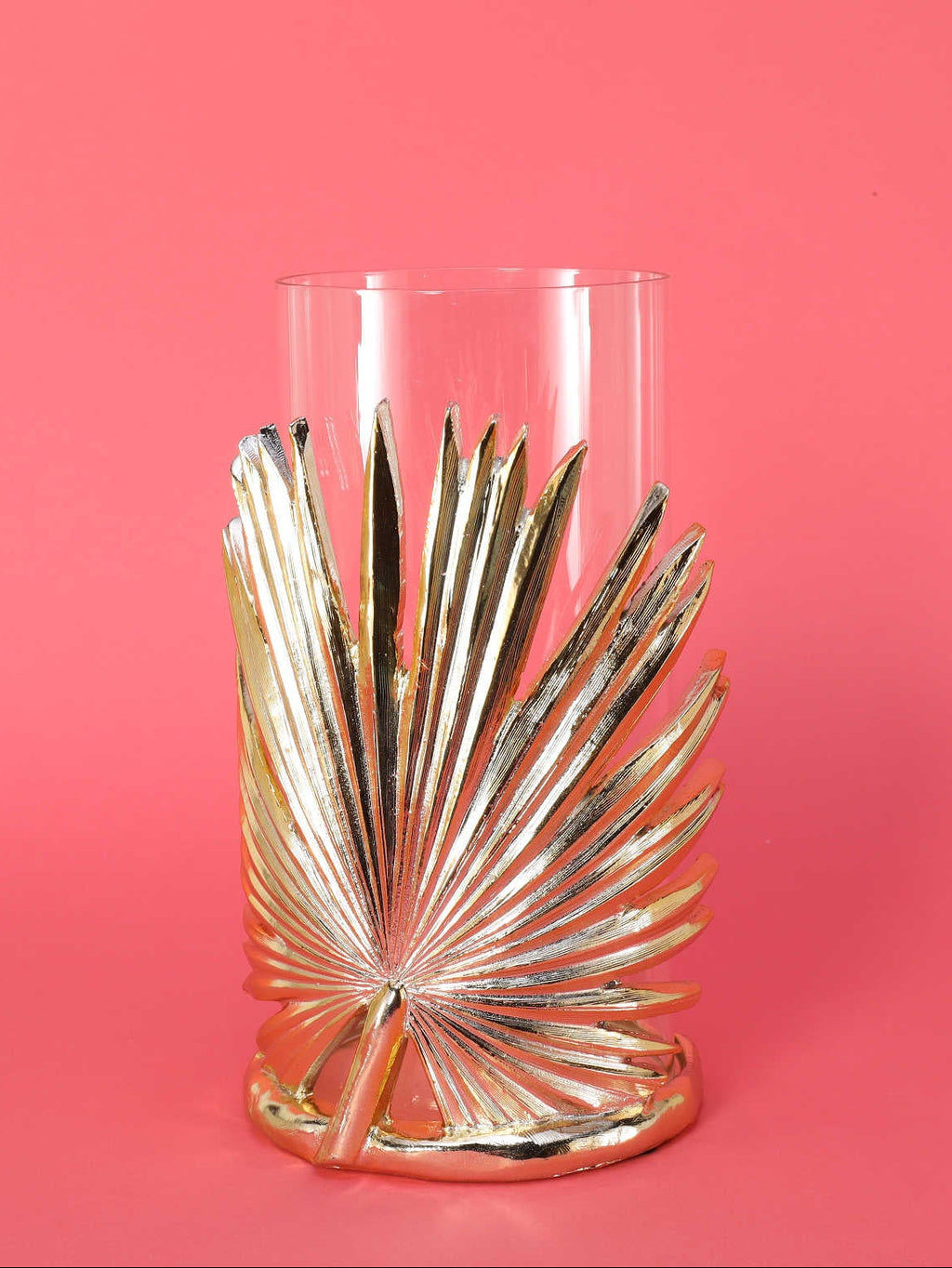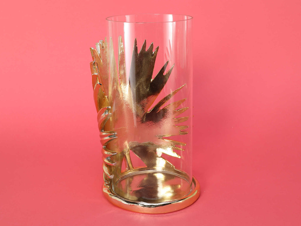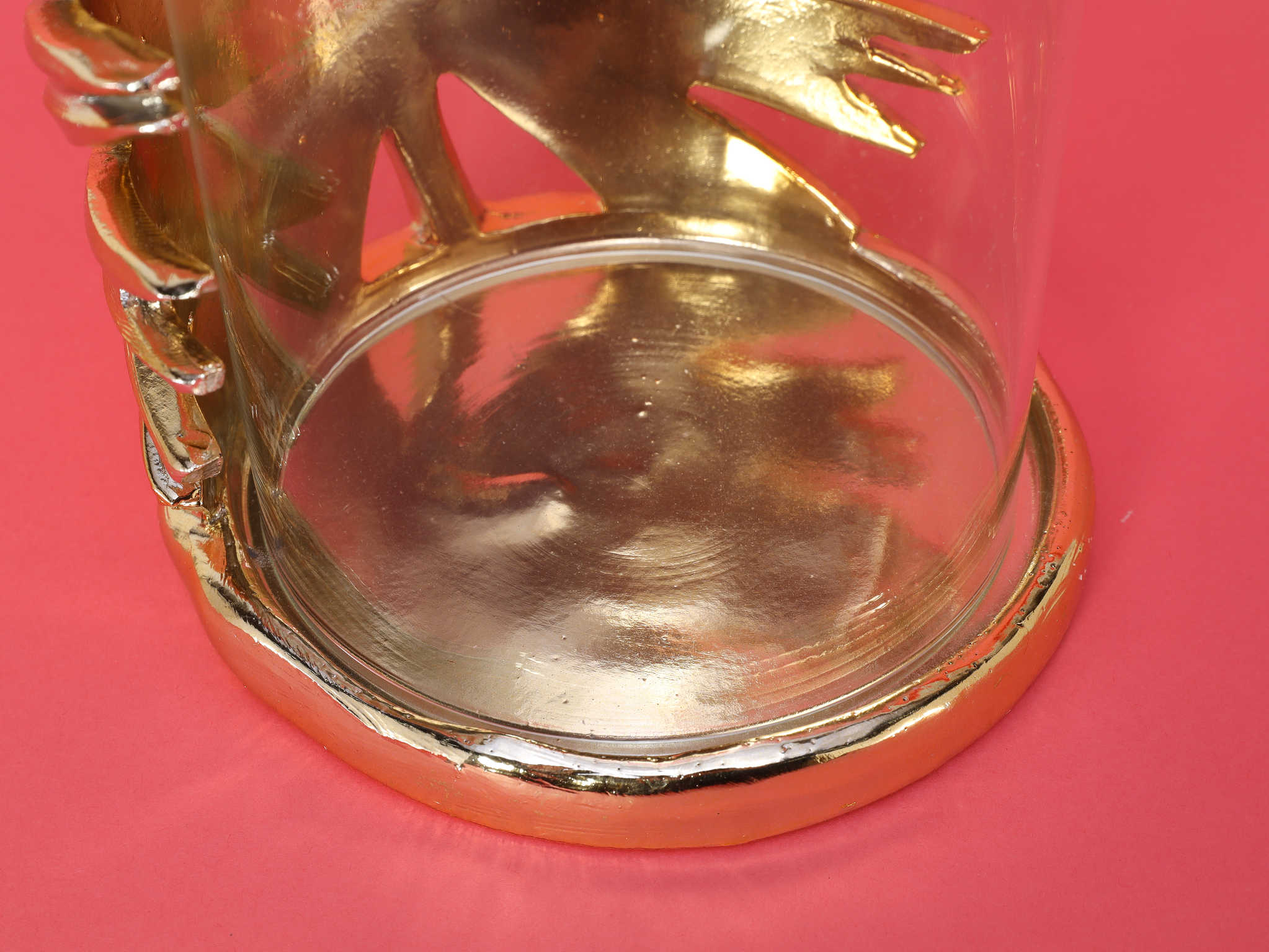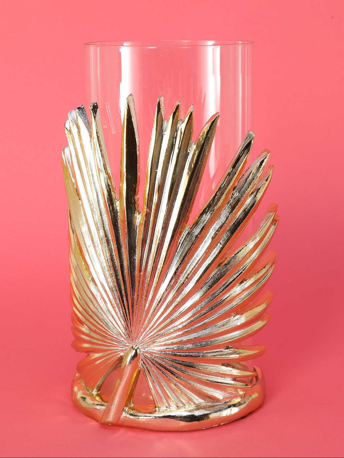 ヤシの葉をモチーフにした装飾が印象的な、パームキャンドルホルダー。ガラスの透明感に、ゴールドカラーのリーフが立体的にあしらわれ、灯りをともすと陰影が美しく浮かび上がります。炎の揺らぎが葉の間を通して広がり、空間に柔らかなリズムと温もりを添えてくれます。テーブルコーディネートの主役としてはもちろん、サイドボードやキャビネットの上に置けば、昼と夜で異なる表情を楽しめるのも魅力。季節を問わず取り入れやすく、日常のひとときを少し特別に演出してくれるキャンドルホルダーです。