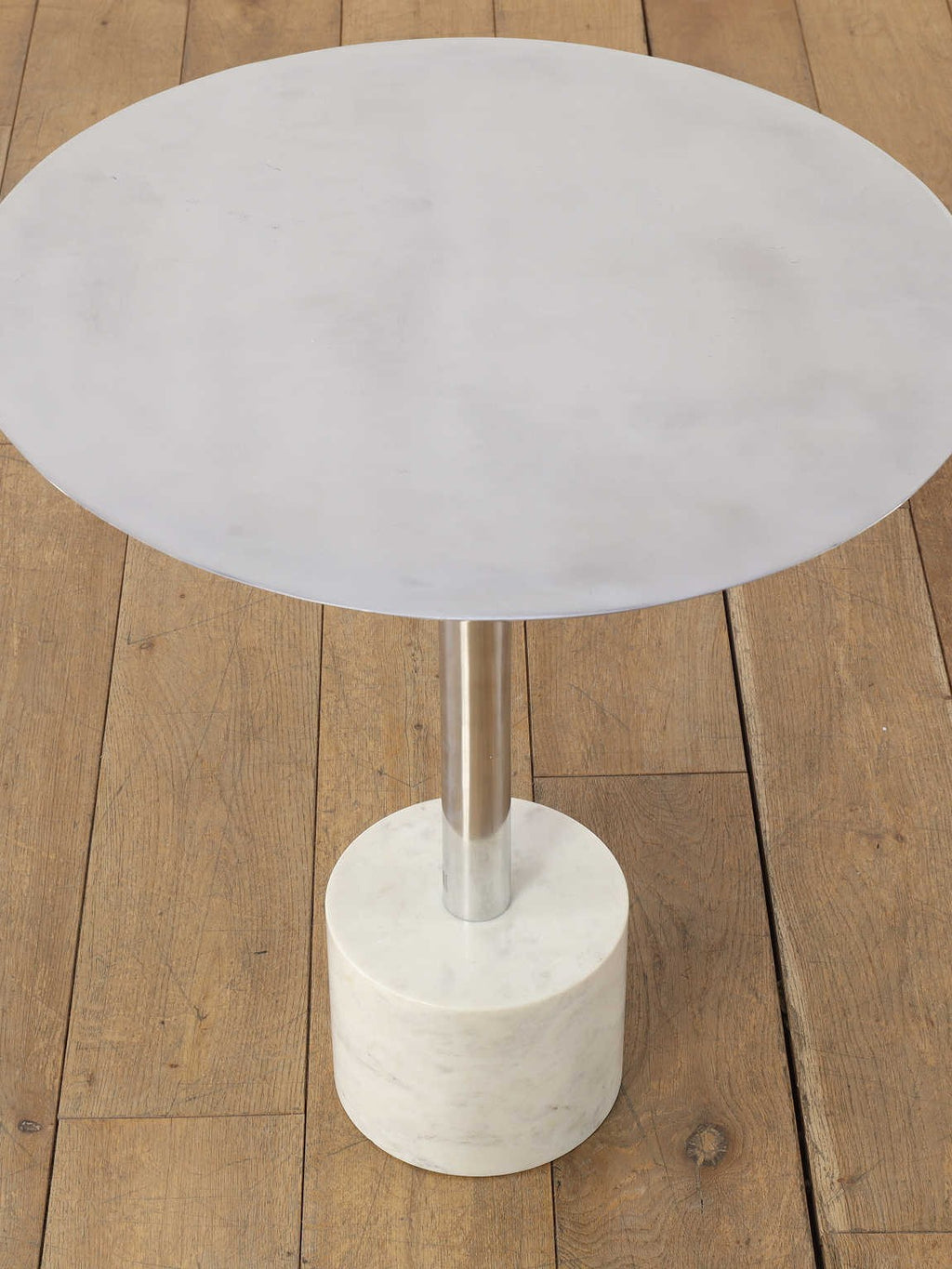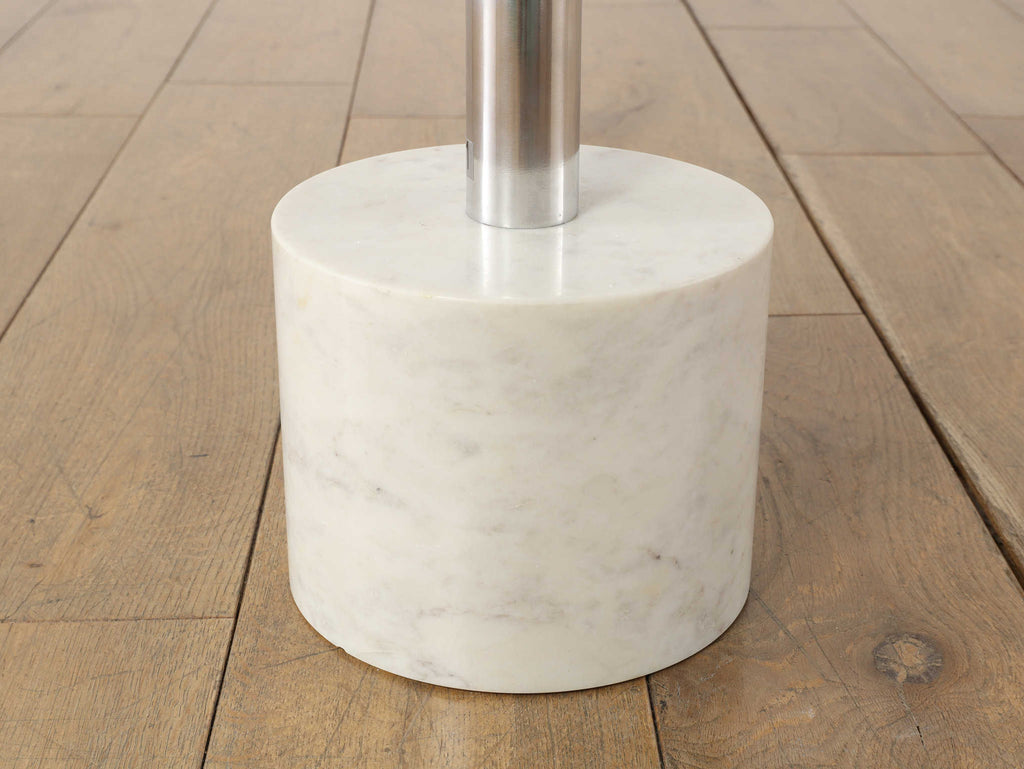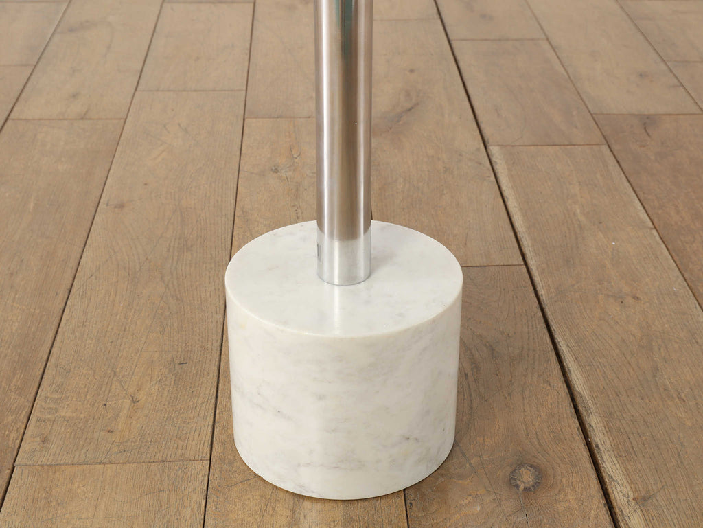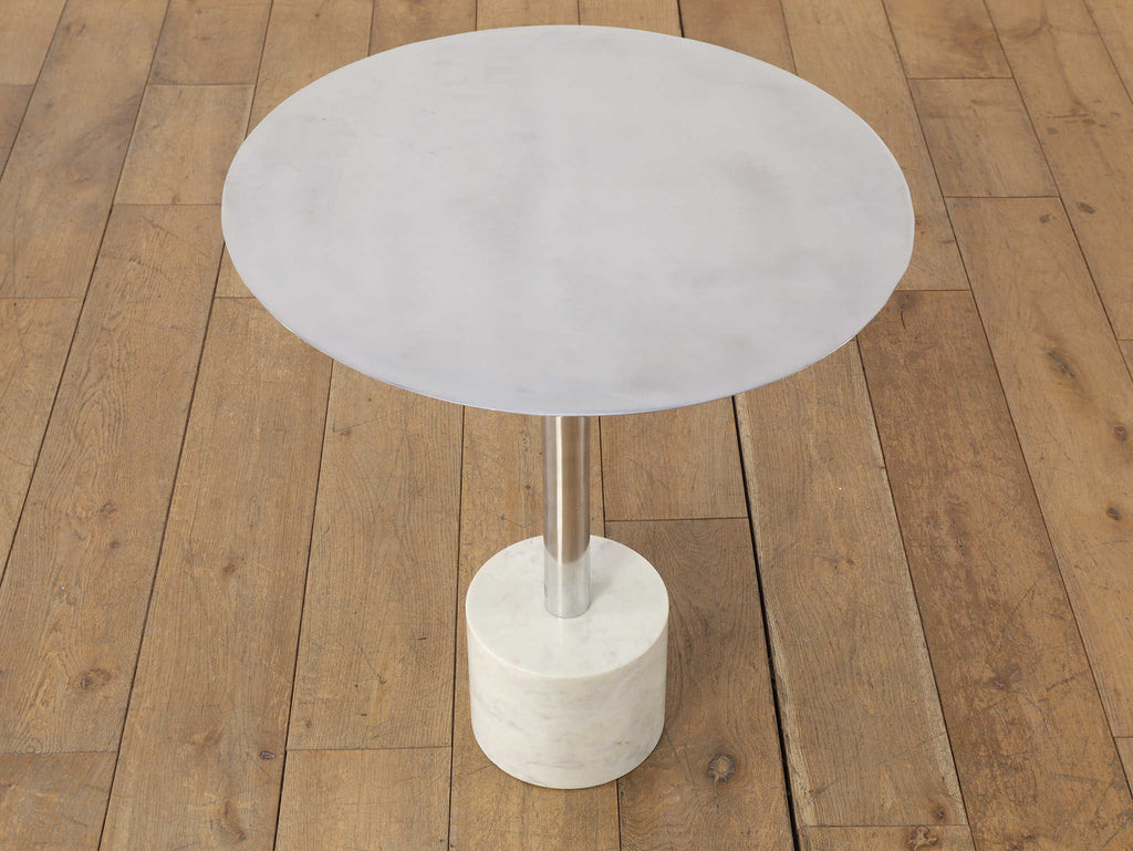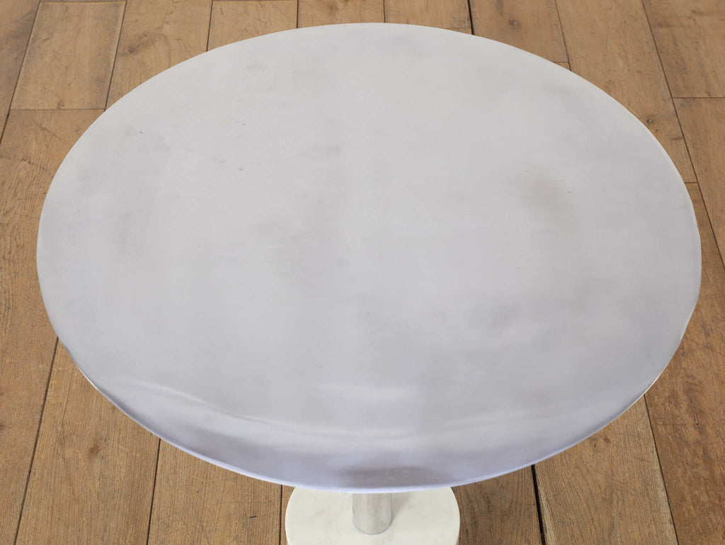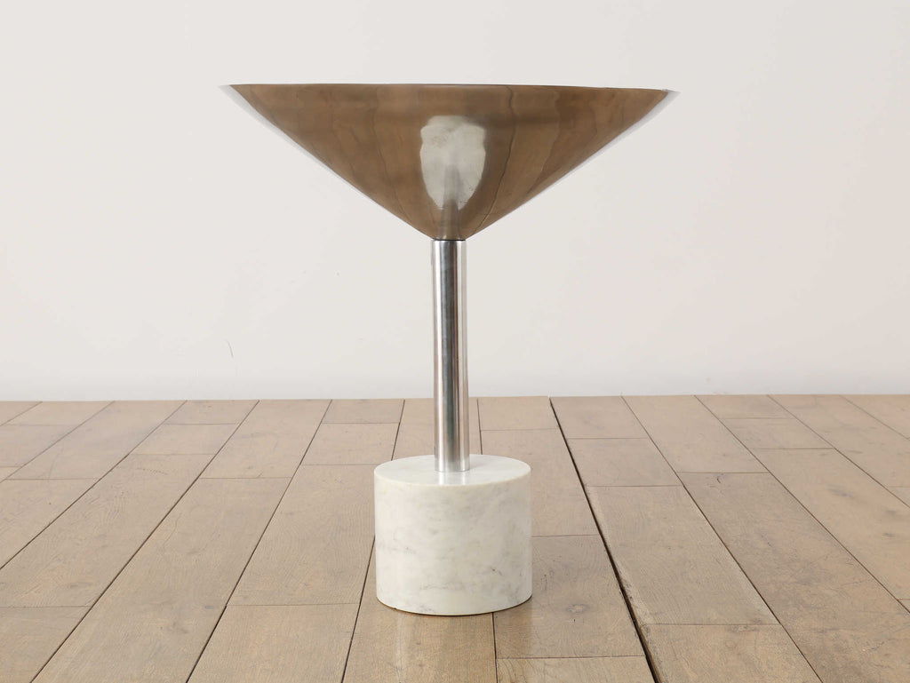 シャープなフォルムと素材の対比が美しい、コーンサイドテーブル。軽やかなアルミ天板と、安定感のあるストーン素材の土台を組み合わせることで、ミニマルでありながら印象に残る佇まいに仕上げられています。すっきりとした一本脚のデザインは空間を圧迫せず、ソファ脇やラウンジチェアの横にも自然に馴染みます。クールな金属の質感に、石の持つ穏やかな表情が加わり、モダンな中にも落ち着きのある雰囲気を演出。日常使いはもちろん、オブジェ感覚で空間にアクセントを加えたい方にもおすすめの一台です。