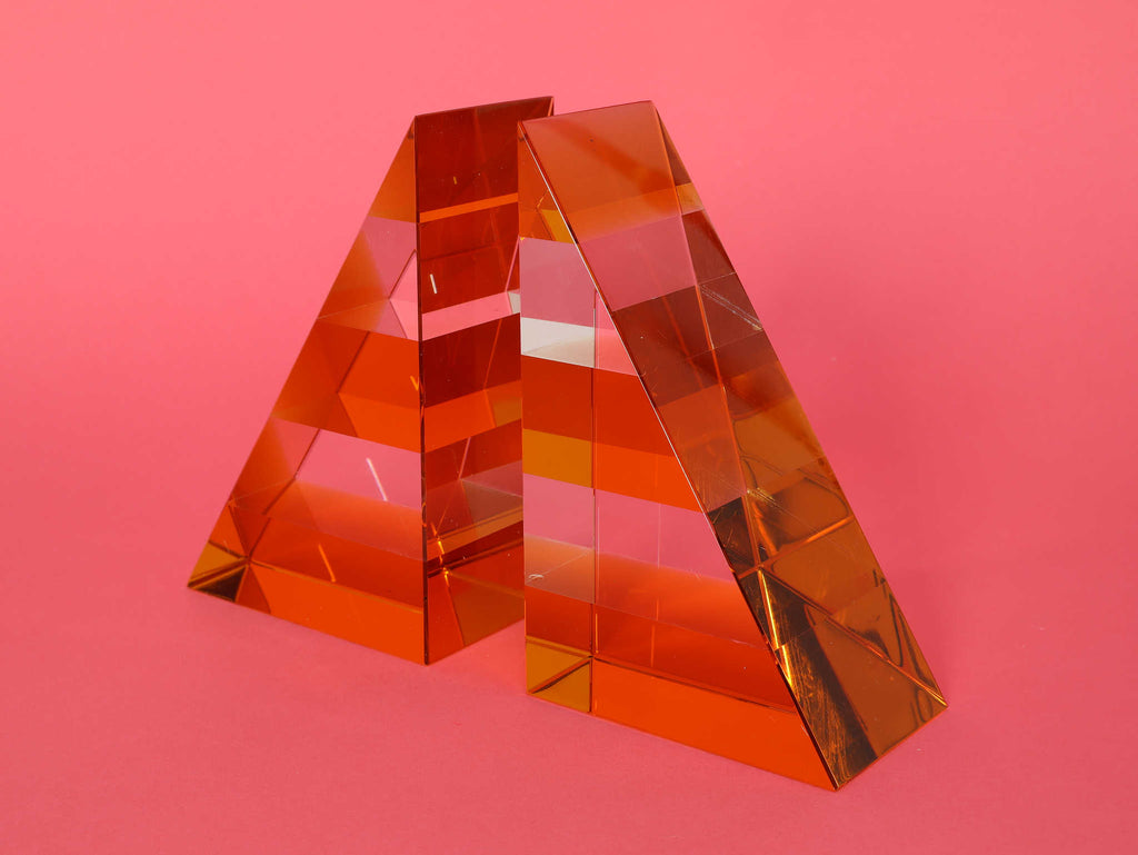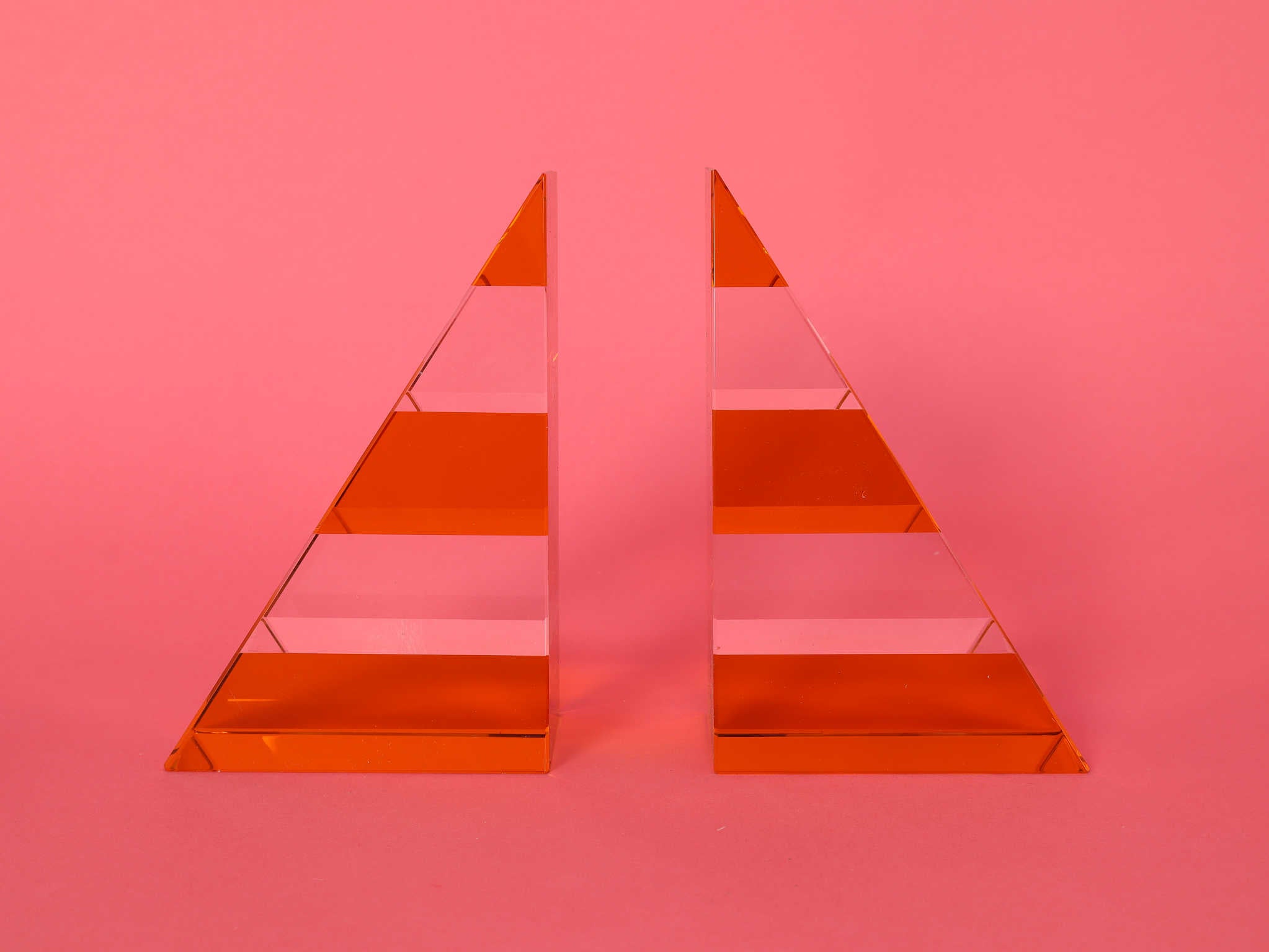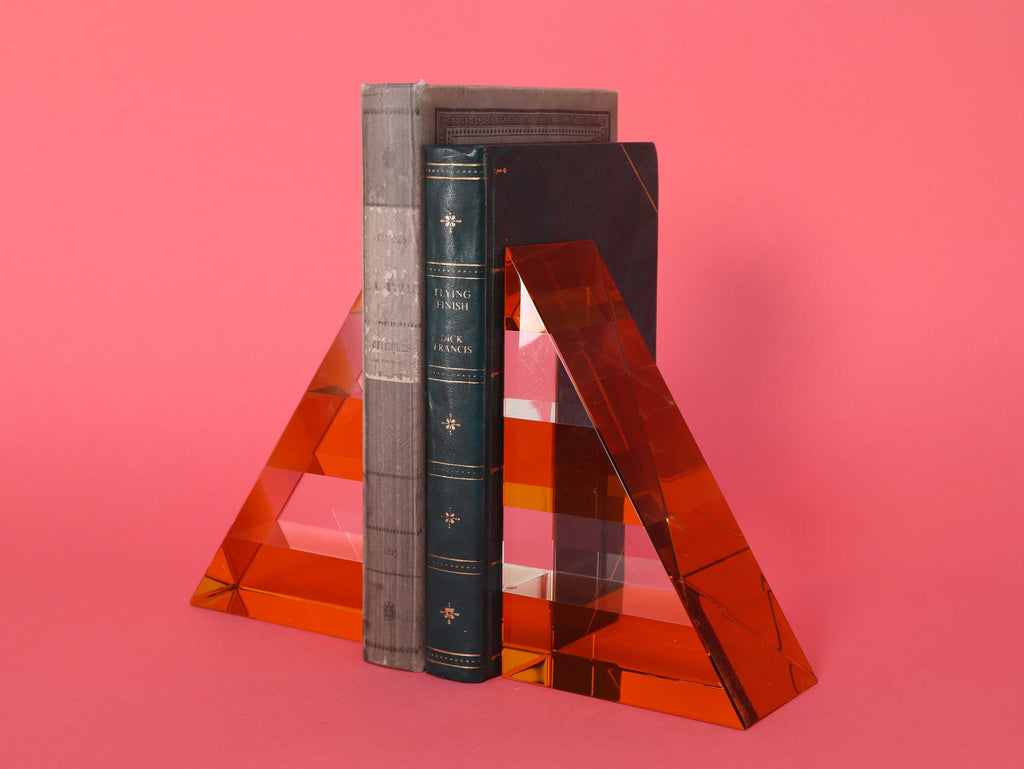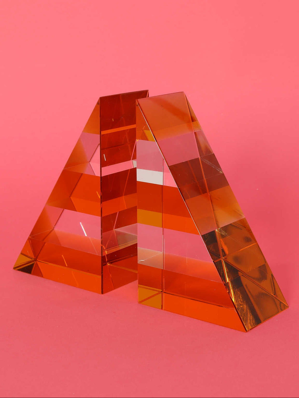 鮮やかなオレンジのラインが目を引く、グラス製ブックエンド。透明感のあるガラスにリズミカルな配色が施され、光を受けることで色の濃淡や奥行きが美しく浮かび上がります。シンプルな三角フォルムは本をしっかりと支えながら、オブジェのように空間に彩りを添える存在。書斎やリビングの棚、デスク周りに取り入れれば、落ち着いた空間に程よい遊び心と明るさを加えてくれます。モダンからヴィンテージまで幅広いインテリアに調和し、日常の景色を軽やかに引き立てるブックエンドです。