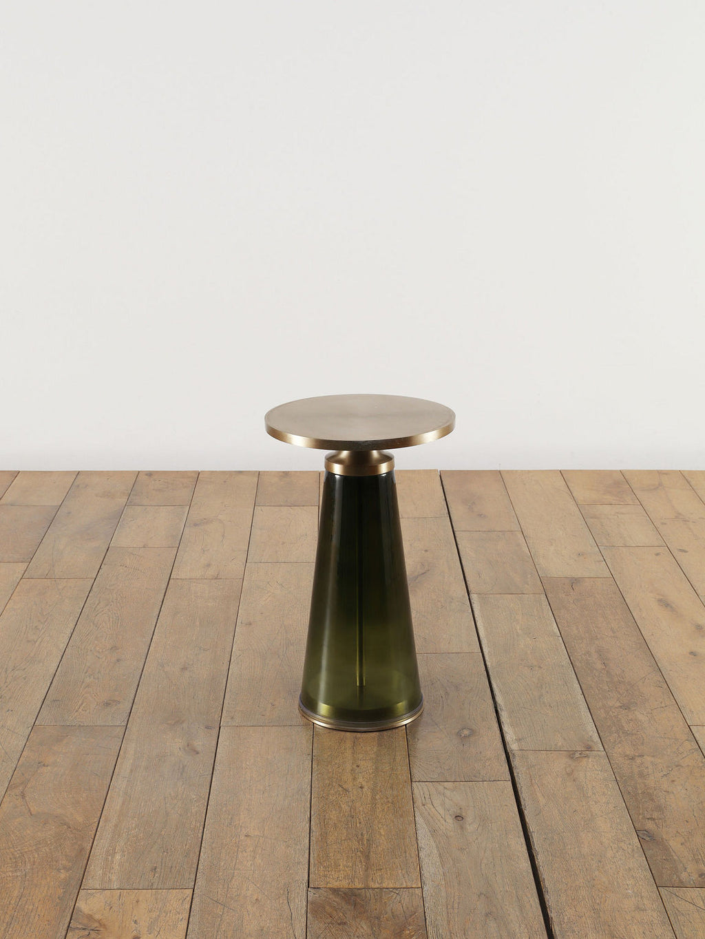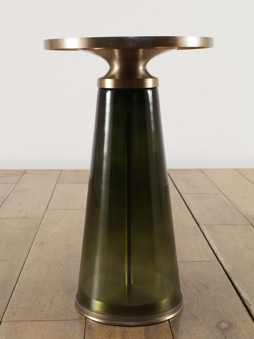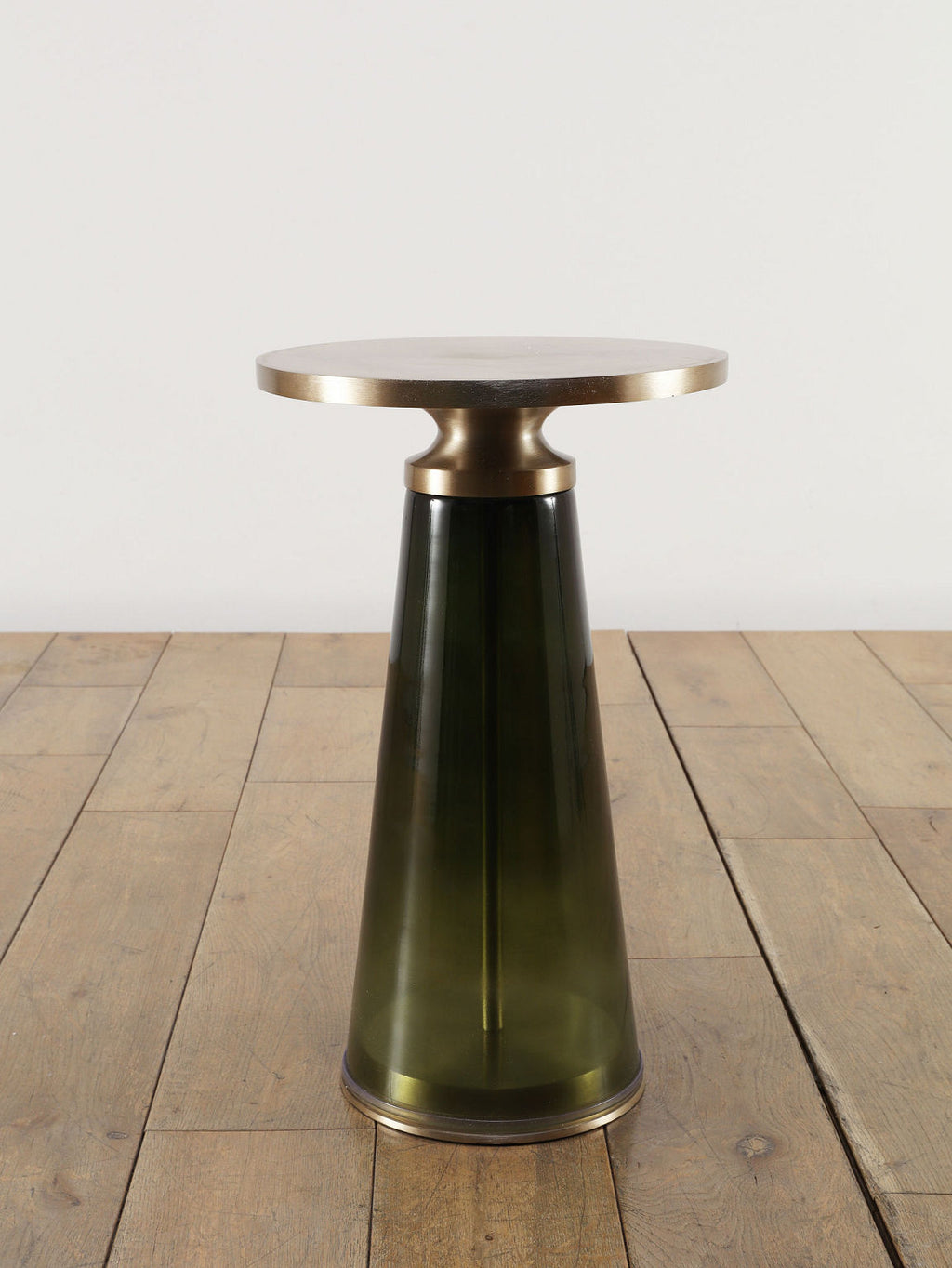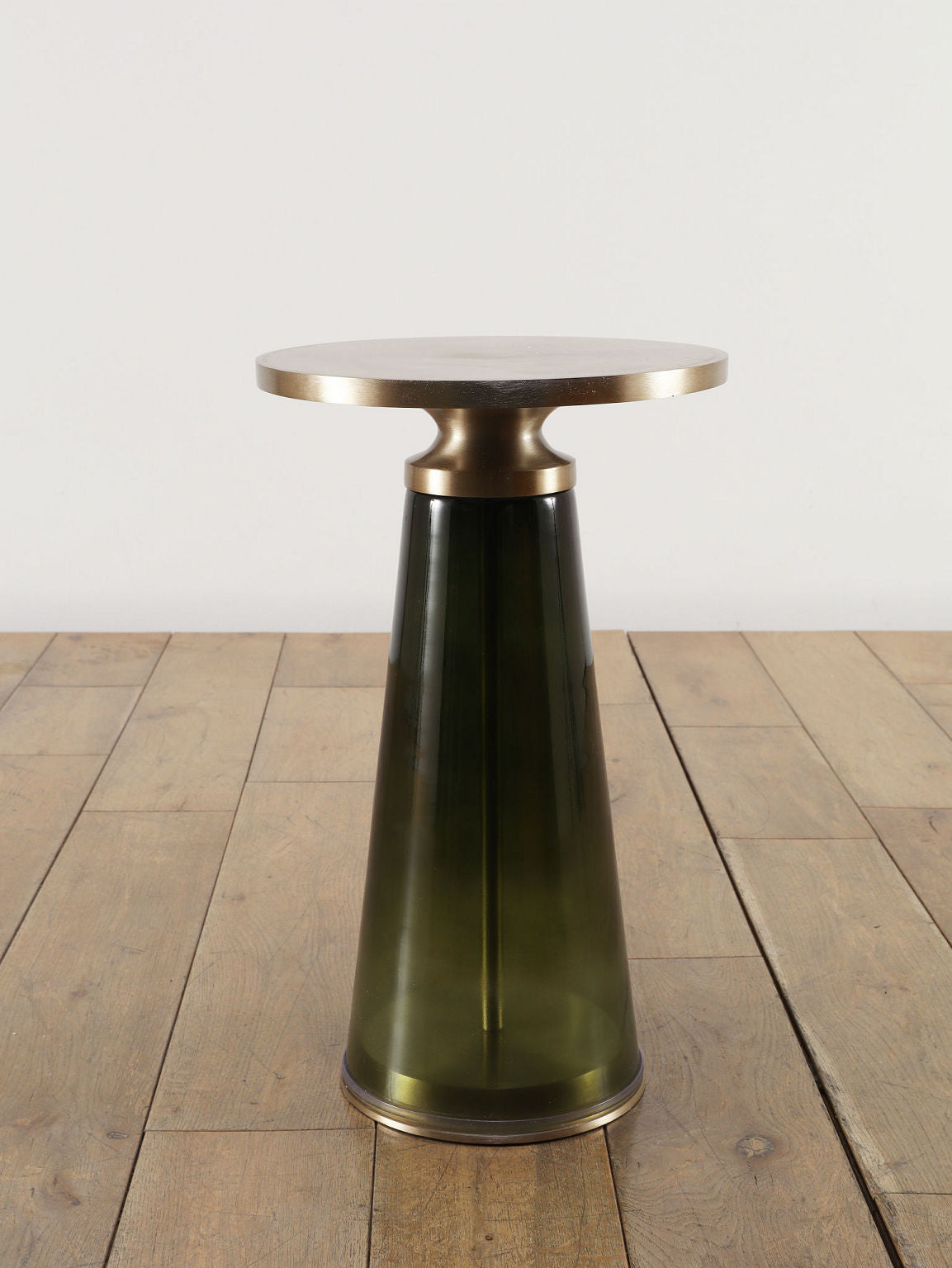 ゴールドのアイアントップとダークグリーンのガラスベースが融合したモダンなサイドテーブル。円形の天板がやさしい輝きを放ち、テーパードしたガラス脚が透明感と深みを加えるスタイリッシュなデザインです。リビングのソファサイドやベッドサイドにあるだけで、空間にラグジュアリーで洗練されたアクセントをプラスしてくれます。コンパクトなサイズながら、ちょっとあると便利なテーブルです。
