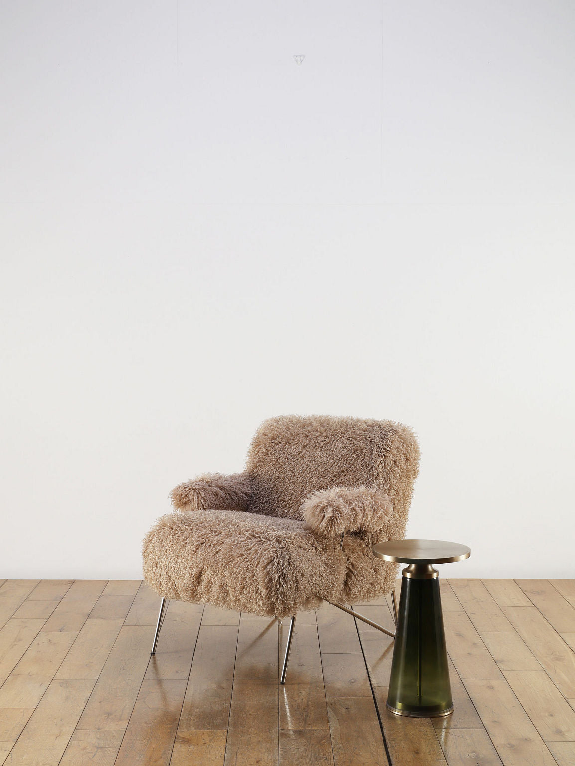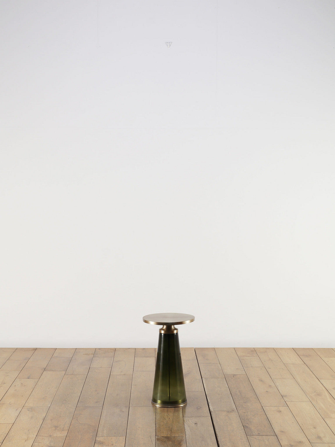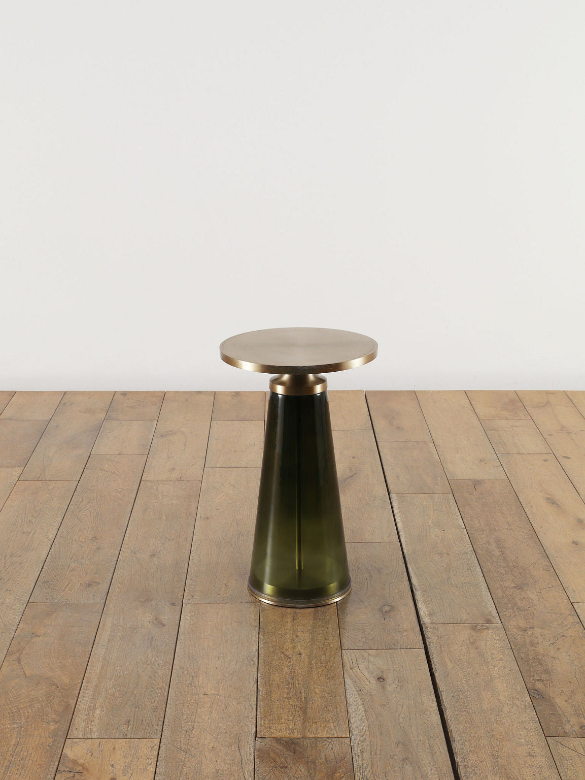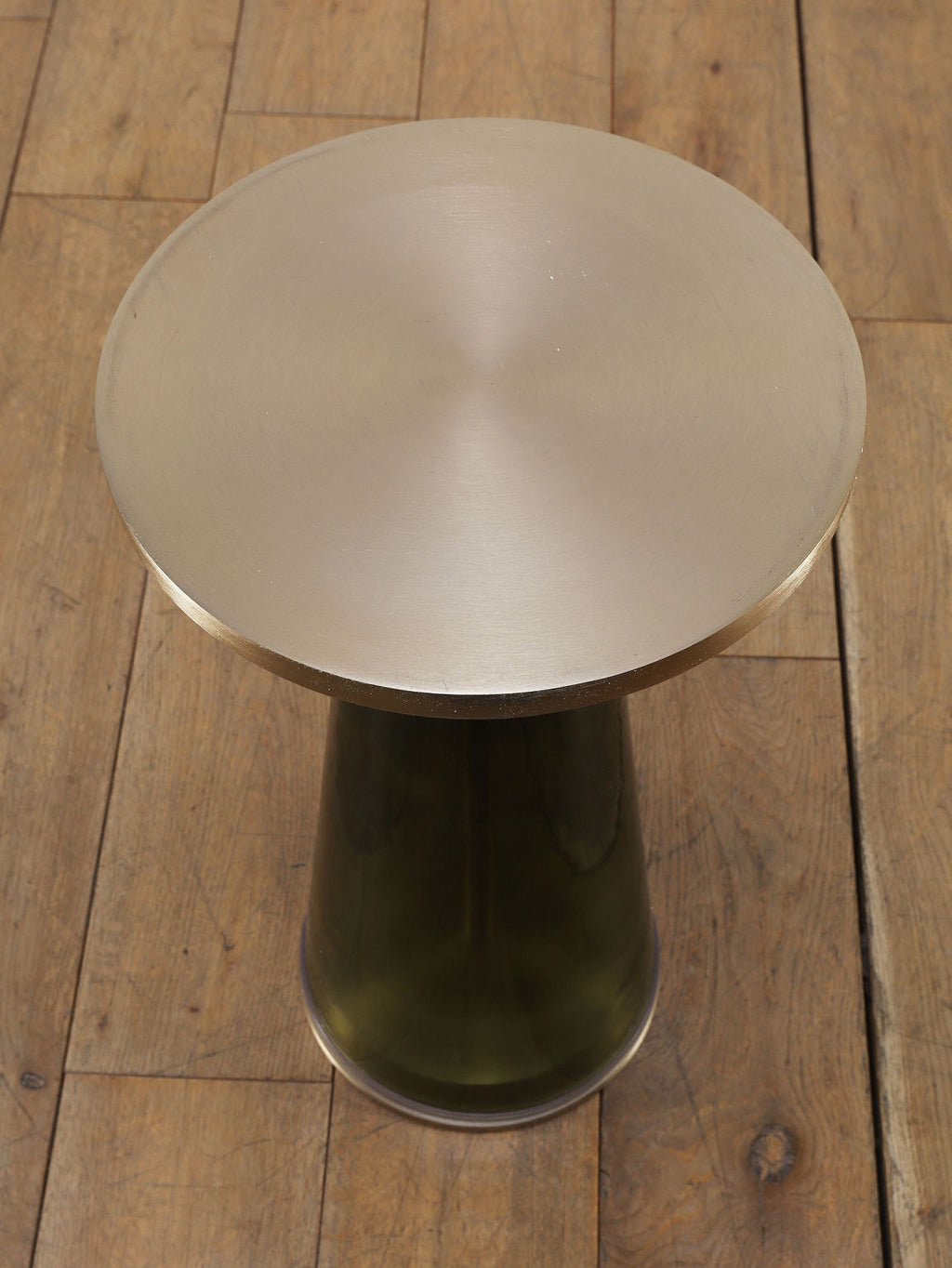 ゴールドのアイアントップとダークグリーンのガラスベースが融合したモダンなサイドテーブル。円形の天板がやさしい輝きを放ち、テーパードしたガラス脚が透明感と深みを加えるスタイリッシュなデザインです。リビングのソファサイドやベッドサイドにあるだけで、空間にラグジュアリーで洗練されたアクセントをプラスしてくれます。コンパクトなサイズながら、ちょっとあると便利なテーブルです。