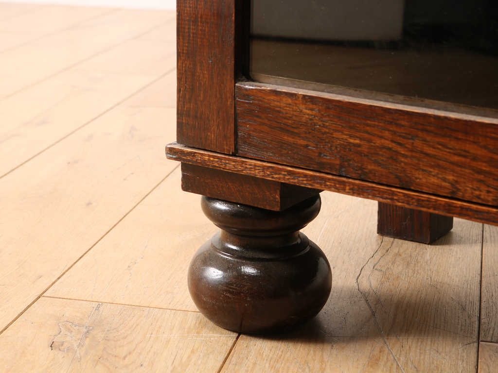 オーク材のシンプルなデザインのブックケースです。オーク材ならではのしっかりとした木目と色味から、非常に重厚感があります。ガラスに装飾が全くないため、中に収納する本やコレクションを美しく表現出来ると思います。本棚以外に、飾り棚として、集められているカップ類を飾って頂く事も出来ます。外側が濃い色味の為、中に飾る白い陶器などがきれいに見えます。