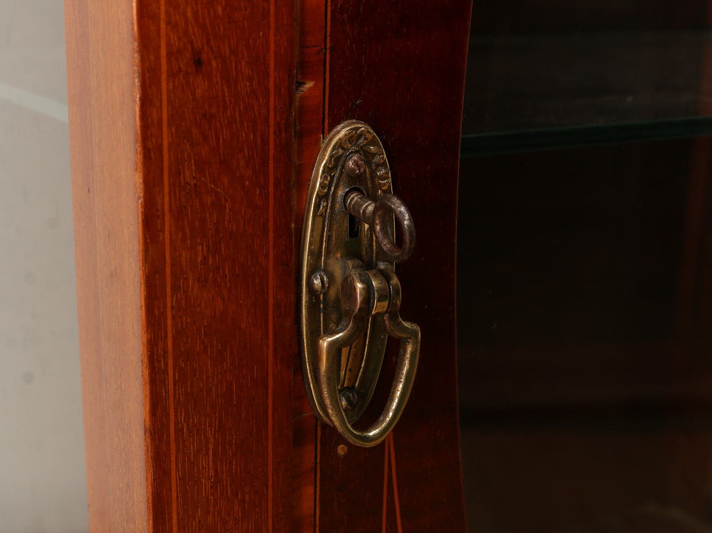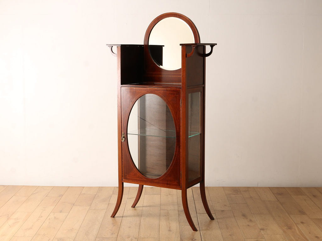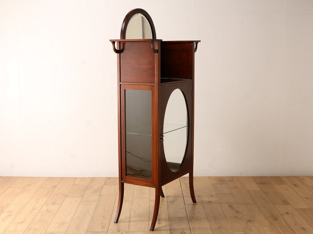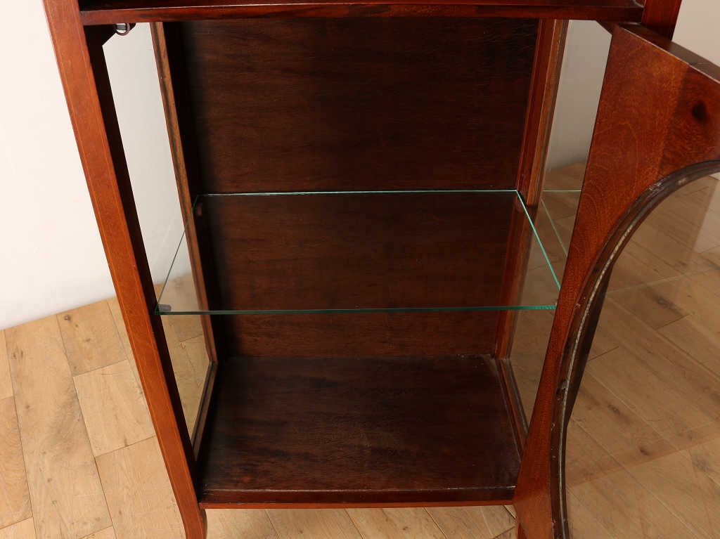 優雅な曲線を用いた有機的なデザインのアール・ヌーヴォーと対象的に幾何学的な構成が特徴のアール・デコ。フランスで生まれた装飾デザイン様式で直線と曲線を用いてつくられました。そんなアール・デコ様式を感じさせるこちらのディスプレイキャビネット。100年以上前につくられたものとは思えないほどモダンなデザインです。目を惹くデザインのため非常にインテリア性が高く、小振りながらお部屋の主役としてお勧めです。イタリアンヴィンテージなどのコンテンポラリーデザインのアイテムを組み合わせても素敵な空間に仕上がるでしょう。
