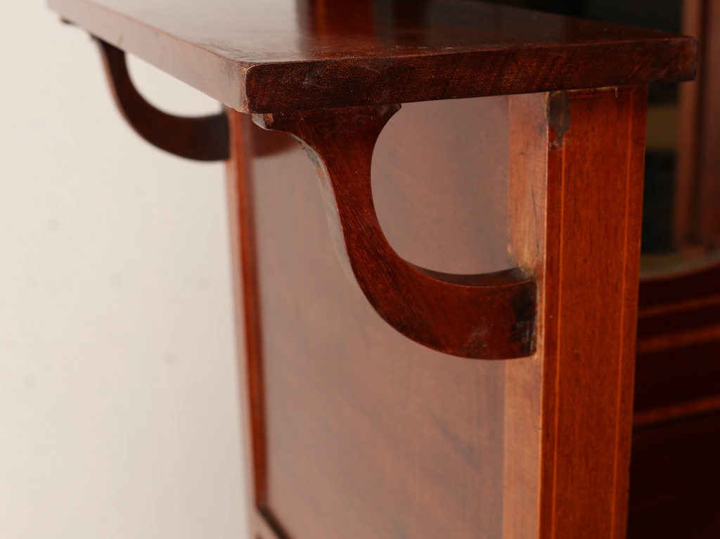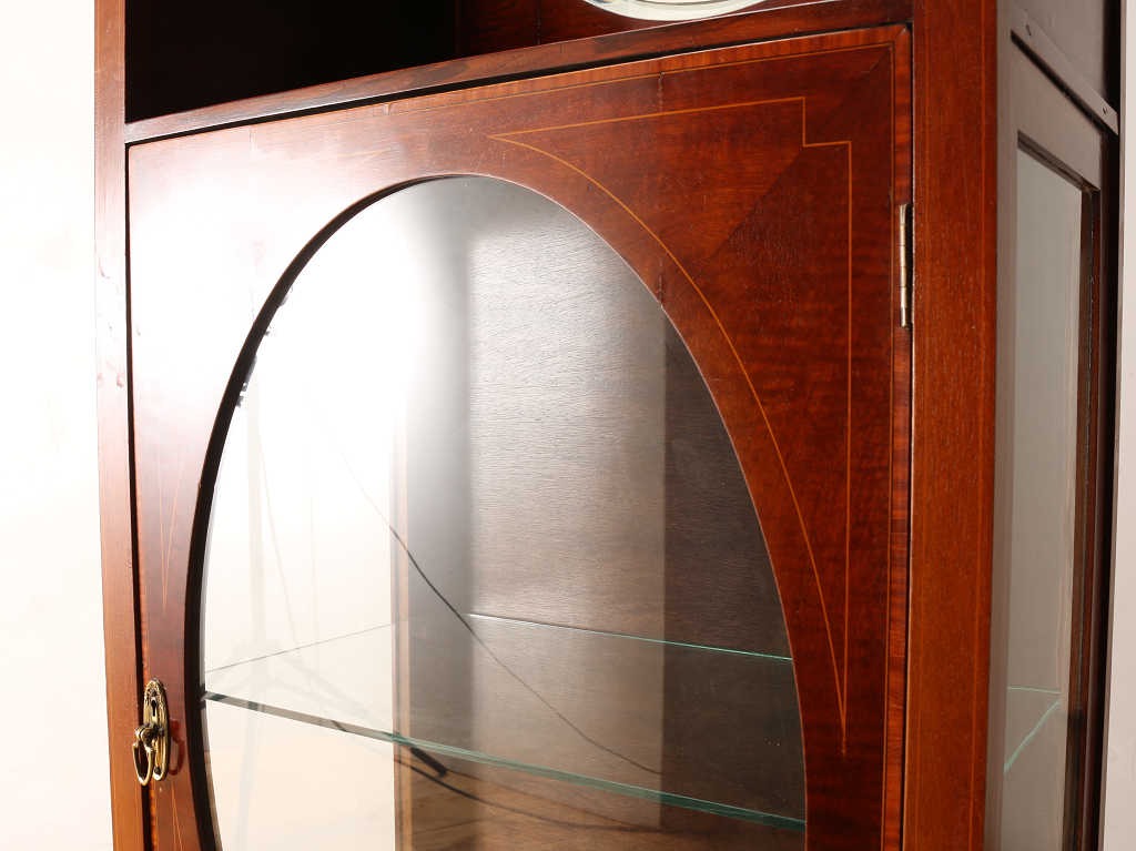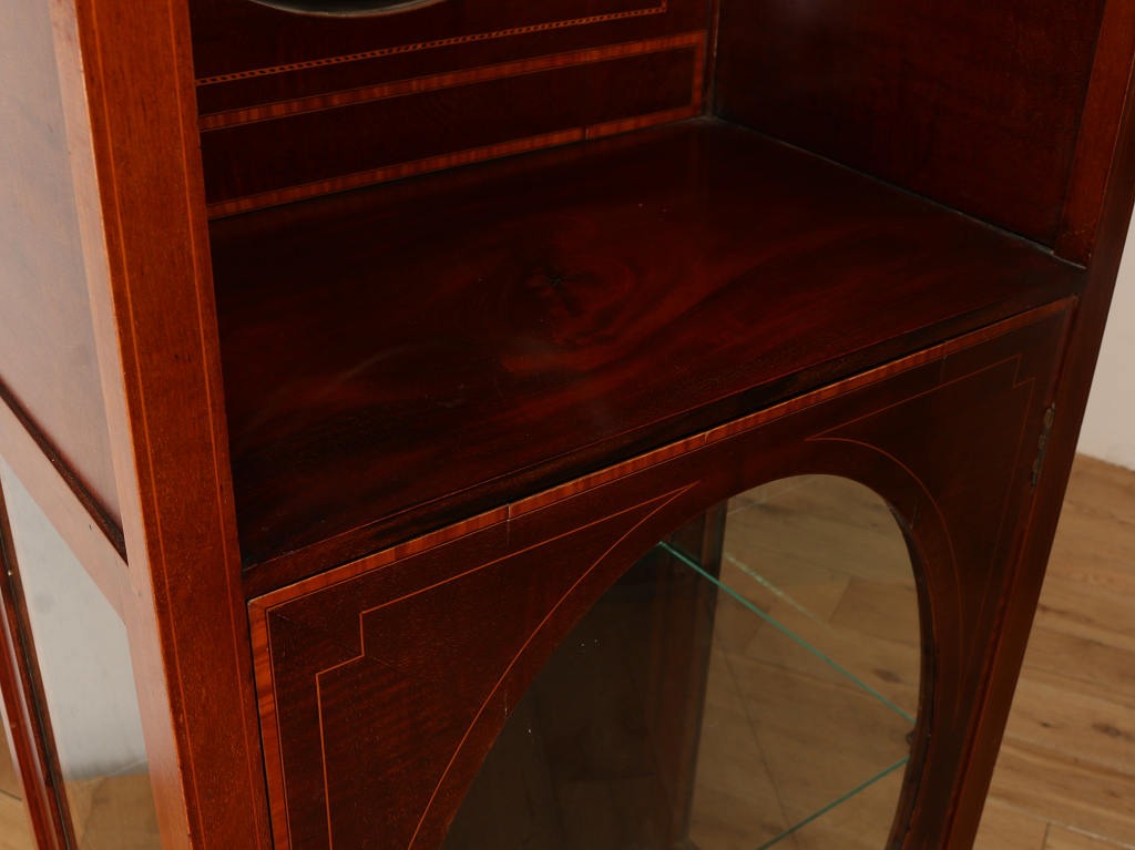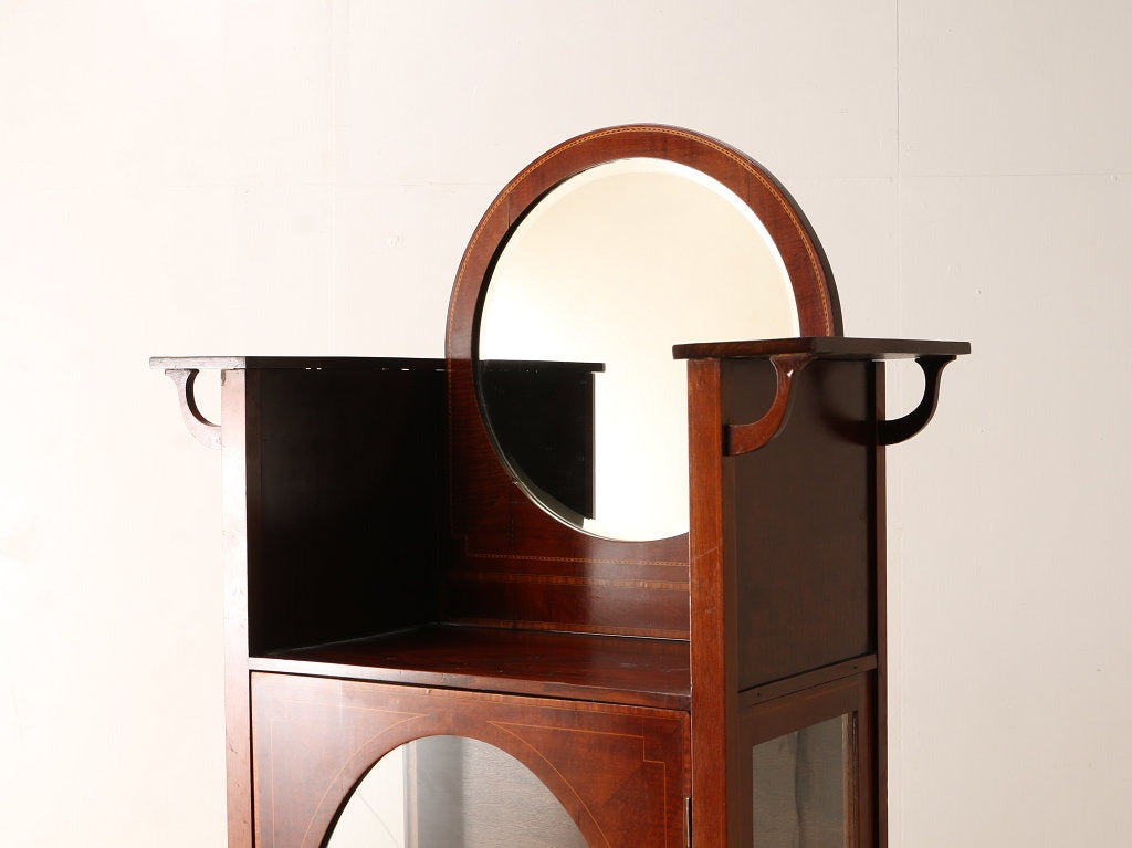 優雅な曲線を用いた有機的なデザインのアール・ヌーヴォーと対象的に幾何学的な構成が特徴のアール・デコ。フランスで生まれた装飾デザイン様式で直線と曲線を用いてつくられました。そんなアール・デコ様式を感じさせるこちらのディスプレイキャビネット。100年以上前につくられたものとは思えないほどモダンなデザインです。目を惹くデザインのため非常にインテリア性が高く、小振りながらお部屋の主役としてお勧めです。イタリアンヴィンテージなどのコンテンポラリーデザインのアイテムを組み合わせても素敵な空間に仕上がるでしょう。