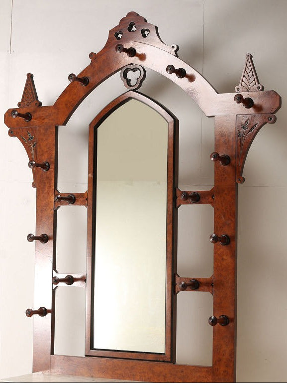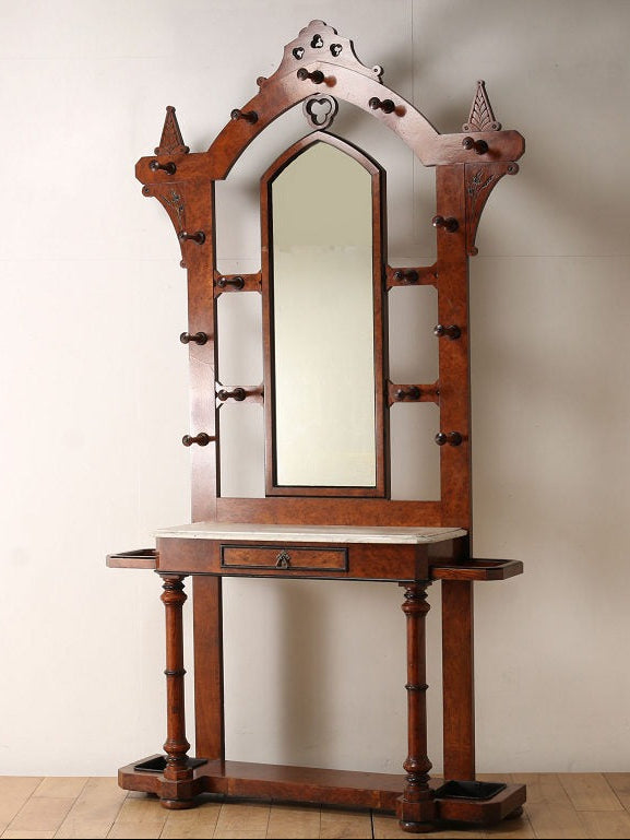 オーク材の中でも、特に上質だと言われるものが「ポラードオーク」。木質を高めるために長い年月をかけて剪定されたポラードオークは非常に密度の詰まった堅牢できめ細やかな杢目を生み出します。そんな上質な木材を使用した、玄関ホールにて使用されていた機能尽くめのホールスタンドです。ホールスタンドは様々なタイプがありますが、こちらのアイテムにはコート・ハットラックにミラー、スティックスタンド用のラックも付いています。現代では見かける機会が無くなったまさにアンティーク家具だからこその出会いでしょう。玄関だけでなく、自室の収納ラックとして、また天板が白の大理石を使用していることから、お化粧用のドレッサーとしてお使い頂くのもおすすめです。
