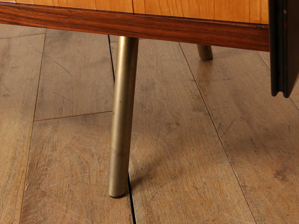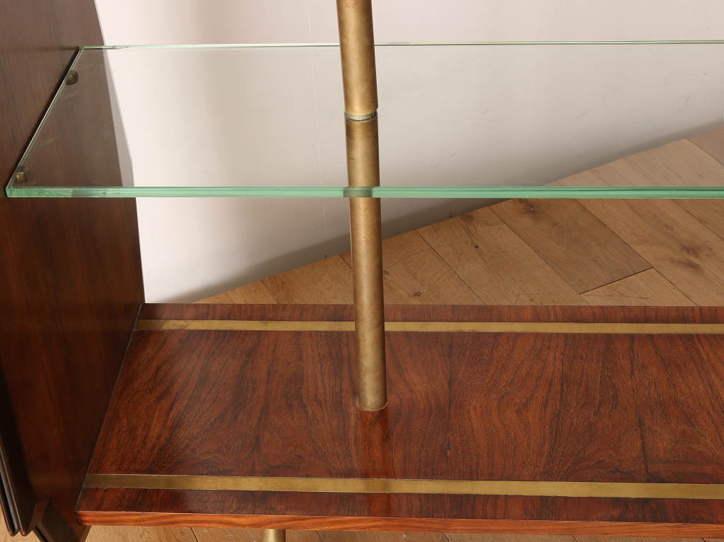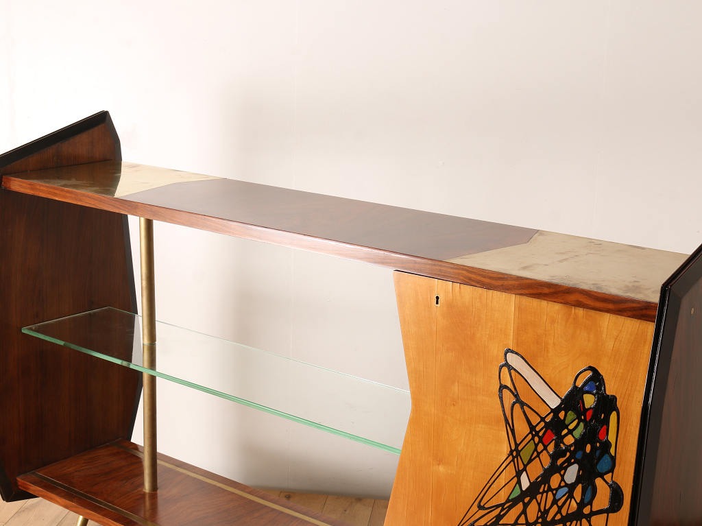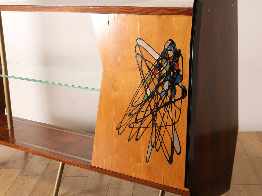 オープンシェルフに鍵付きの扉を有したユニークなバーカウンター。扉には幾何学模様のようなポップなペイントが描かれており、ゴールドのポールと脚と共にデザインのスパイスとなっています。1960年代初頭にイタリアではミラノ・サローネはスタートすると、それが大きな刺激のひとつになりイタリアらしい「生活の豊かさ・楽しさ」を代弁する家具やインテリアがデザインされてました。こちらのアイテムも、そんなユニークなデザインや色使いを存分に味わえる逸品です。両側からお使いいただけるので、空間を仕切るディバイダーとしても活躍してくれるでしょう。