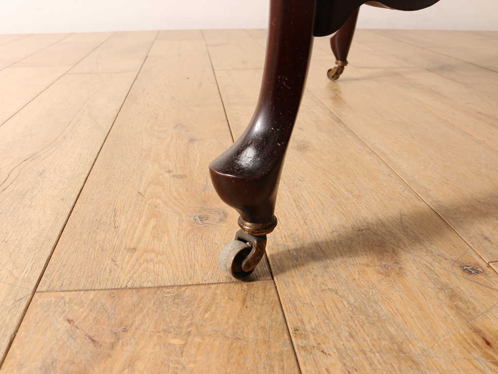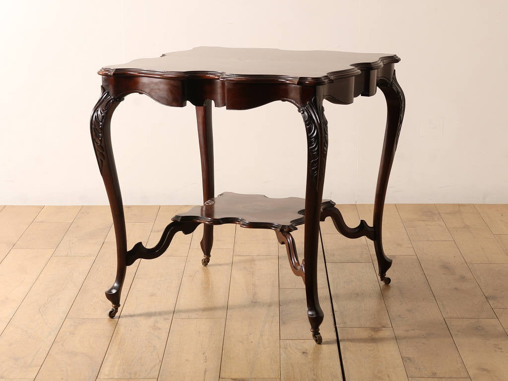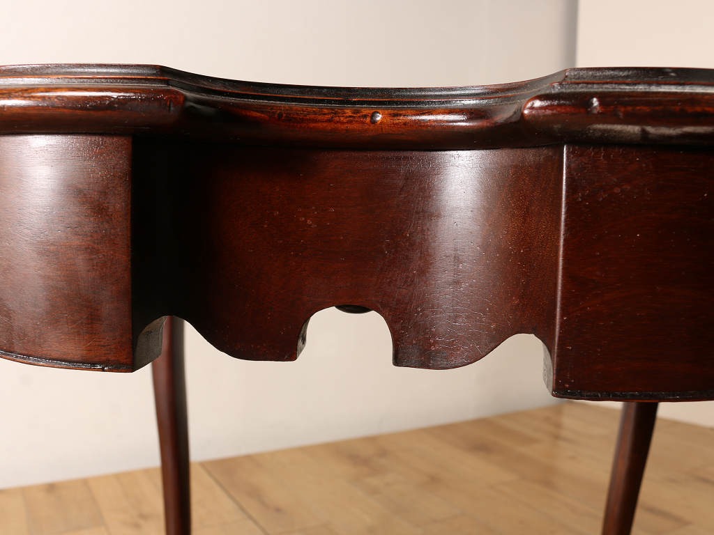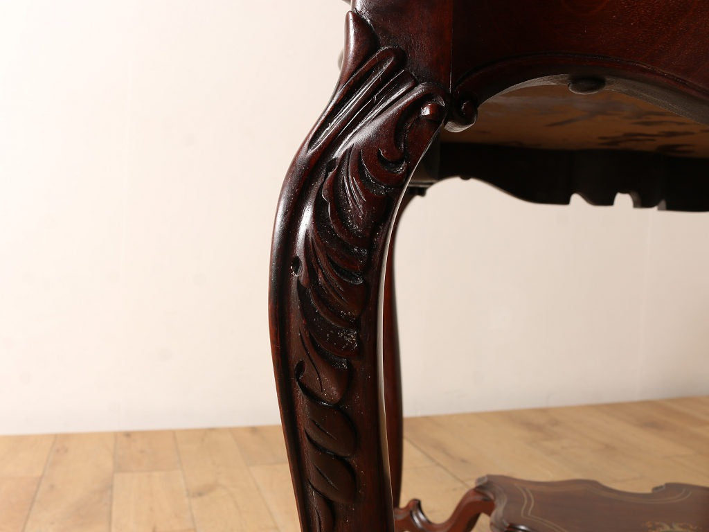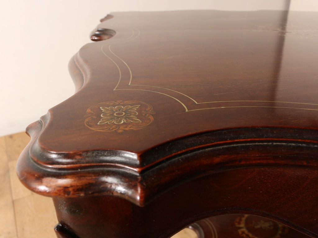 マホガニー材の特徴のあるセンターテーブルです。メインの天板と2段目の板も優しい形をしており、目を惹きます。天板の下の幕板も直線ではなく、天板のデザインに合わせている為、より立体を感じます。また、天板には、美しい花の模様が象嵌で描かれています。通常象嵌は、単色がほとんどですが、こちらは、黄色と青色の2色が使われております。そして、このテーブルのすごさは、天板だけでなく、2段目にも象嵌模様を施している点です。その当時の特別感が伝わってくる一品です。