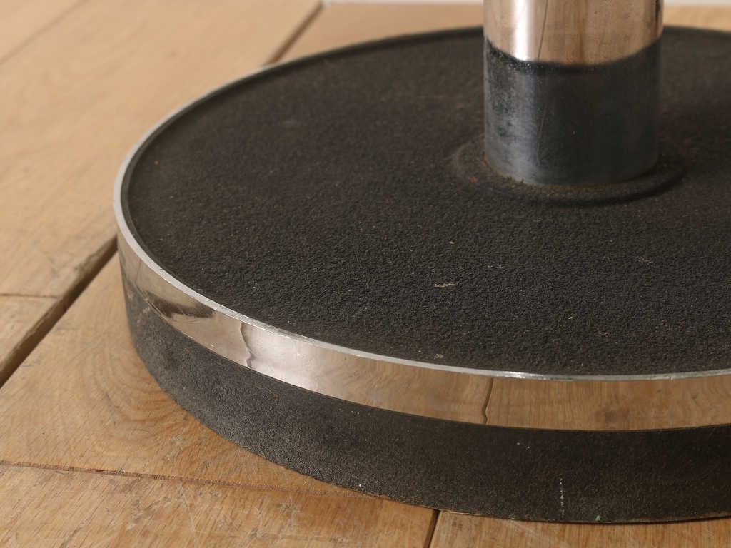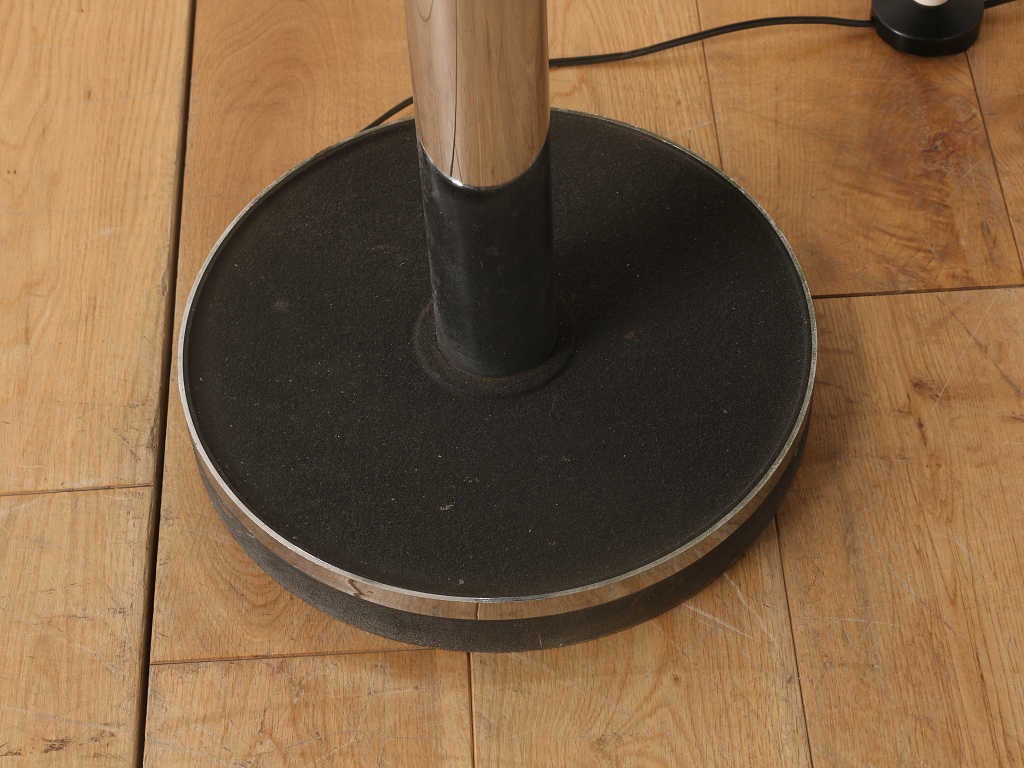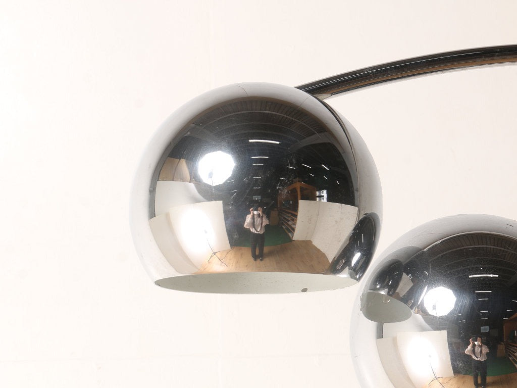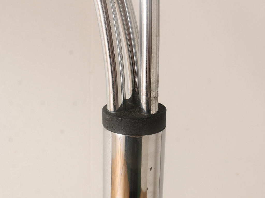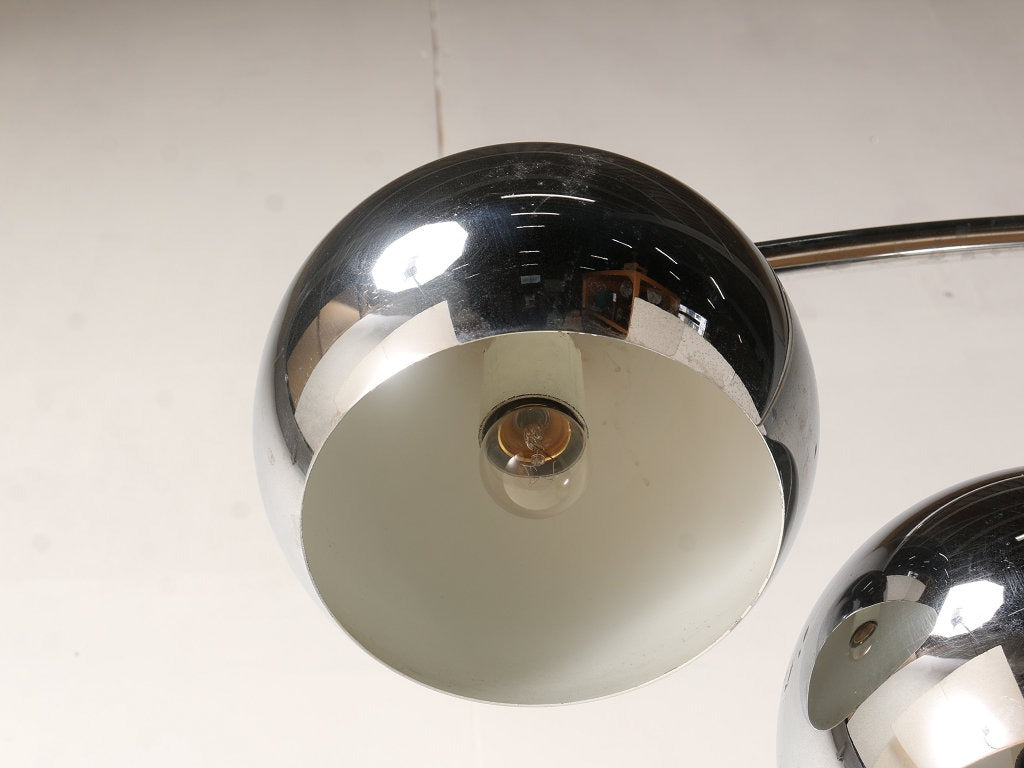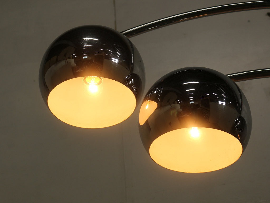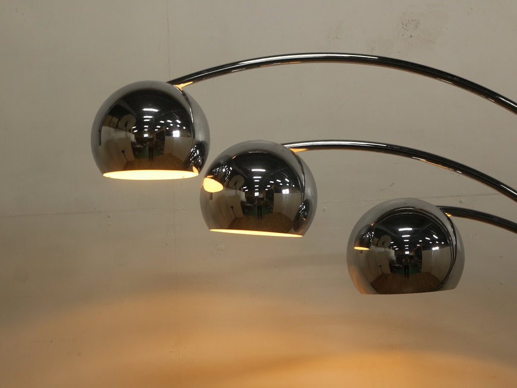 空間的なデザインのアークランプ、イタリア製のヴィンテージ商品です。 シェードが3つとボリュームがあり、シンプルながら空間を彩るインテリアランプとして適したフロアランプです。すこしユニークなアイテムを取り入れたい方、お部屋の雰囲気をガラリと替えたい方にぜひ、取り入れていただきたいアイテムです。