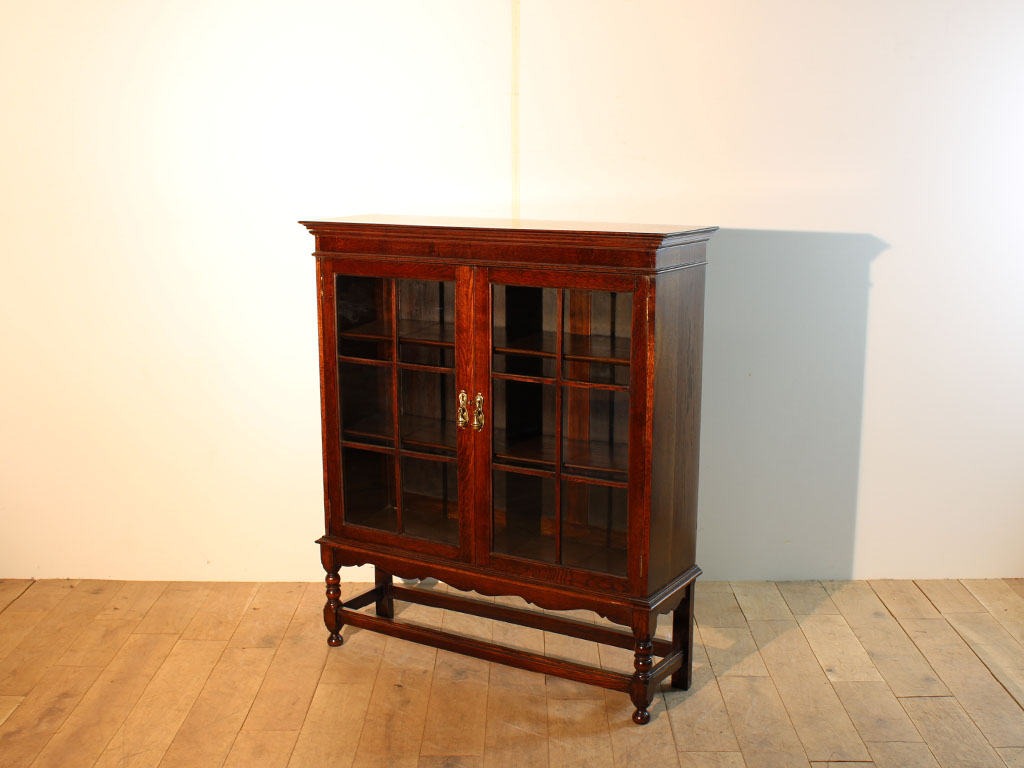 直線的なラインと曲線的なカーブが程よいバランスのブックケース。天板のシルエットやガラス扉の格子には、スマートな印象もありますが、脚元には緩やかなカーブと丸みのある装飾に優しい雰囲気もございます。オーク材のしっかりとした木目にもあたたかい表情があり、お部屋にあるだけでどこかホッとするような佇まいです。本や食器に小物など、たっぷりとした収納力はもちろんありますが、お好きなコレクションをディスプレイしたりとお楽しみいただけますよ。