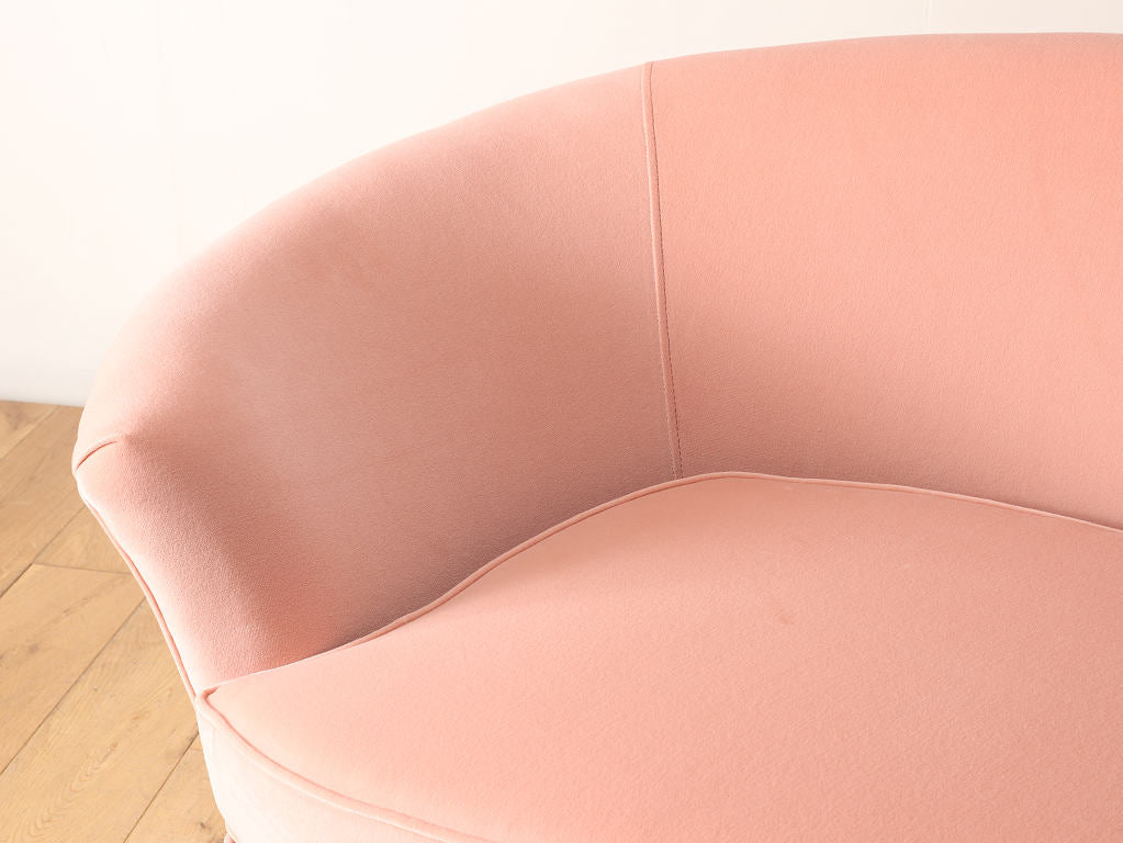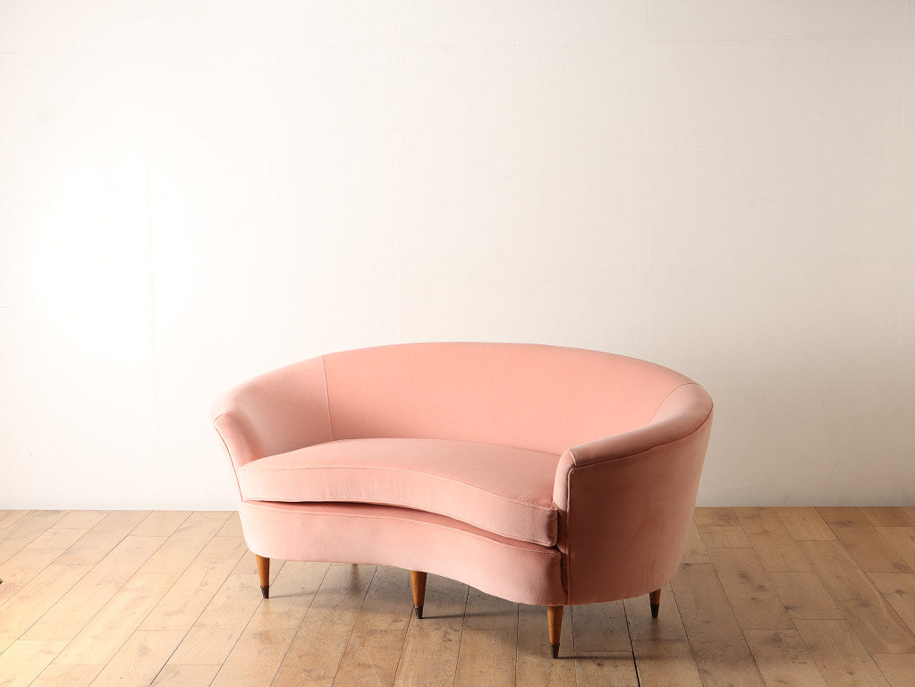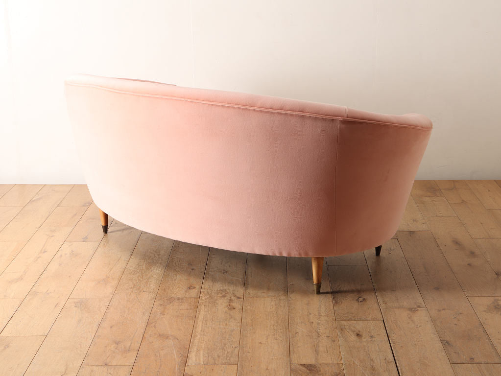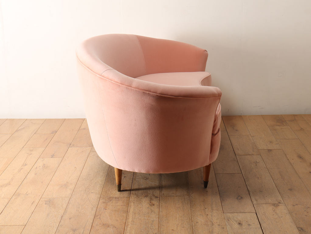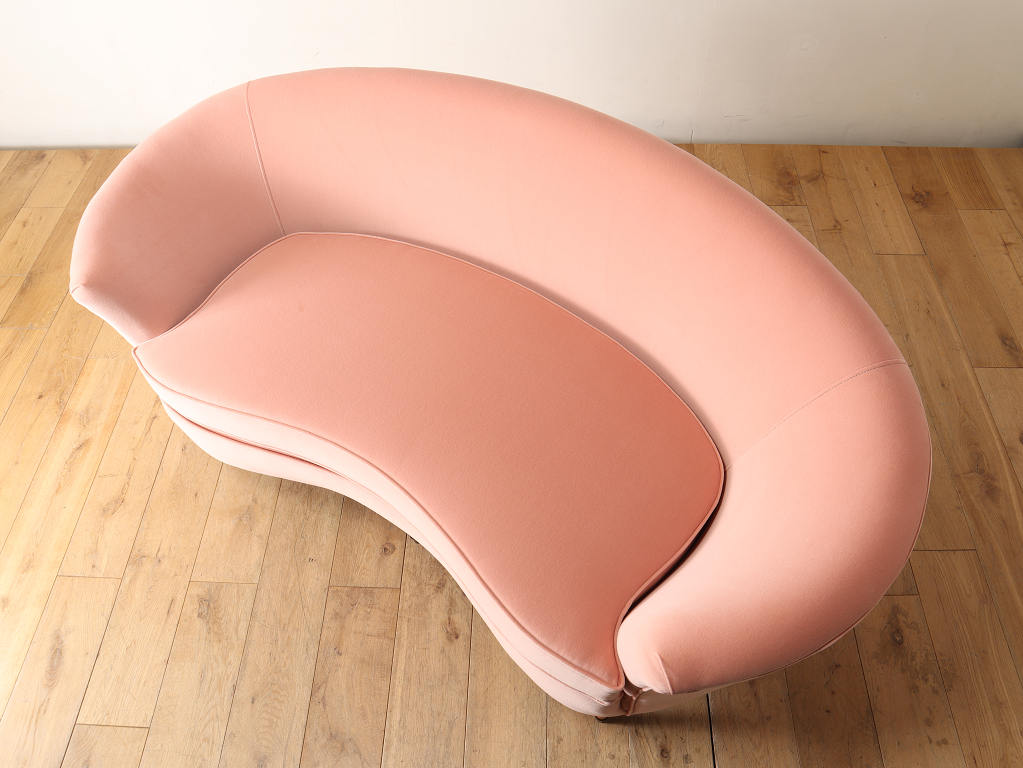 全体的に角がなく曲線で描かれたデザインが目を惹くこちらのソファ。脚元はウッドを使用しており、淡いピンクの色味のファブリックはお部屋のワンポイントになります。お部屋の主役アイテムとしていかがでしょうか。