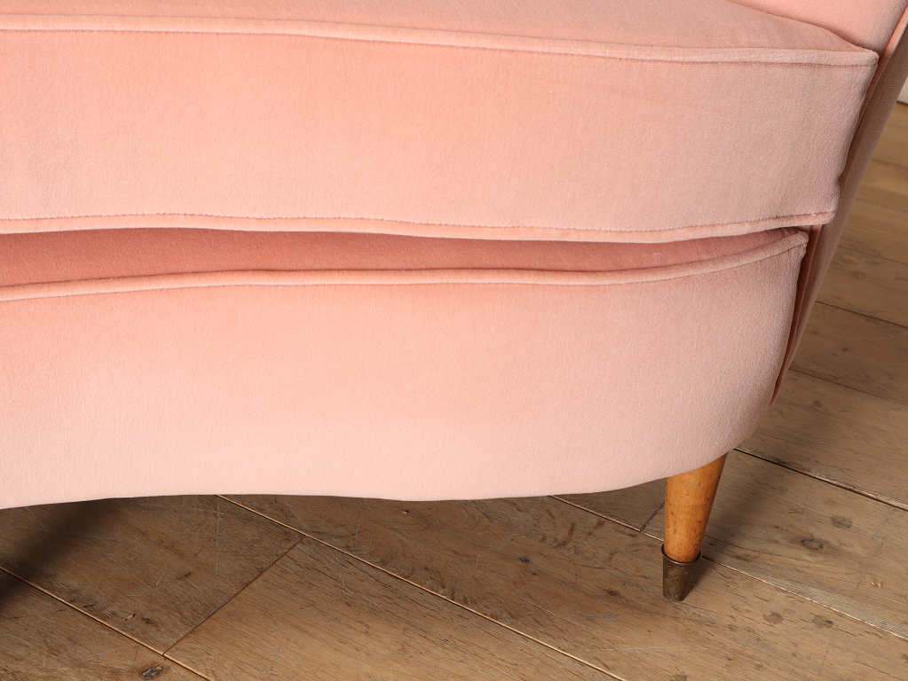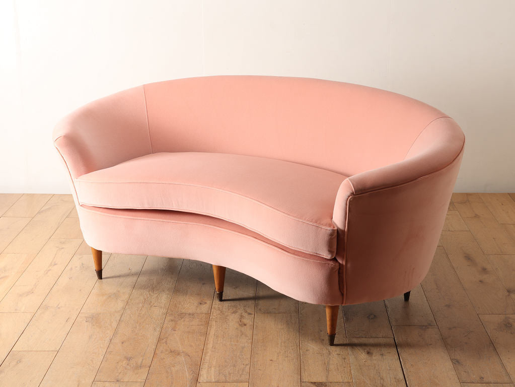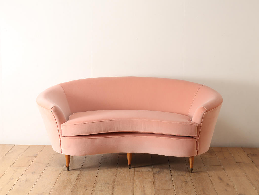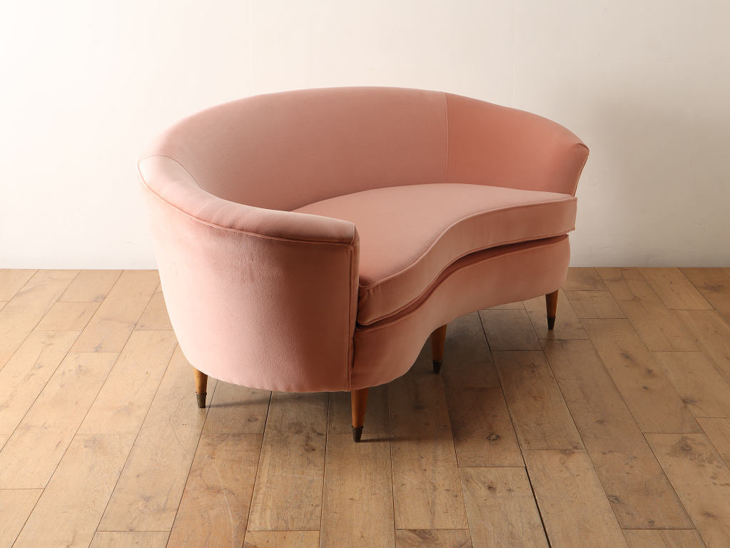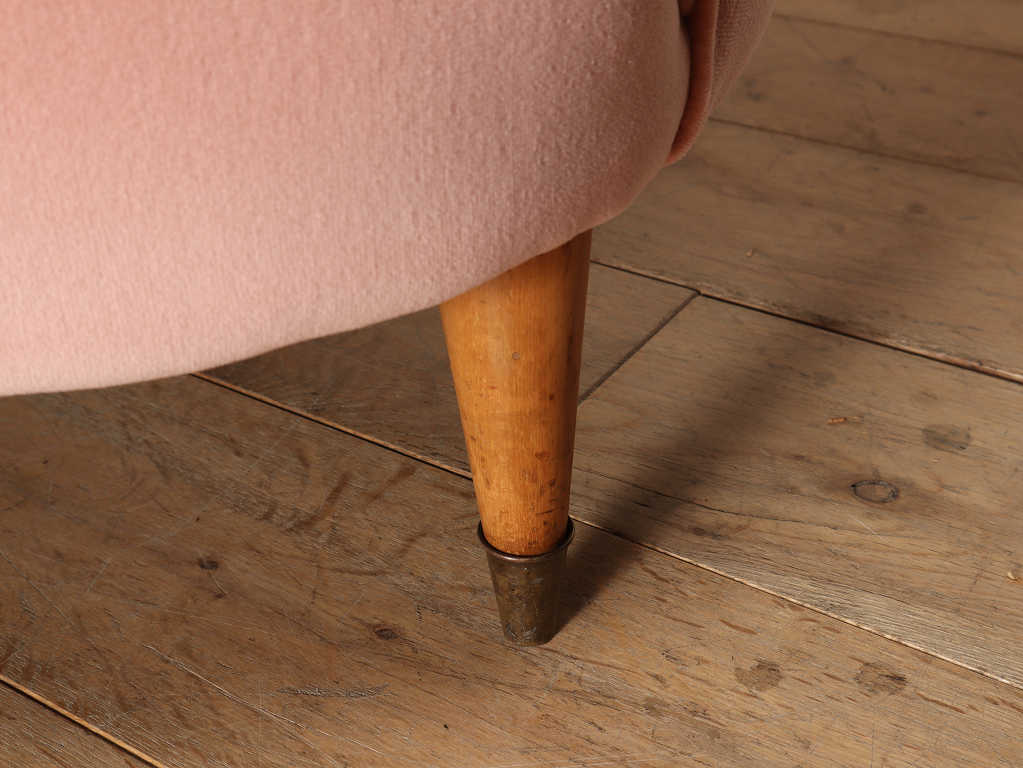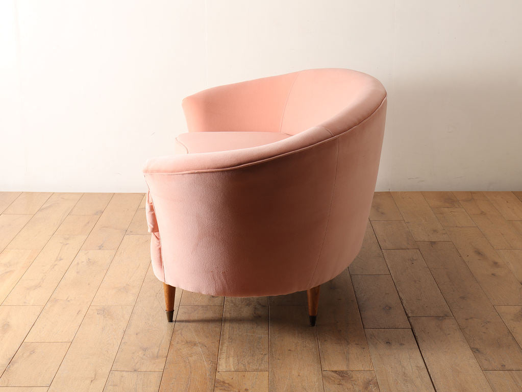 全体的に角がなく曲線で描かれたデザインが目を惹くこちらのソファ。脚元はウッドを使用しており、淡いピンクの色味のファブリックはお部屋のワンポイントになります。お部屋の主役アイテムとしていかがでしょうか。