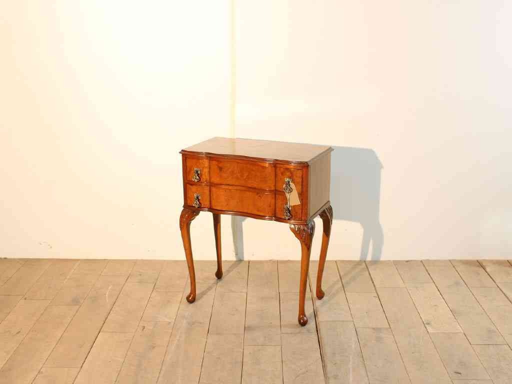 すっと脚の長い、小ぶりでコンパクトなチェスト。いざ探そうと思うとなかなか見つからない、そんな一台が入荷しました。ウォルナット材の複雑な杢目が印象的で、何より緩やかなS字をえがいたネコ脚が上品な雰囲気を演出してくれます。小ぶりなサイズですので置く場所を選ばす、ベッドサイドの収納やリビングの収納、天板に花瓶などを飾っても素敵です。取手の真鍮がまた良いアクセントとなり、ウォルナットとの色味の組み合わせがなんとも美しいです。