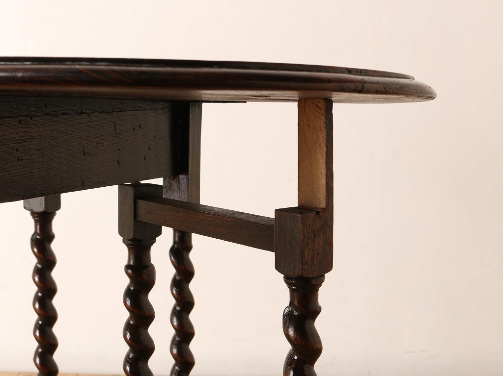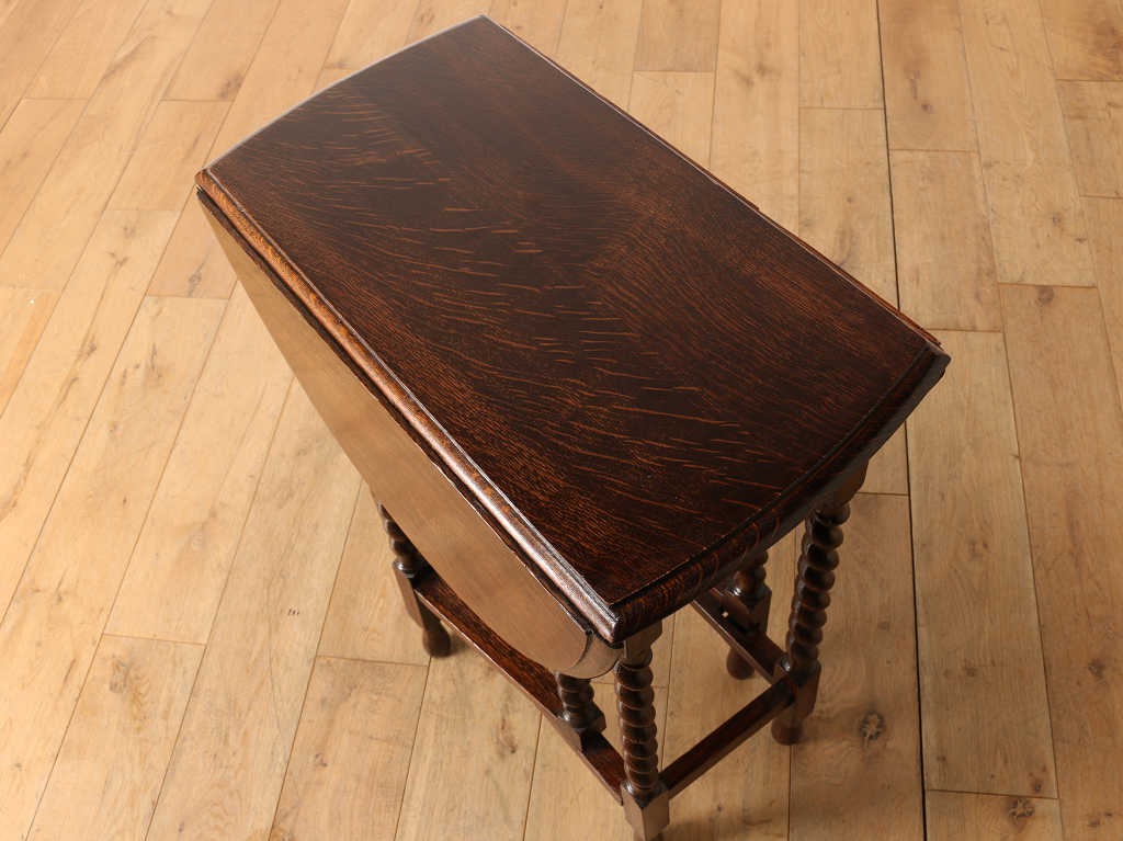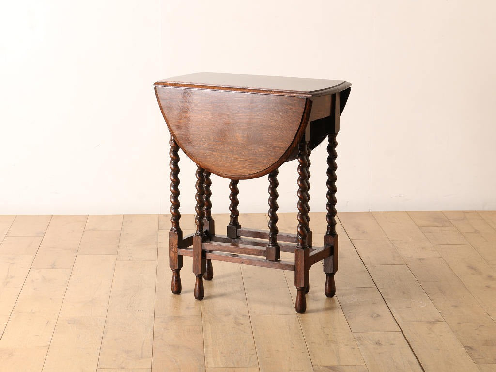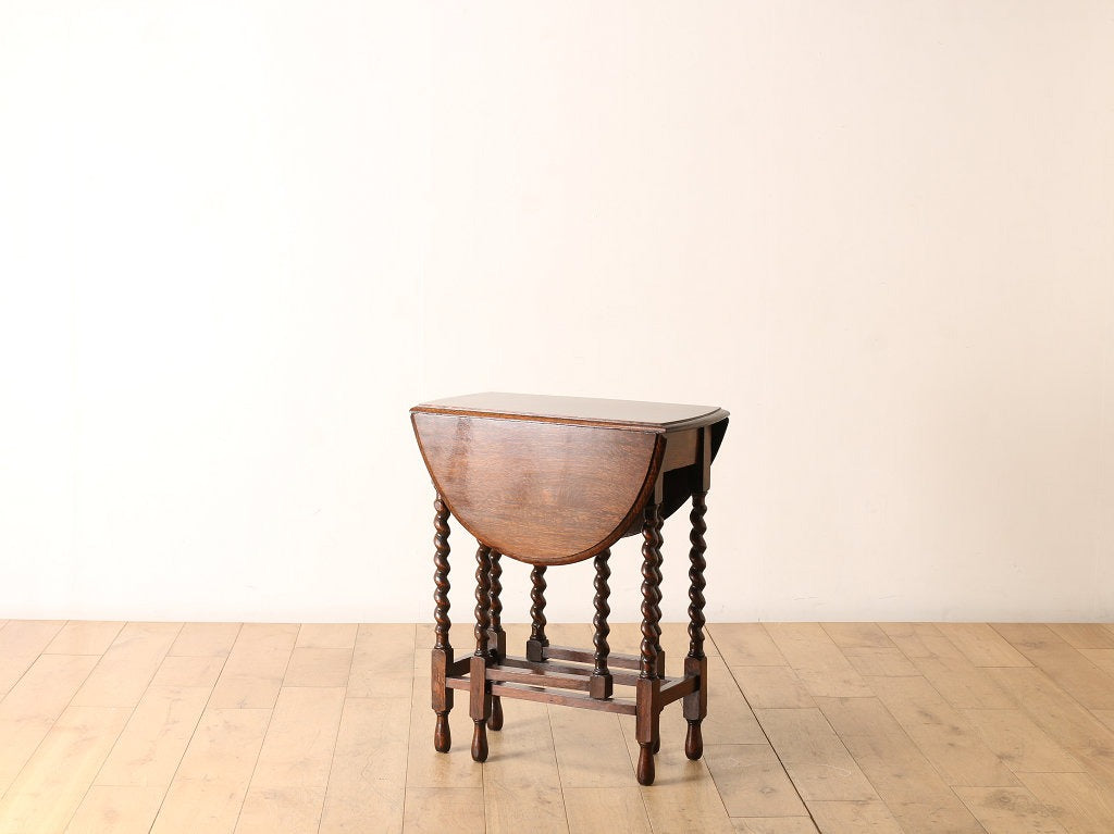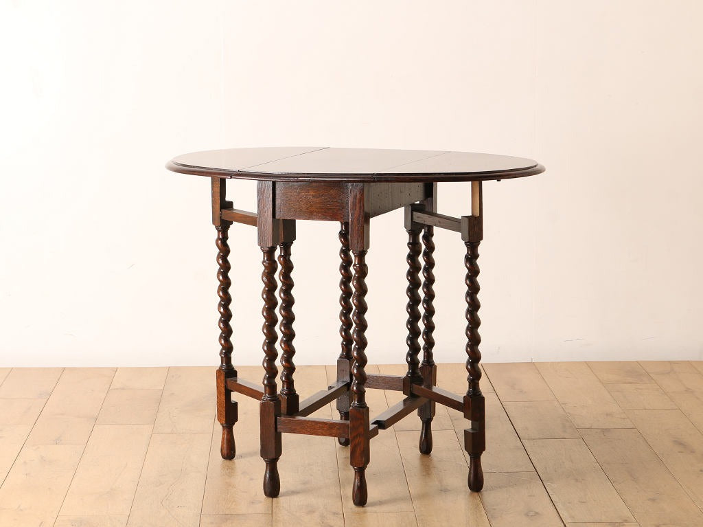 両サイドに折り畳み可能な天板が付いているバタフライ式のテーブルです。天板の支えになる可動式の脚部が、開閉式の「門」を思わせる動きをすることからその名が付きました。使用する場所、スペースに合わせて、サイズを変えられるため、当時からとても重宝されており、アンティーク家具の中でも定番のテーブルです。その分、大きさやデザインは実に様々で、ご自分だけの逸品を探す楽しさもあります。長く愛される定番の魅力を、生活の中に取り入れてみてはいかがでしょうか。