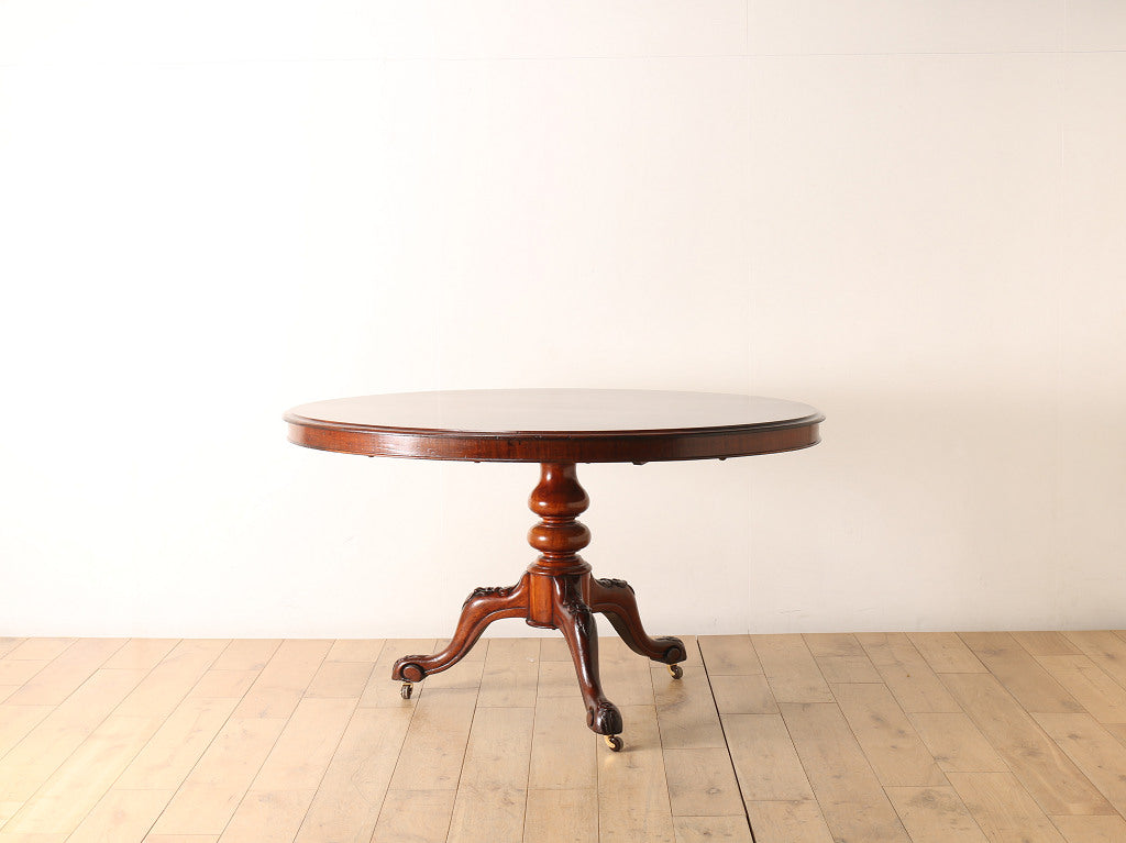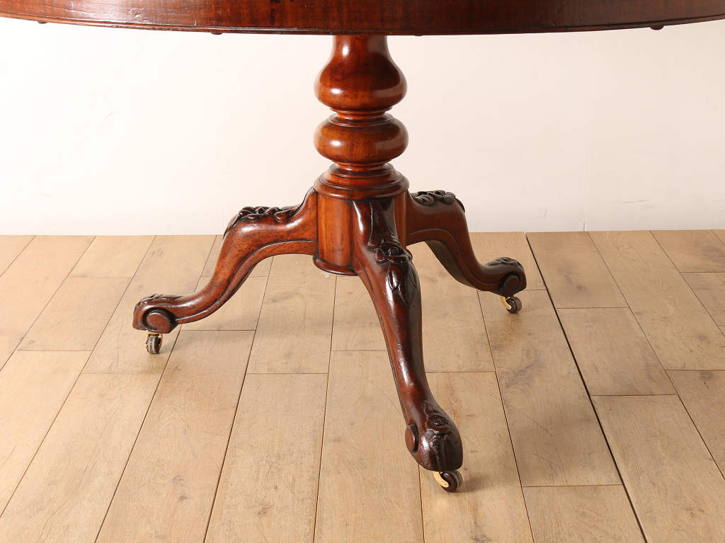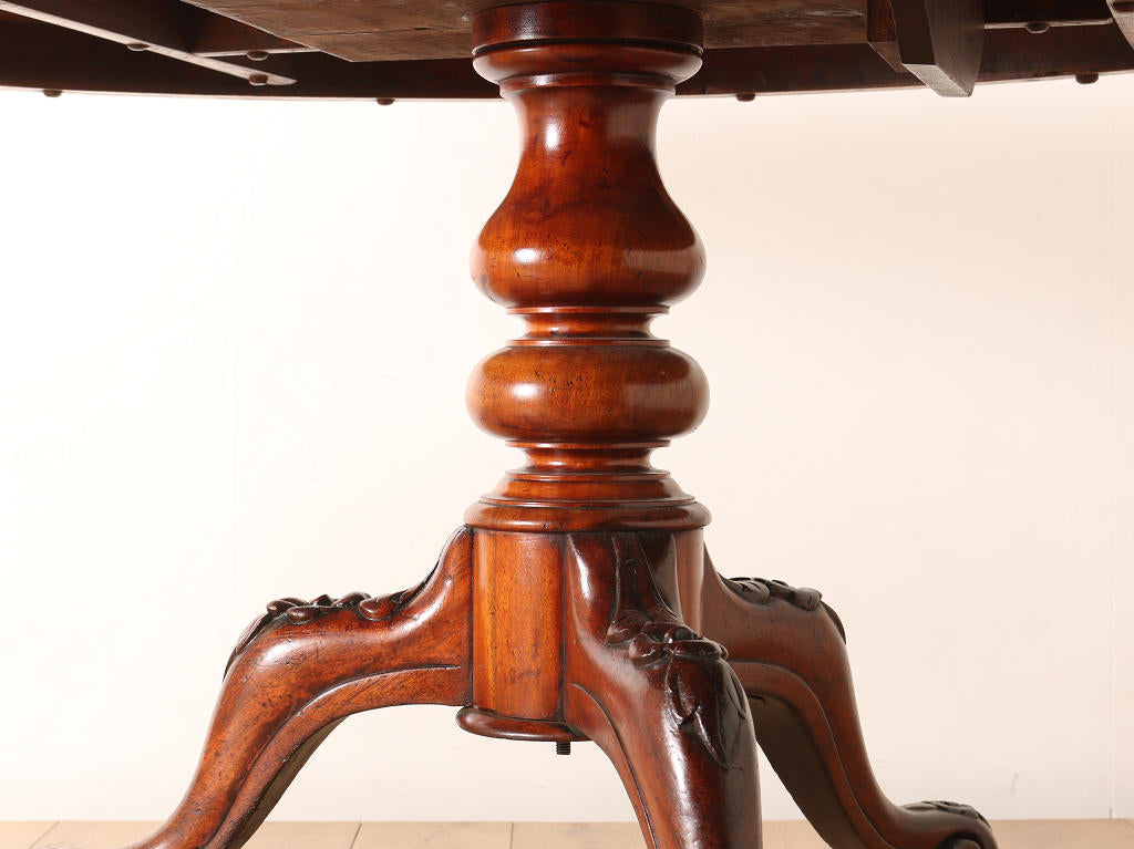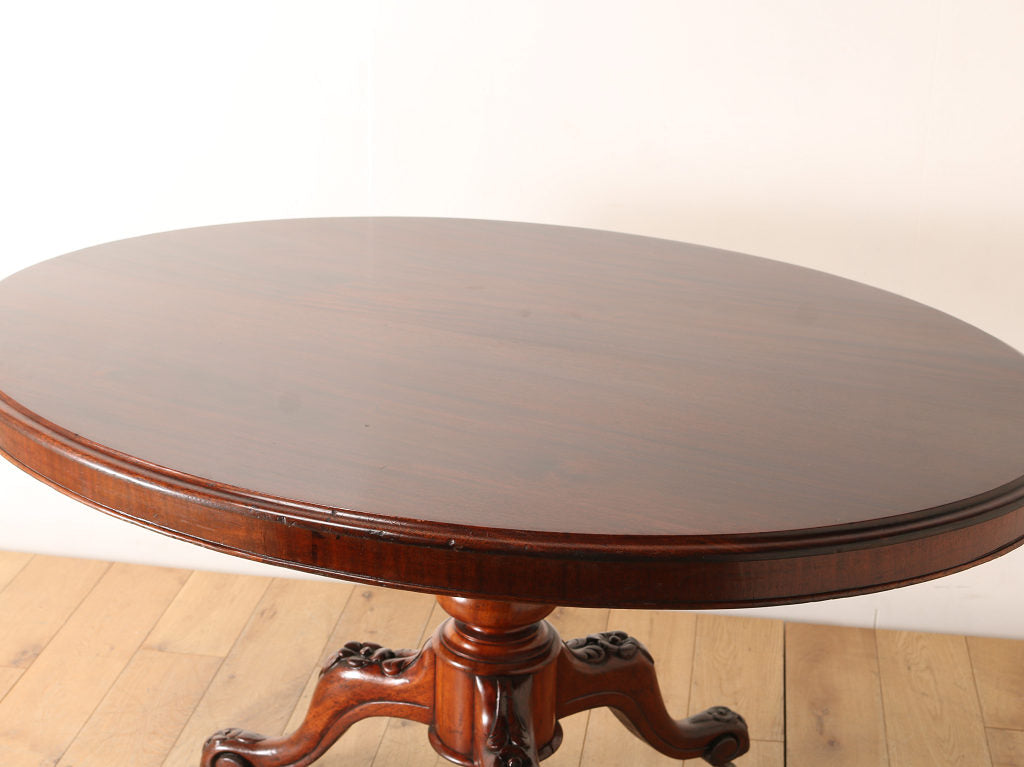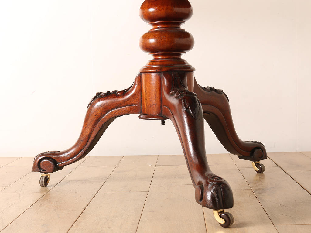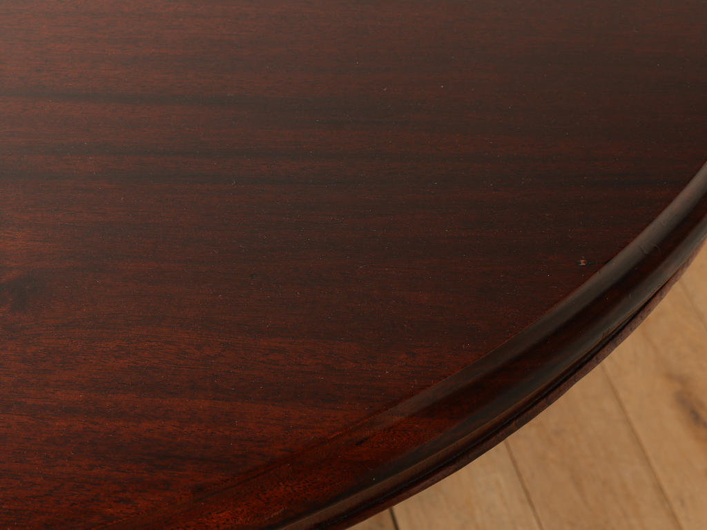 マホガニーの艷やかな質感と、美しい木目が魅力のティルトップのヴィクトリアンブレックファストテーブル。ティルトップとは、立ち上げ、畳むことのできる天板の意です。小さいサイズから大きいサイズまで種類は様々。こちらのアイテムは幅1050㎜と程よいサイズ感となります。窮屈になること無く、お食事なども可能です。1880年代(推定)イギリスに誕生、古き良きヴィクトリアンの風合いが見て取れる、ダイニングとしてもおすすめしたい逸品です。
