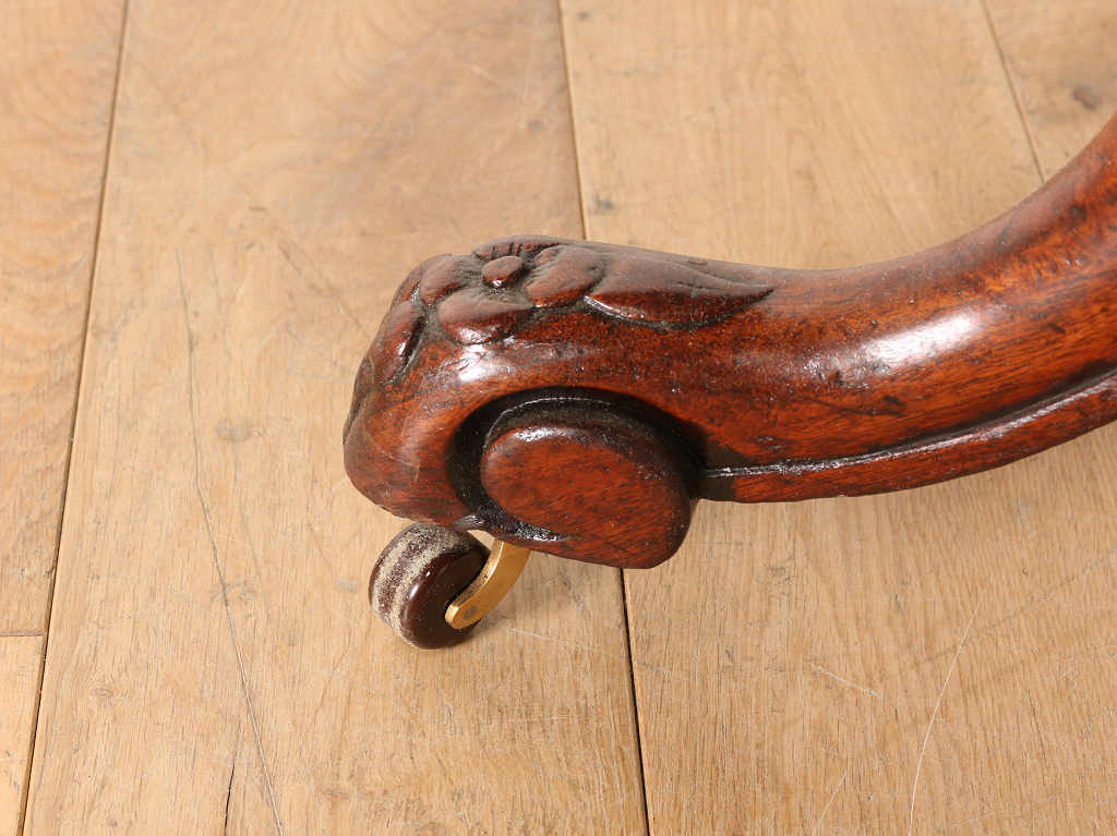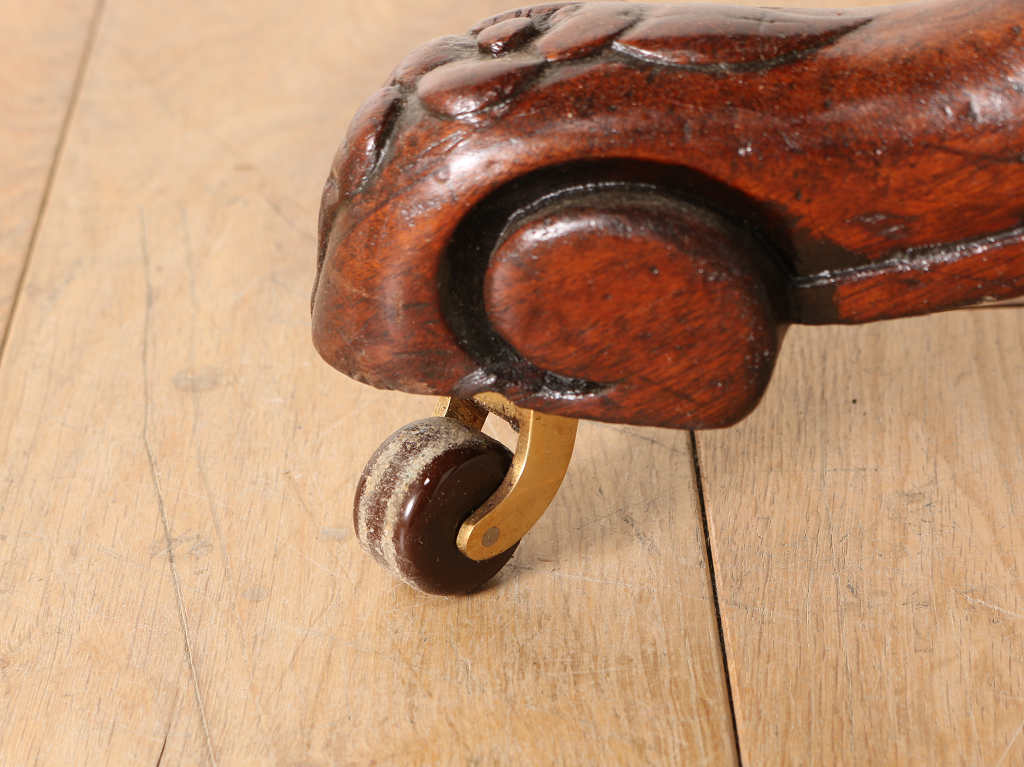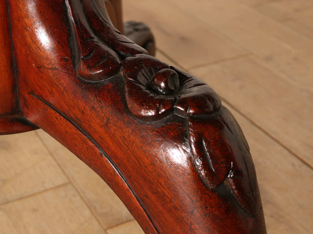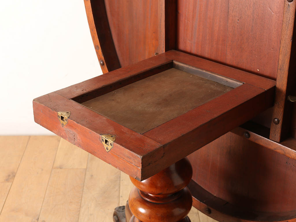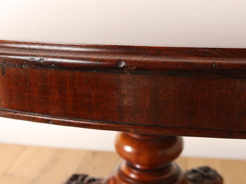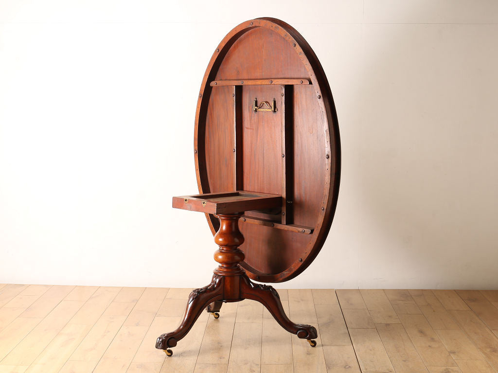 マホガニーの艷やかな質感と、美しい木目が魅力のティルトップのヴィクトリアンブレックファストテーブル。ティルトップとは、立ち上げ、畳むことのできる天板の意です。小さいサイズから大きいサイズまで種類は様々。こちらのアイテムは幅1050㎜と程よいサイズ感となります。窮屈になること無く、お食事なども可能です。1880年代(推定)イギリスに誕生、古き良きヴィクトリアンの風合いが見て取れる、ダイニングとしてもおすすめしたい逸品です。