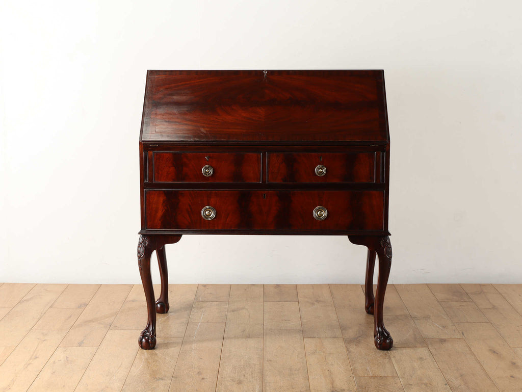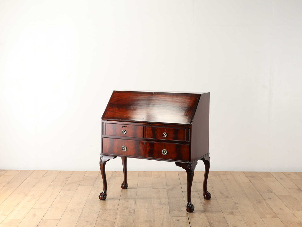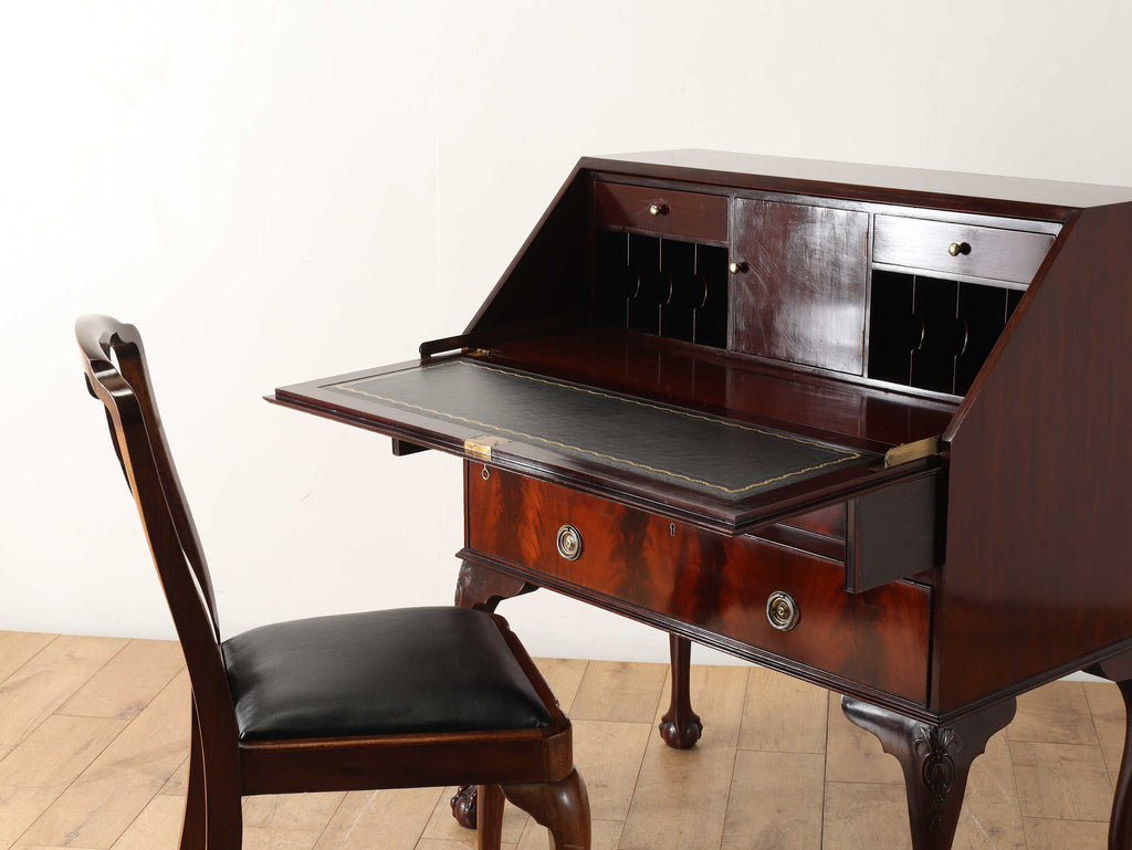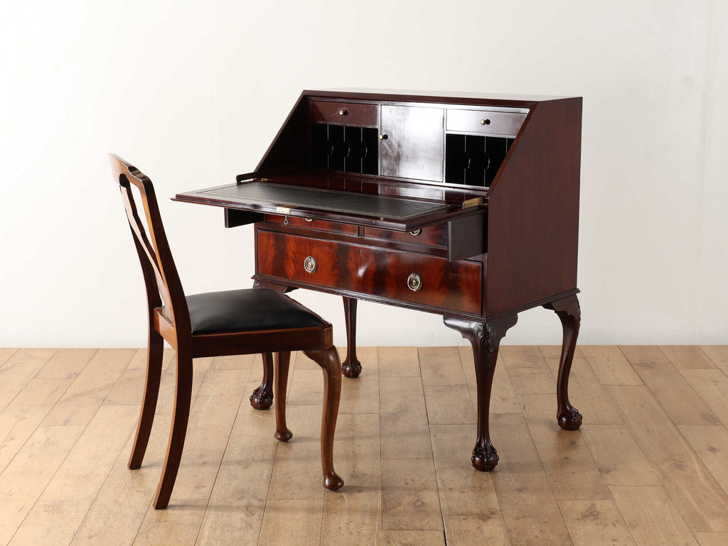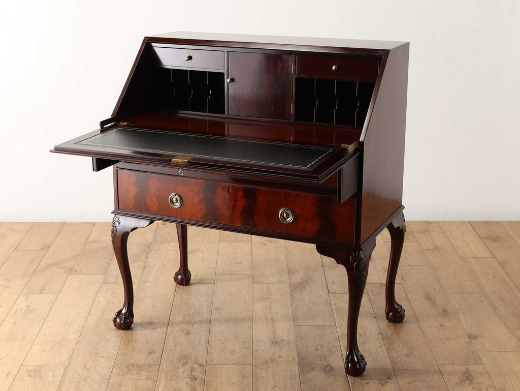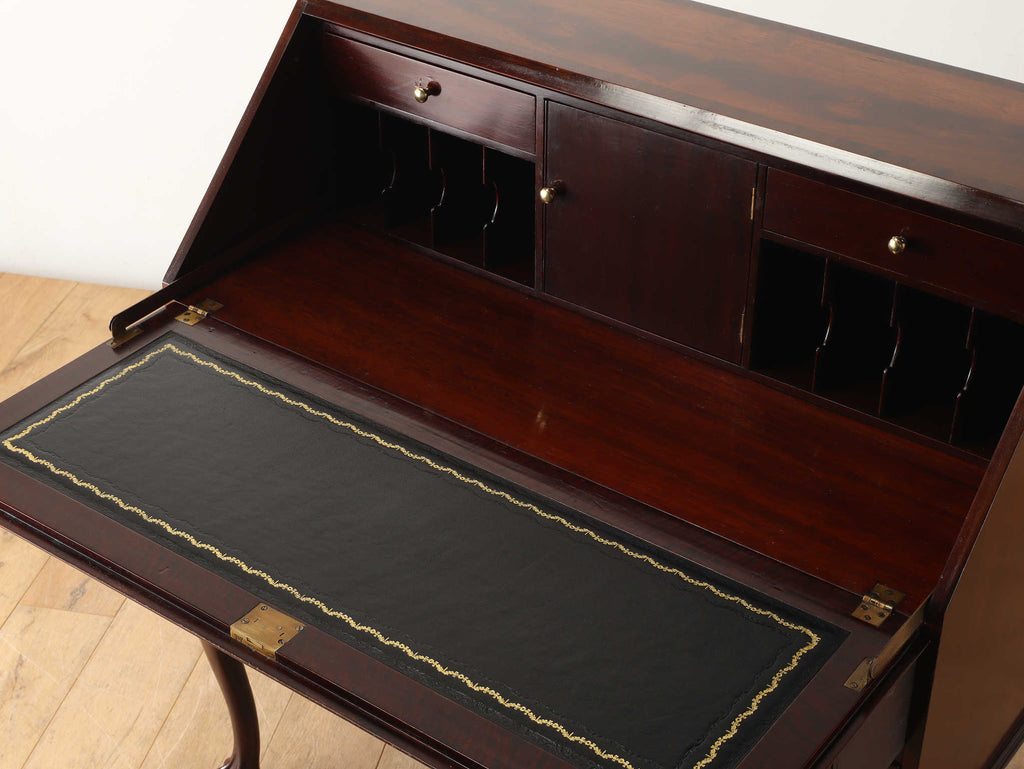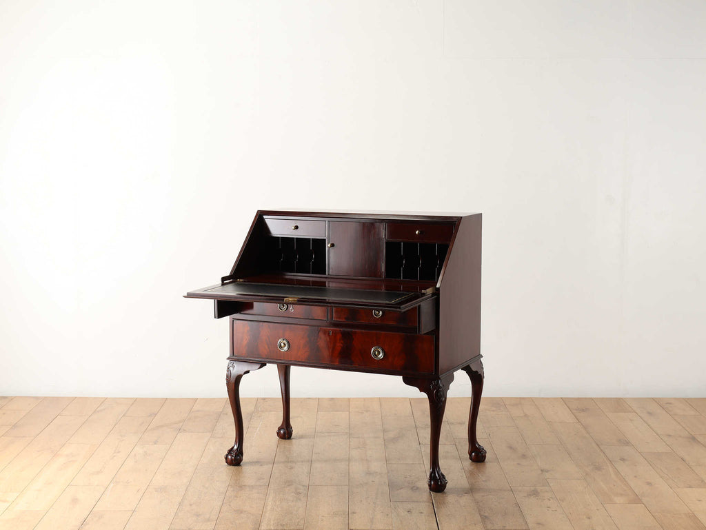 マホガニーの美しい木目が魅力的なビューロー。天板、抽斗には非常に奥ゆかしく美しい木目が広がり、情緒溢れる一品。幅940mmと幅広で、贅沢にお使い頂けます。B&C脚がエレガントさを助長し、存在感のある仕上がりに。しかしながら、下部に生まれたスペースによって圧迫感を感じにくいフォルムとなっています。デスクを開けると、たっぷりと小物の収納が出来る仕切り、抽斗、扉がございます。自分だけのビューローとして、ご自身の色に染めてみては。