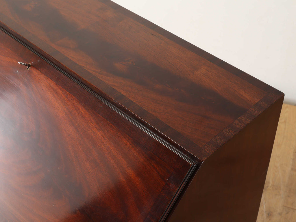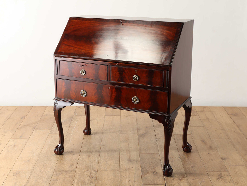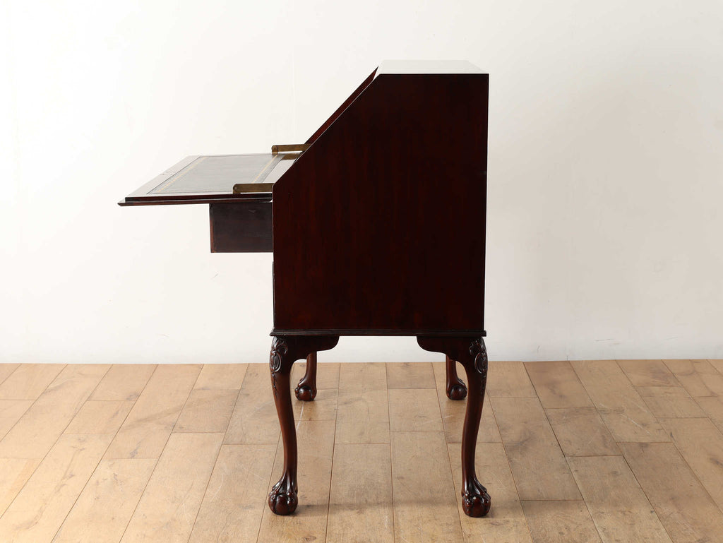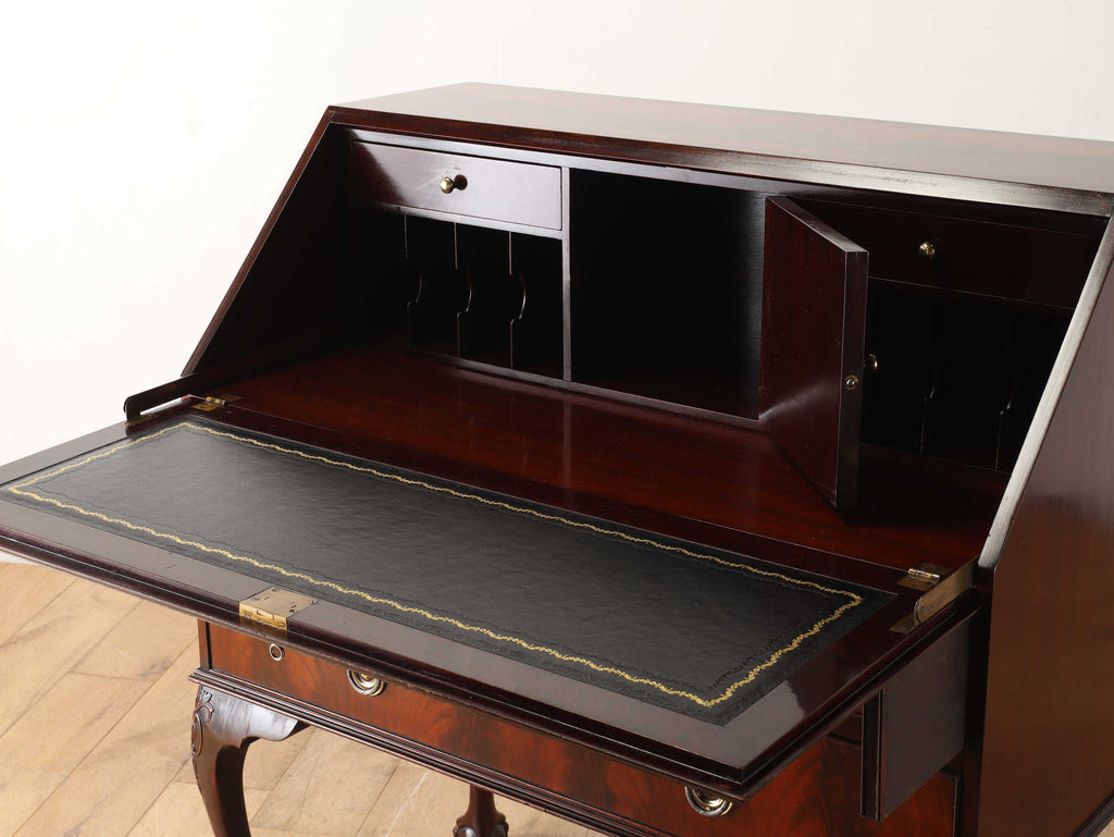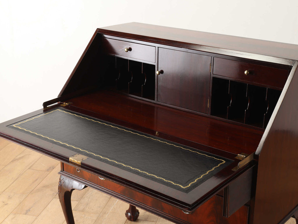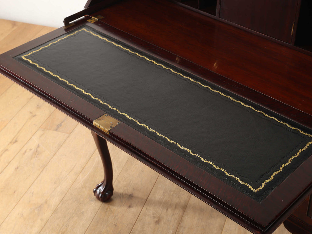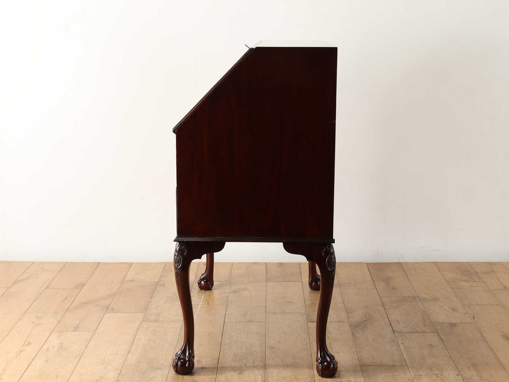 マホガニーの美しい木目が魅力的なビューロー。天板、抽斗には非常に奥ゆかしく美しい木目が広がり、情緒溢れる一品。幅940mmと幅広で、贅沢にお使い頂けます。B&C脚がエレガントさを助長し、存在感のある仕上がりに。しかしながら、下部に生まれたスペースによって圧迫感を感じにくいフォルムとなっています。デスクを開けると、たっぷりと小物の収納が出来る仕切り、抽斗、扉がございます。自分だけのビューローとして、ご自身の色に染めてみては。