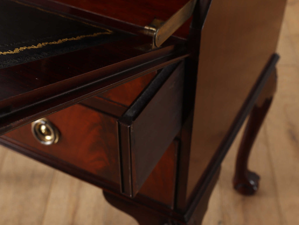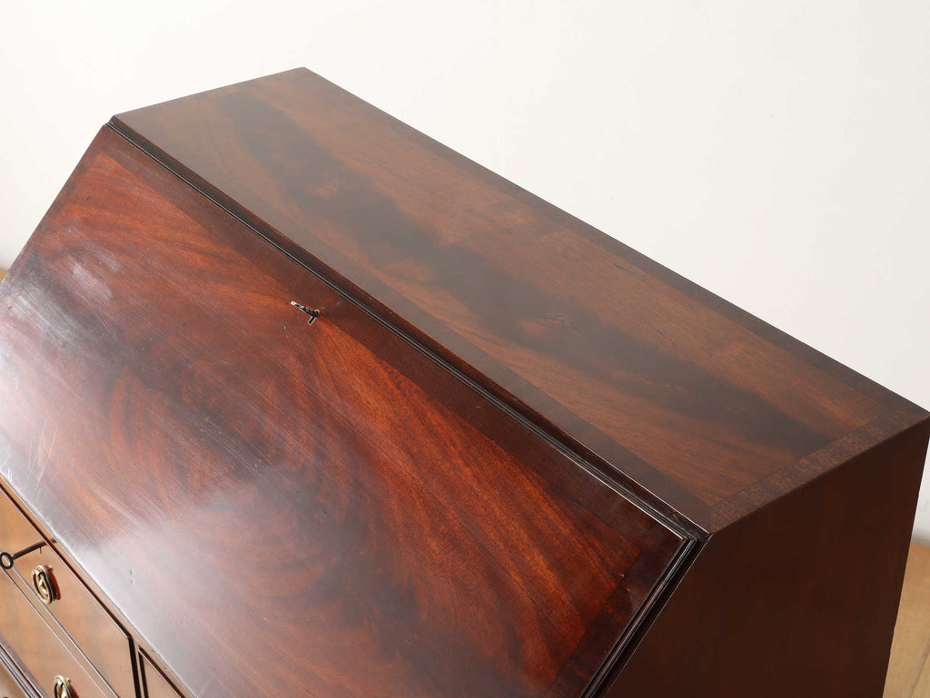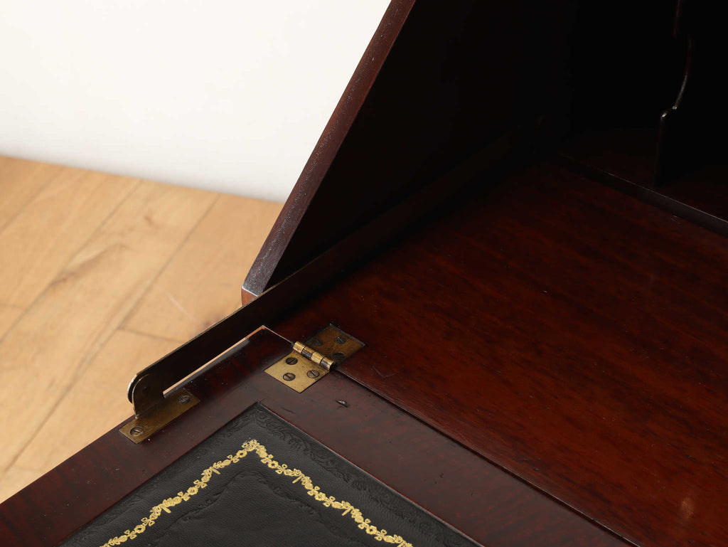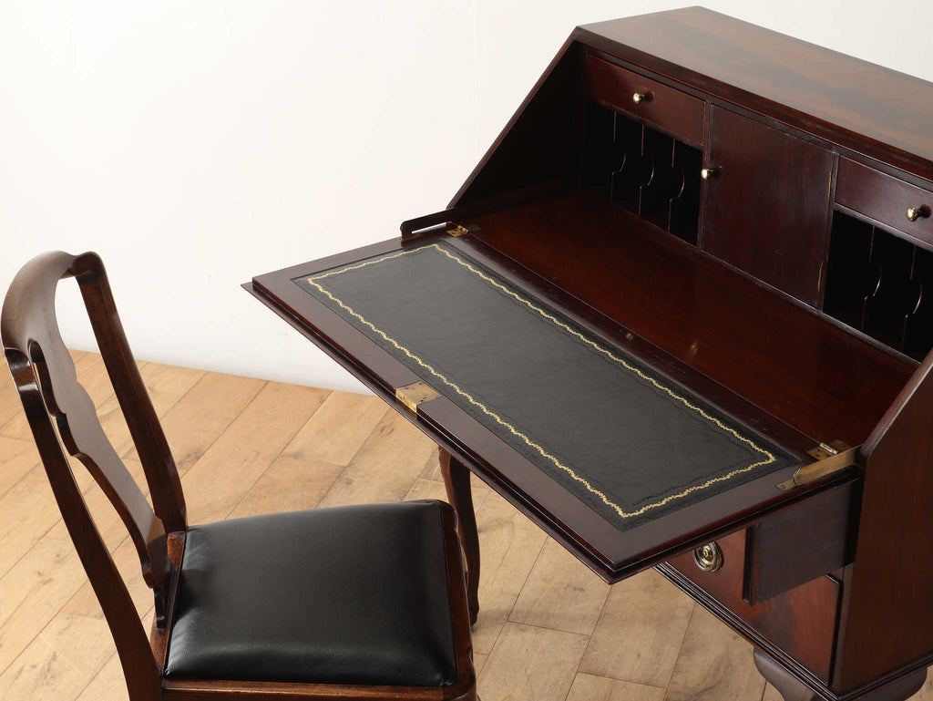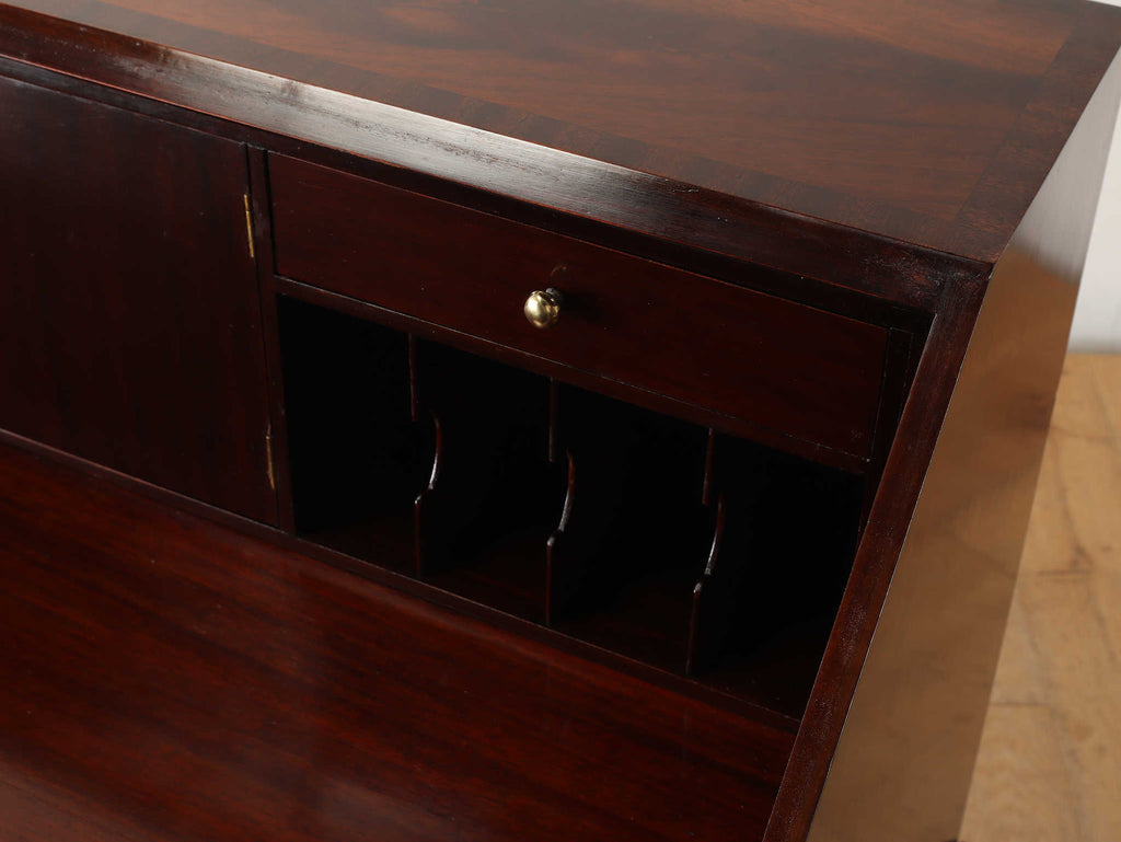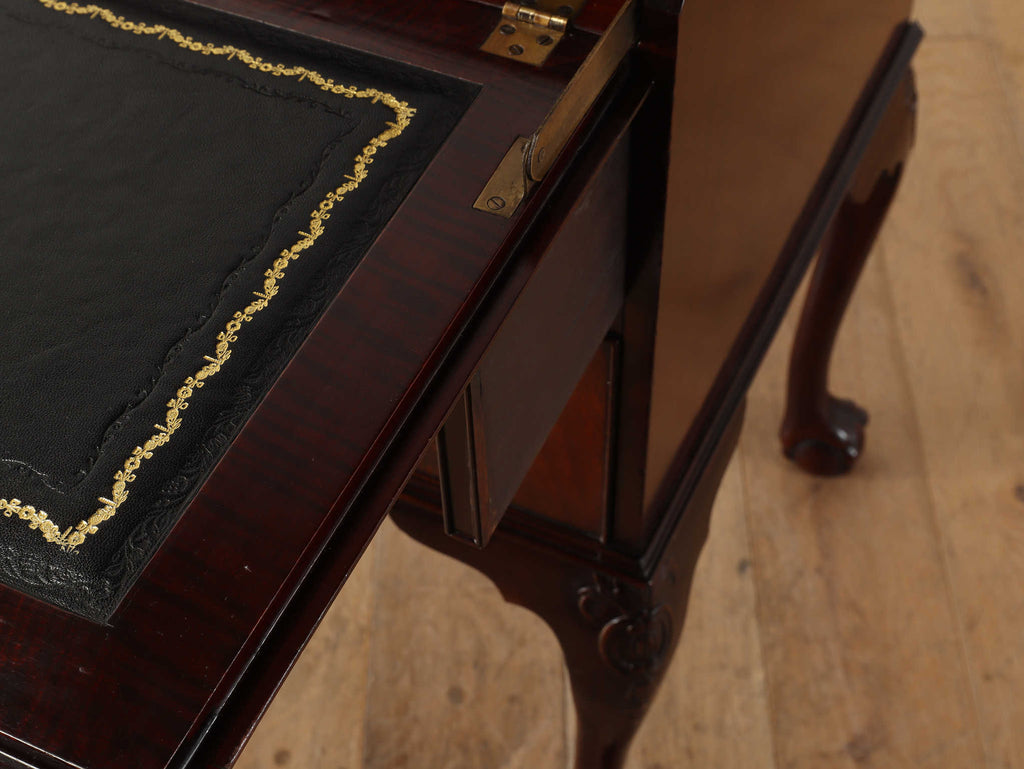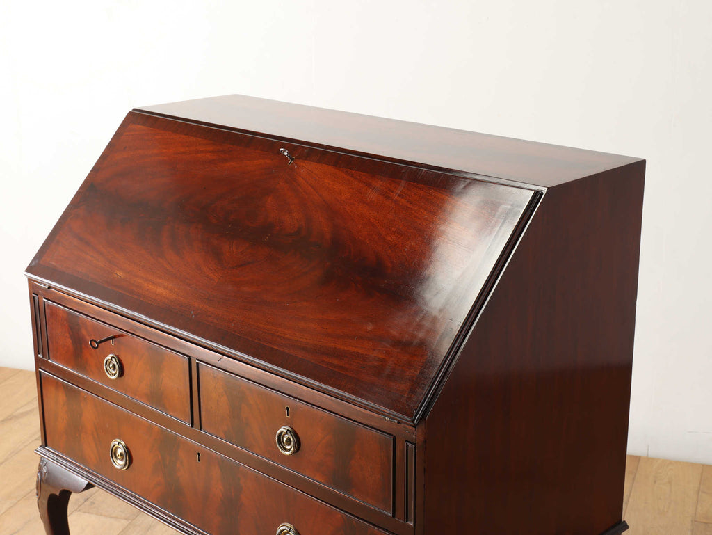 マホガニーの美しい木目が魅力的なビューロー。天板、抽斗には非常に奥ゆかしく美しい木目が広がり、情緒溢れる一品。幅940mmと幅広で、贅沢にお使い頂けます。B&C脚がエレガントさを助長し、存在感のある仕上がりに。しかしながら、下部に生まれたスペースによって圧迫感を感じにくいフォルムとなっています。デスクを開けると、たっぷりと小物の収納が出来る仕切り、抽斗、扉がございます。自分だけのビューローとして、ご自身の色に染めてみては。