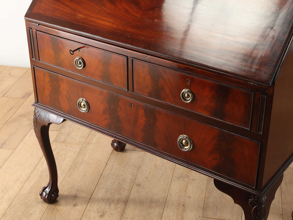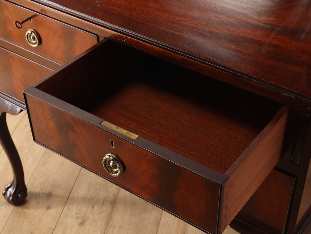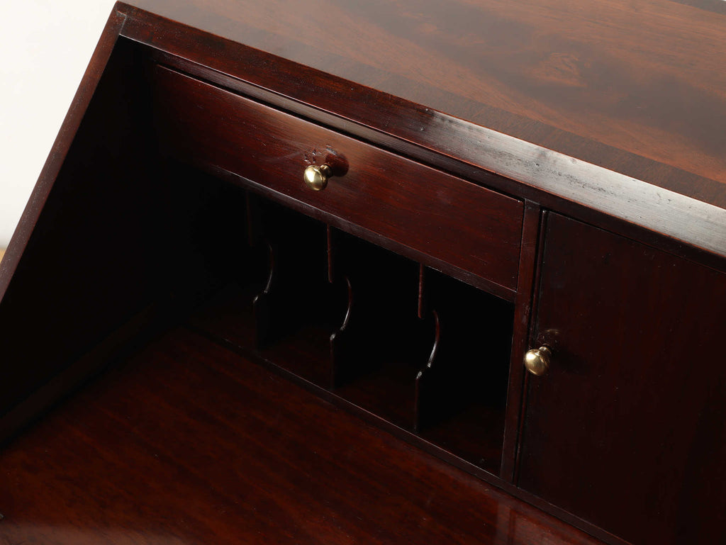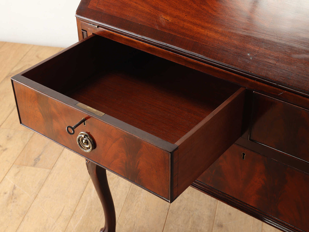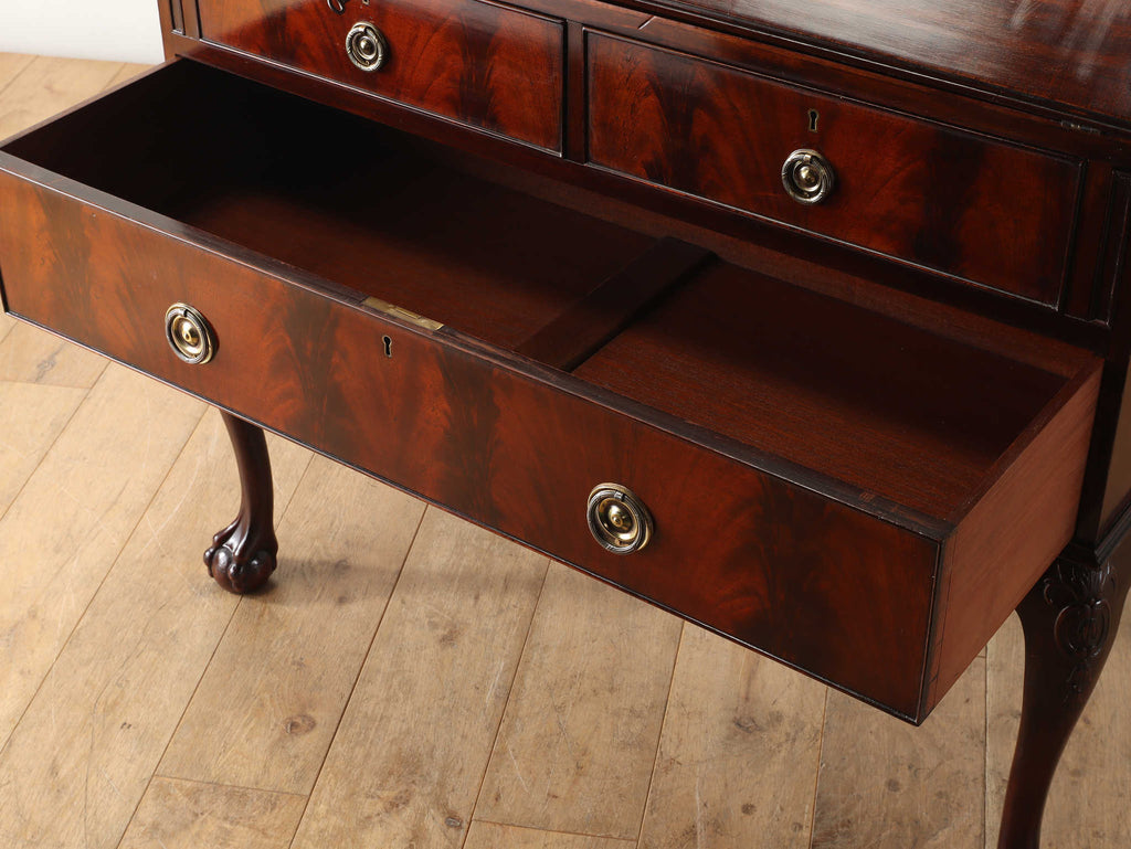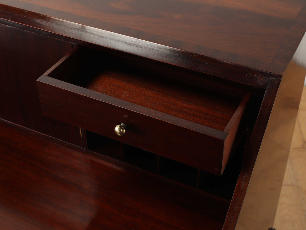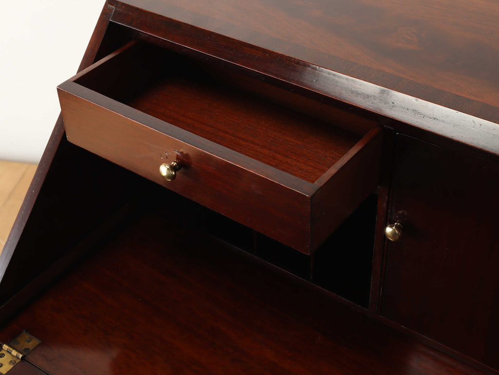 マホガニーの美しい木目が魅力的なビューロー。天板、抽斗には非常に奥ゆかしく美しい木目が広がり、情緒溢れる一品。幅940mmと幅広で、贅沢にお使い頂けます。B&C脚がエレガントさを助長し、存在感のある仕上がりに。しかしながら、下部に生まれたスペースによって圧迫感を感じにくいフォルムとなっています。デスクを開けると、たっぷりと小物の収納が出来る仕切り、抽斗、扉がございます。自分だけのビューローとして、ご自身の色に染めてみては。