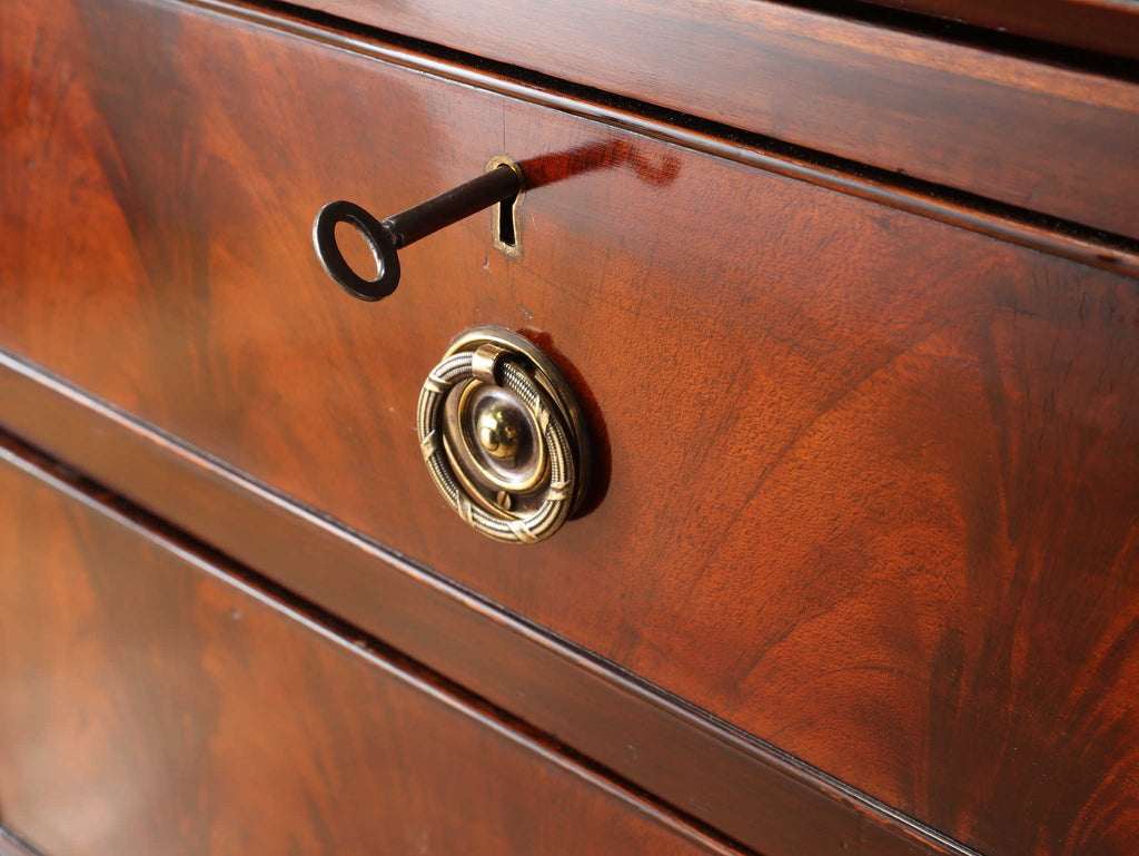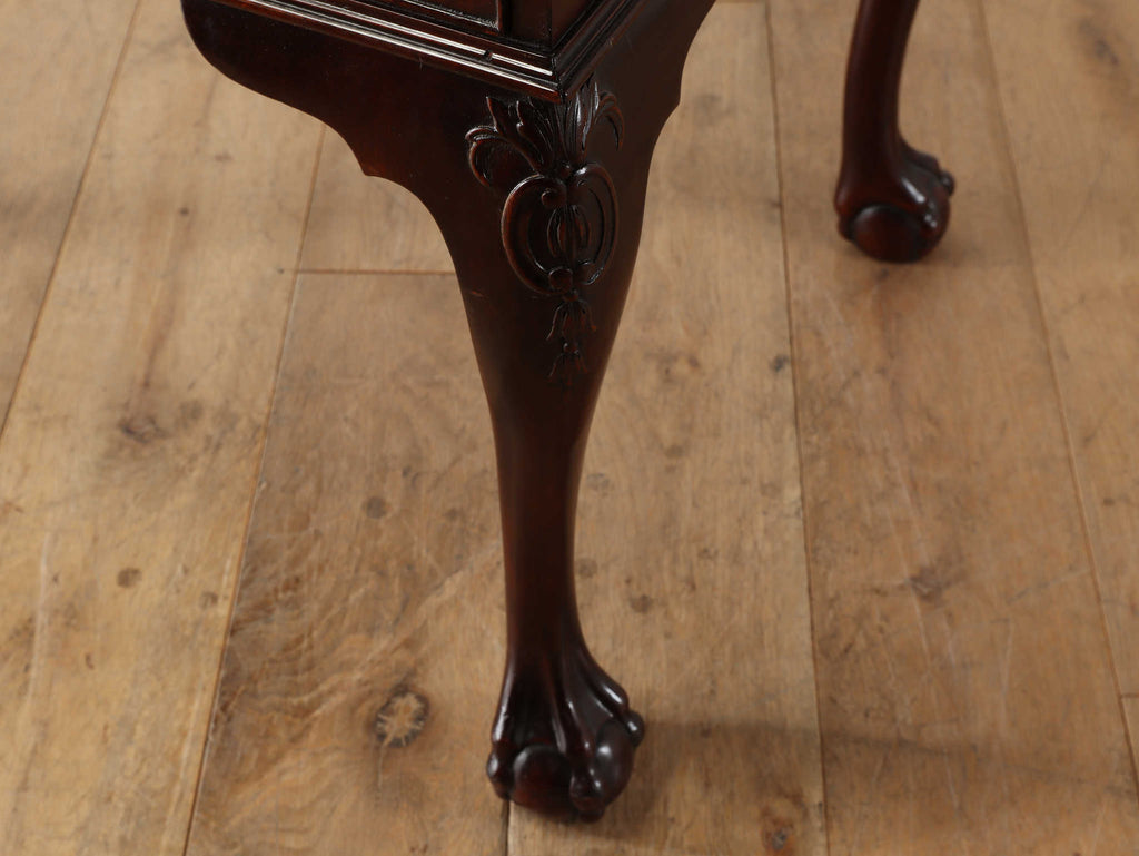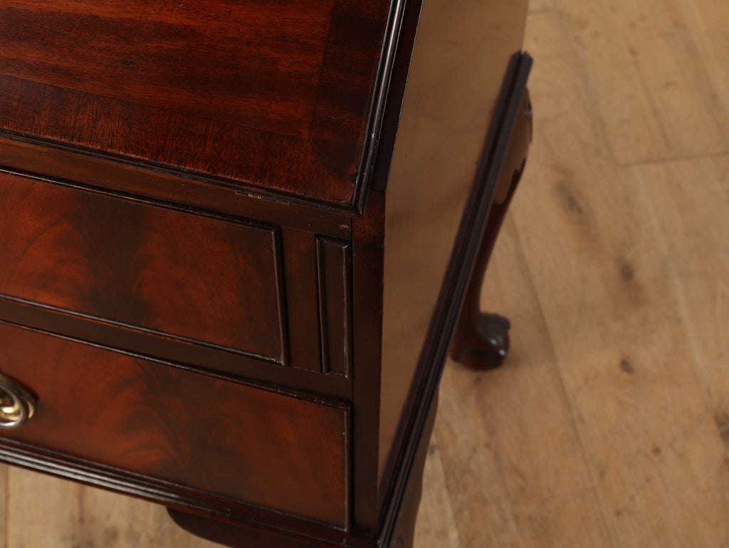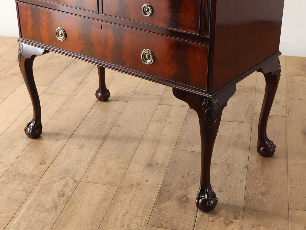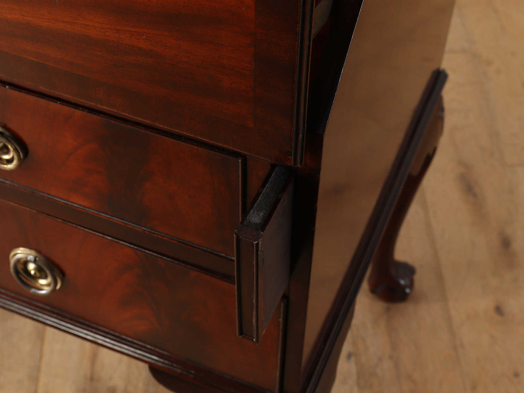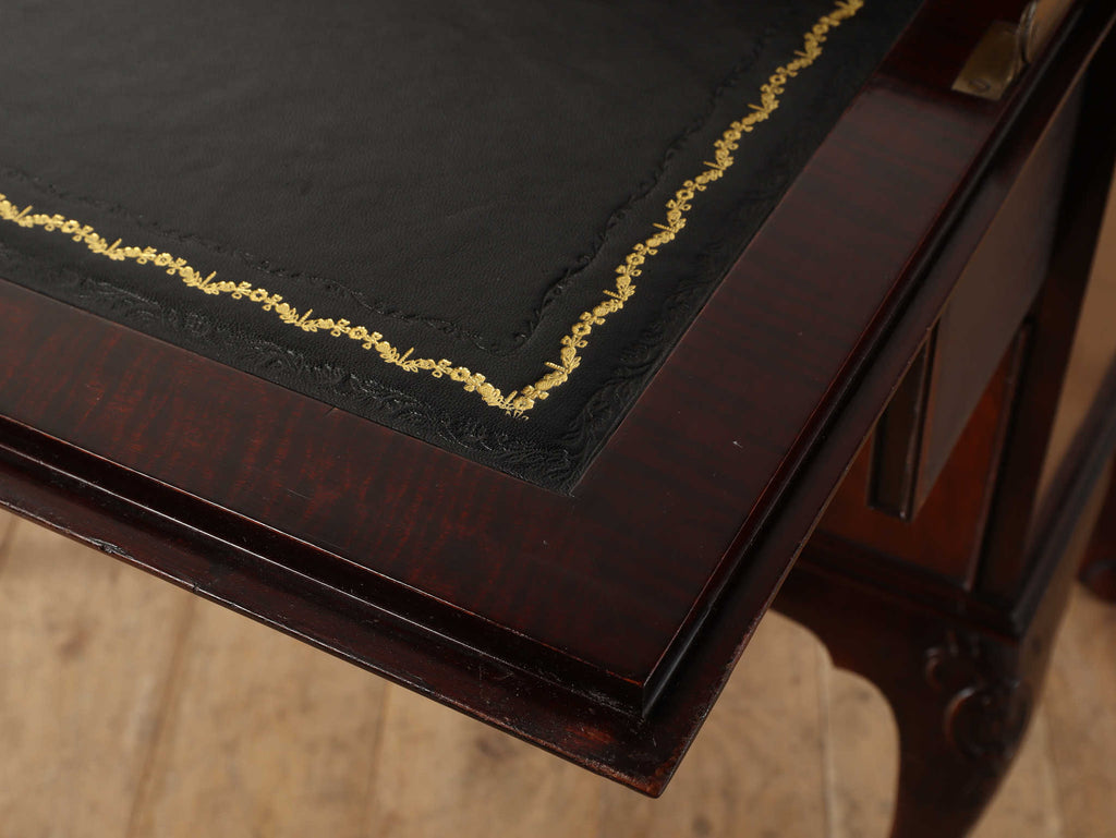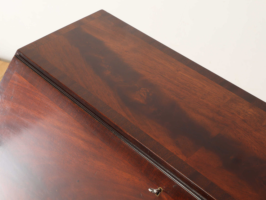 マホガニーの美しい木目が魅力的なビューロー。天板、抽斗には非常に奥ゆかしく美しい木目が広がり、情緒溢れる一品。幅940mmと幅広で、贅沢にお使い頂けます。B&C脚がエレガントさを助長し、存在感のある仕上がりに。しかしながら、下部に生まれたスペースによって圧迫感を感じにくいフォルムとなっています。デスクを開けると、たっぷりと小物の収納が出来る仕切り、抽斗、扉がございます。自分だけのビューローとして、ご自身の色に染めてみては。