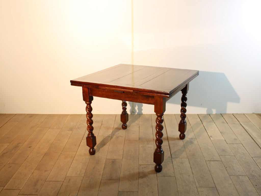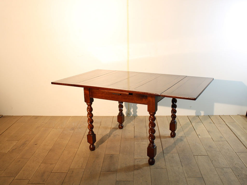 16世紀頃、イギリスで誕生したと言われているドローリーフテーブル。その名の通り、天板下に備えられたサブ天板を広げる事で天板の大きさを変える事の出来るものです。この一台の様におよそ900×900の正方形でつくられたものが一般的で、主に杢目や脚部のデザインに個性が出ます。天板に見られる溝は、無垢材に特有の湿気や乾燥による膨張を見越した「あそび」であり、長い年月使用する事が前提となっています。日々の生活が味わいとなって天板に現れるため、使う程に愛着が湧くこと請け合いのアイテムでしょう。