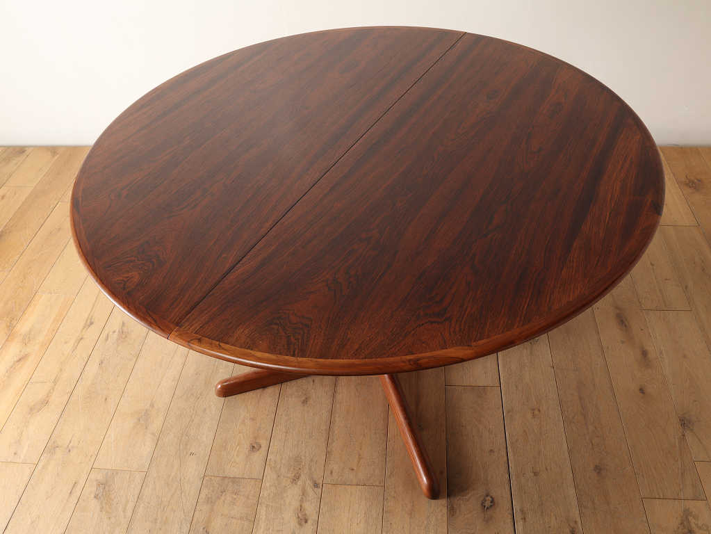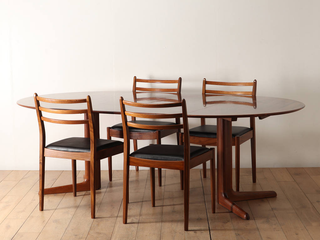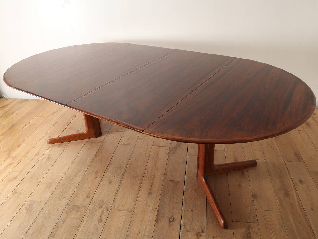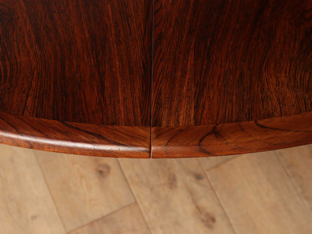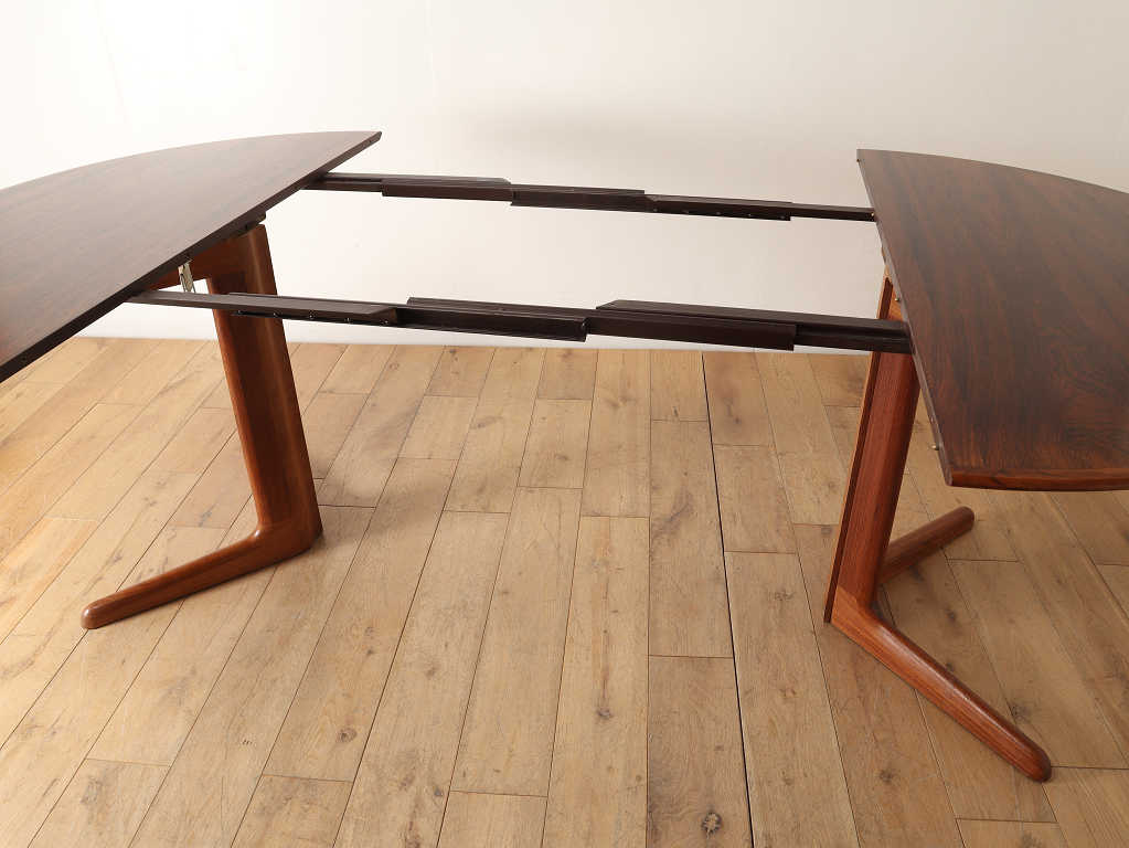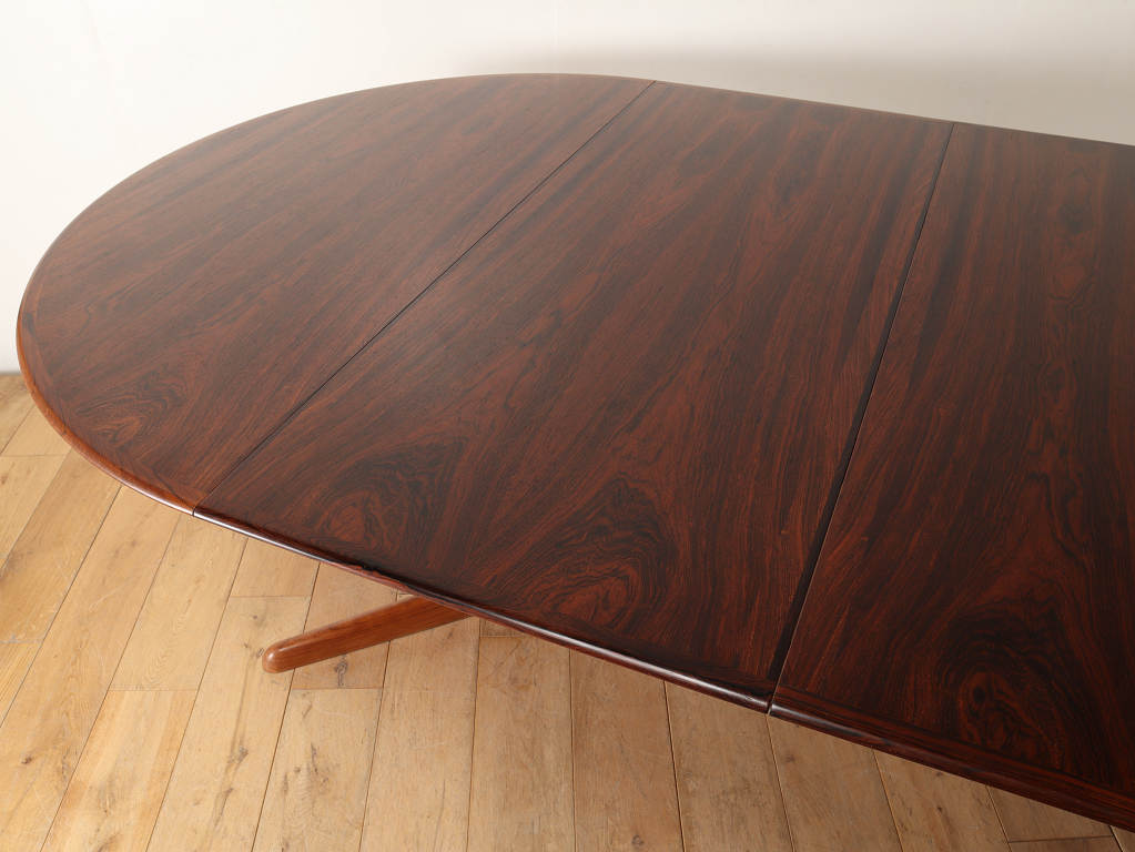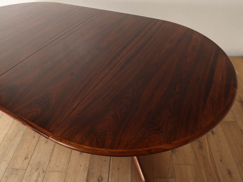 幅1200mmのオーバルから天板を2枚入れることにより、2220mmまで大きくなる伸長式のダイニングテーブルです。角の無い丸いテーブルに、中央に配置された脚は、人数に縛られることなく使用することができ、来客の際なども使い勝手の良いデザインです。シンプルなデザインはその美しいローズウッド材の杢目をより存分に楽しむことができます。