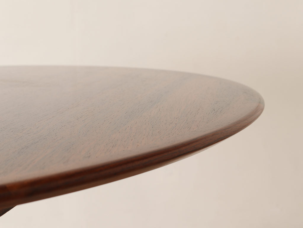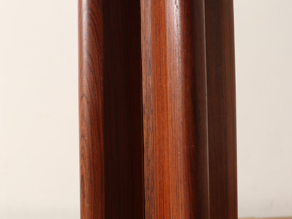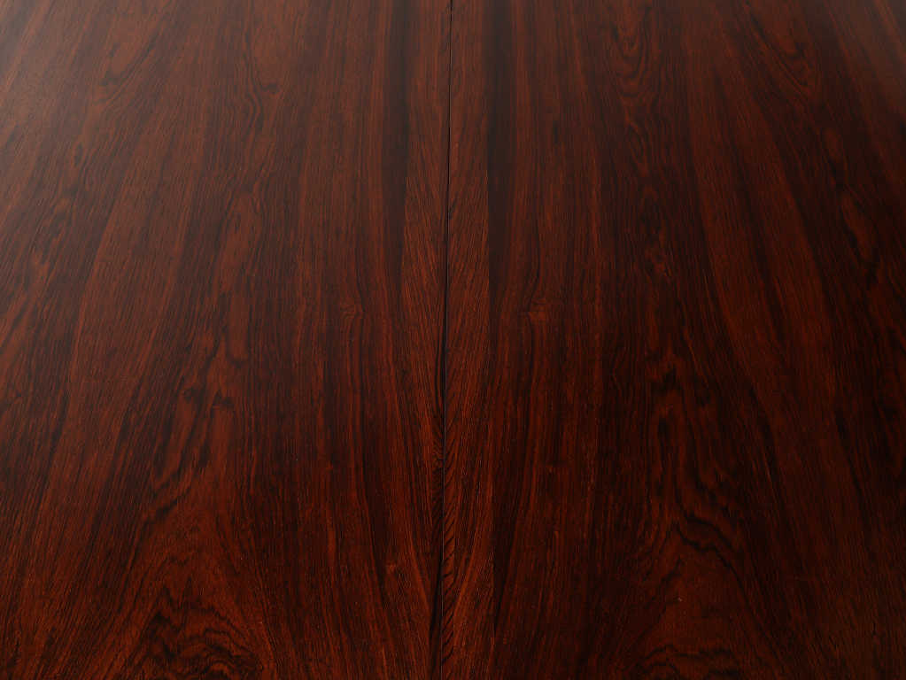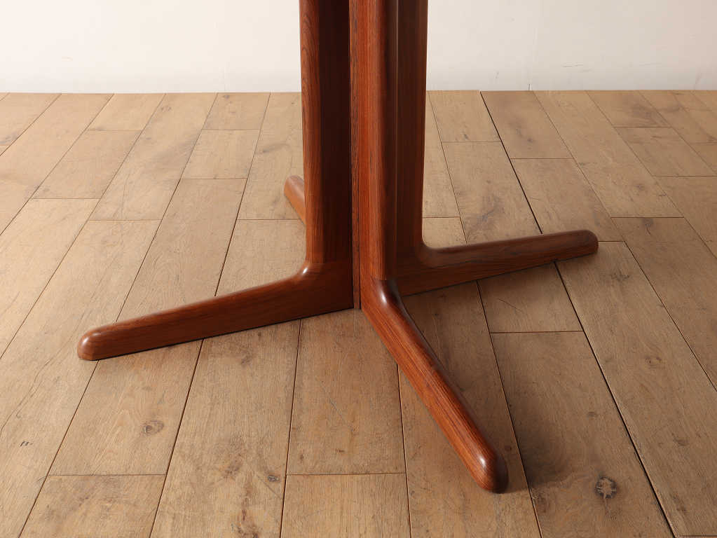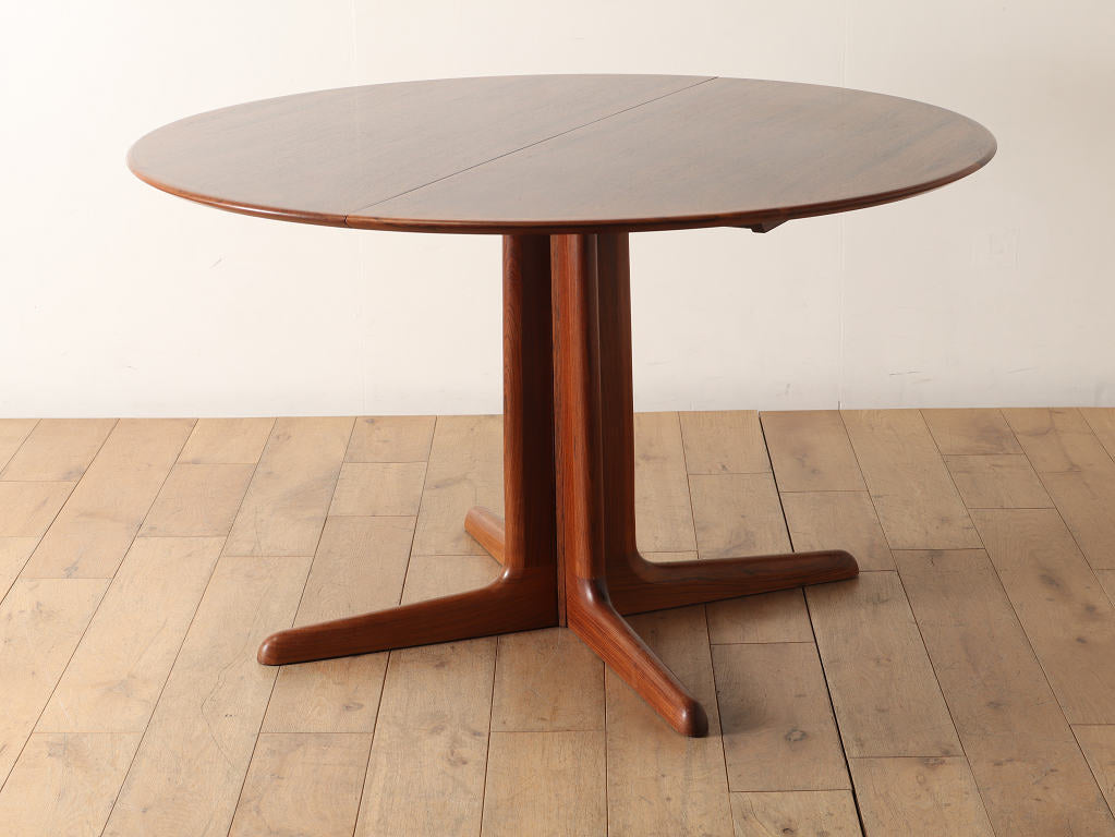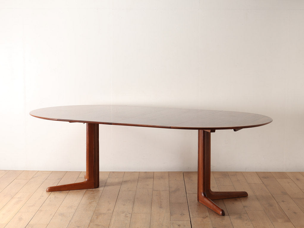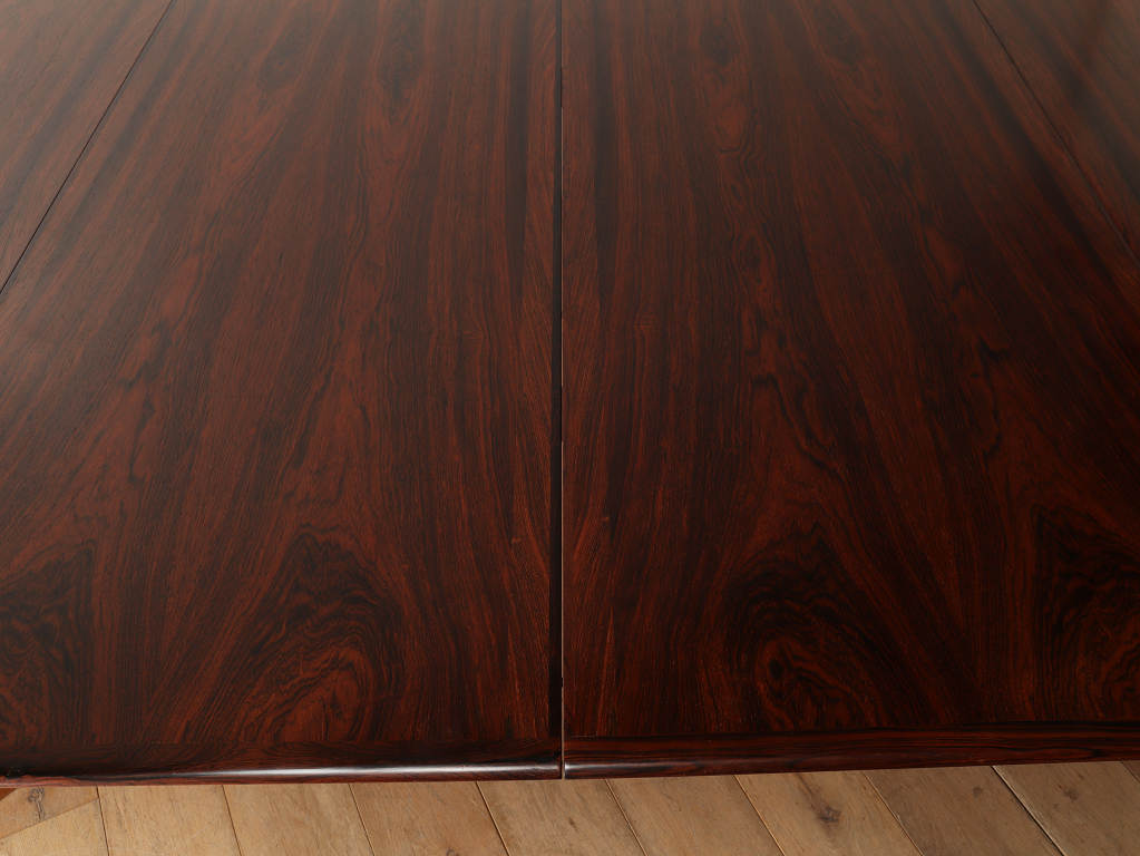幅1200mmのオーバルから天板を2枚入れることにより、2220mmまで大きくなる伸長式のダイニングテーブルです。角の無い丸いテーブルに、中央に配置された脚は、人数に縛られることなく使用することができ、来客の際なども使い勝手の良いデザインです。シンプルなデザインはその美しいローズウッド材の杢目をより存分に楽しむことができます。