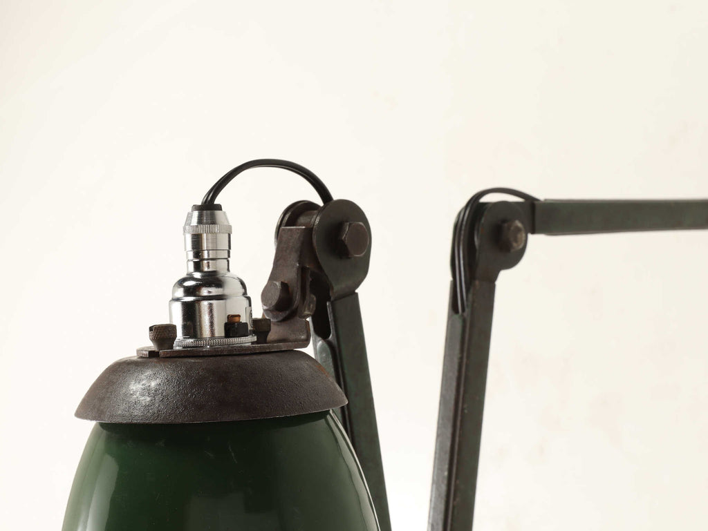 絶妙な緑色に目を惹かれるランプ。ワークランプは夜間や悪天候の視界が悪い状況で作業する際に使用されていました。エナメルの深い艶はインダストリアルな雰囲気のお部屋だけでなくクラシック、モダンスタイルにアクセントとして取り入れていただけます。角度調節が可能な為、作業用やスポットライトとしても活躍します。