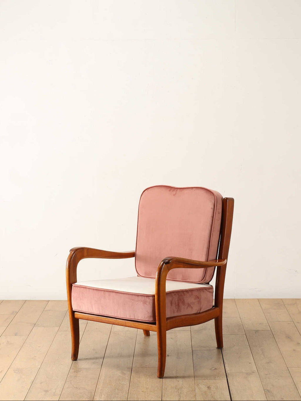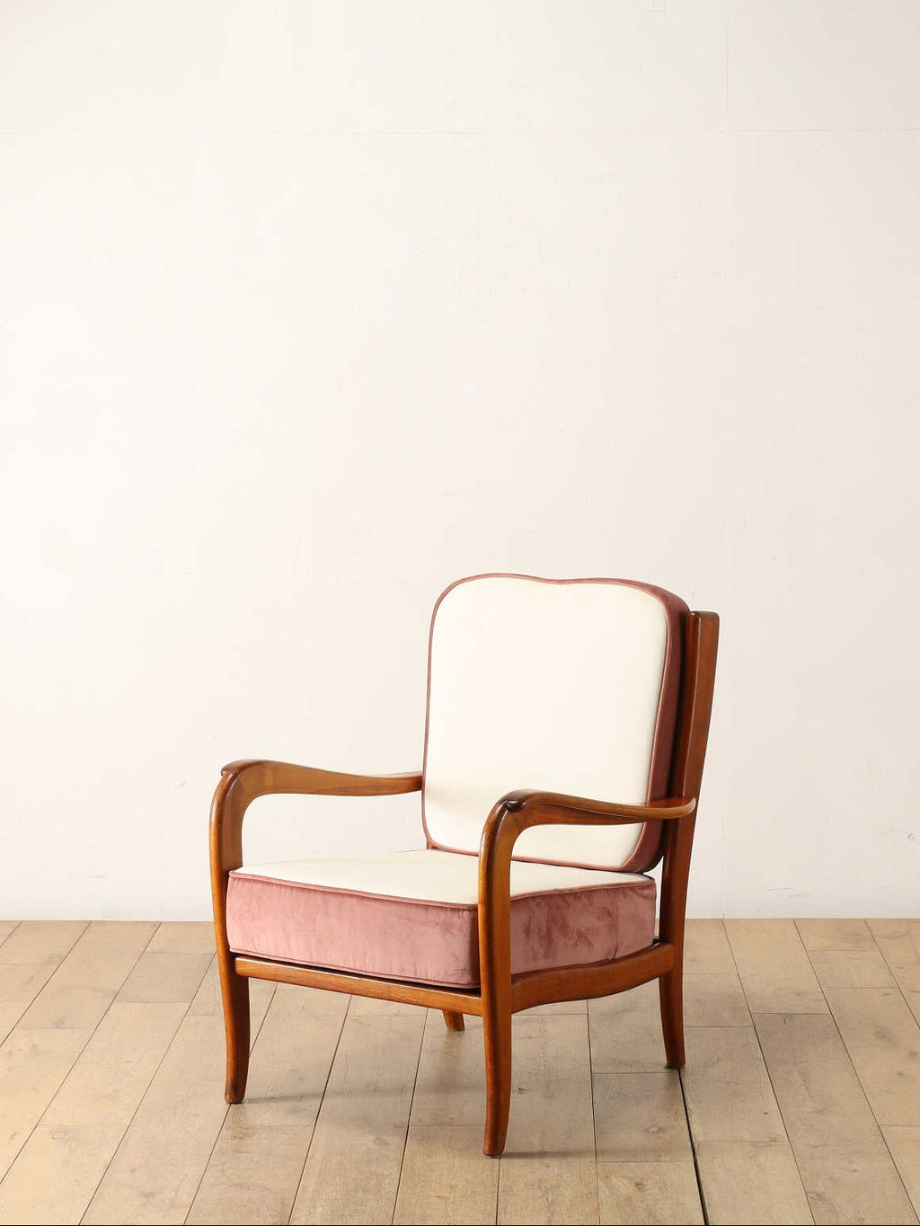 1950年代(推定)イタリアヴィンテージのイージーチェアです。エッジの効いたデザインが多い同カテゴリーですが、こちらは美しいデザインの中にもどこか素朴さや温かさを感じ、フレンチモダンのような質感を感じられます。バックフレームは北欧ヴィンテージを彷彿とさせ、様々な要素が混在するキャラクター性に溢れるプロダクです。2トーンのファブリックで張替えを行い、モダンで軽やかな要素をプラスしました。【ファブリック】