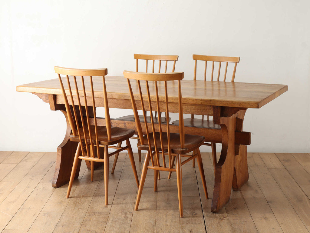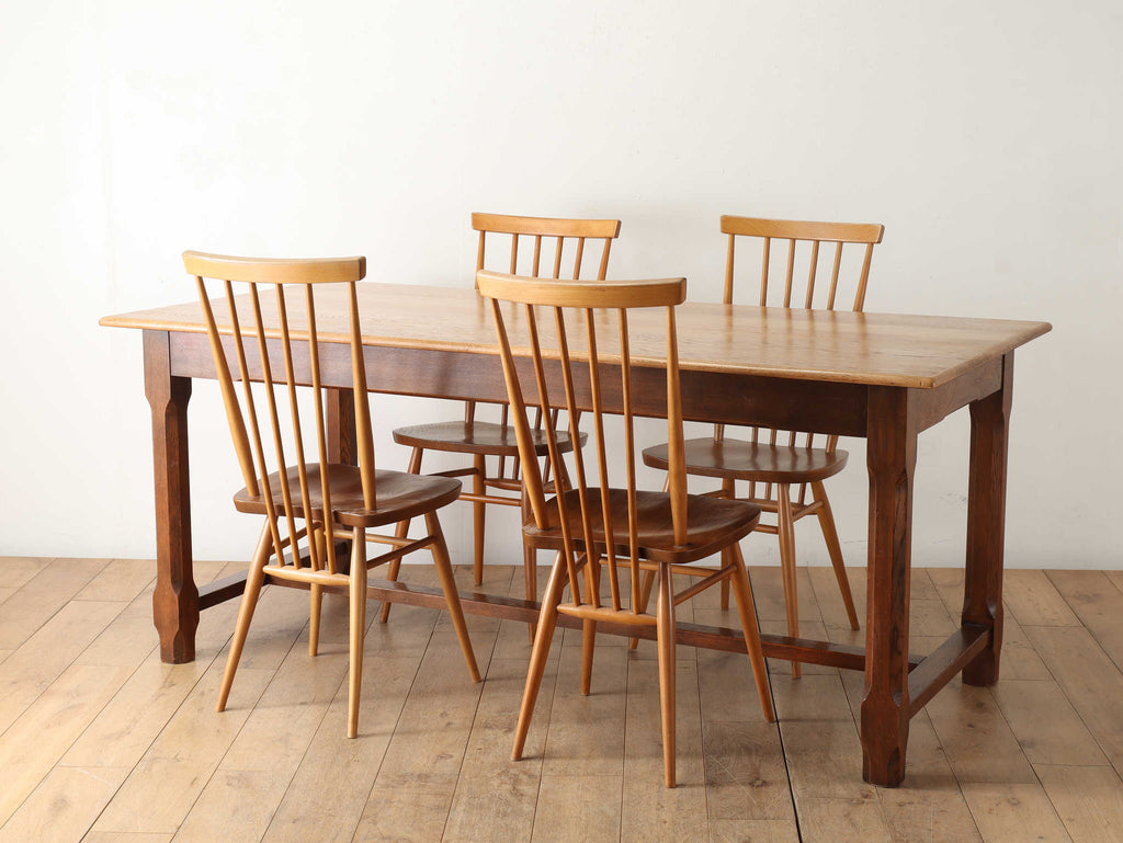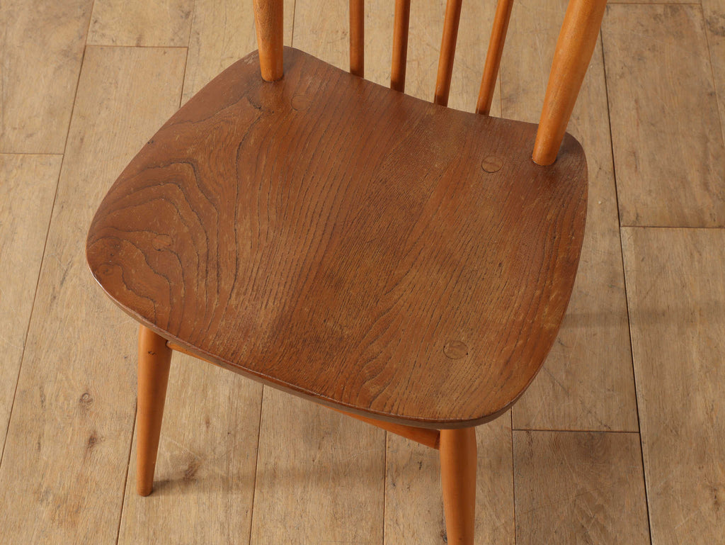 ヴィンテージ家具の中でも人気の高いERCOL社のチェア。堅く丈夫なエルムとビーチにて組まれており、蒸気をあて曲げながら形作られたデザインです。八の字にひらいたような脚のデザインで、背もたれ側がほんの少し下がるように角度がついており、自然と背を預けやすい構造になっています。ヴィンテージのERCOLは年々数が少なくなっている為、インテリアとしてもお勧めです。