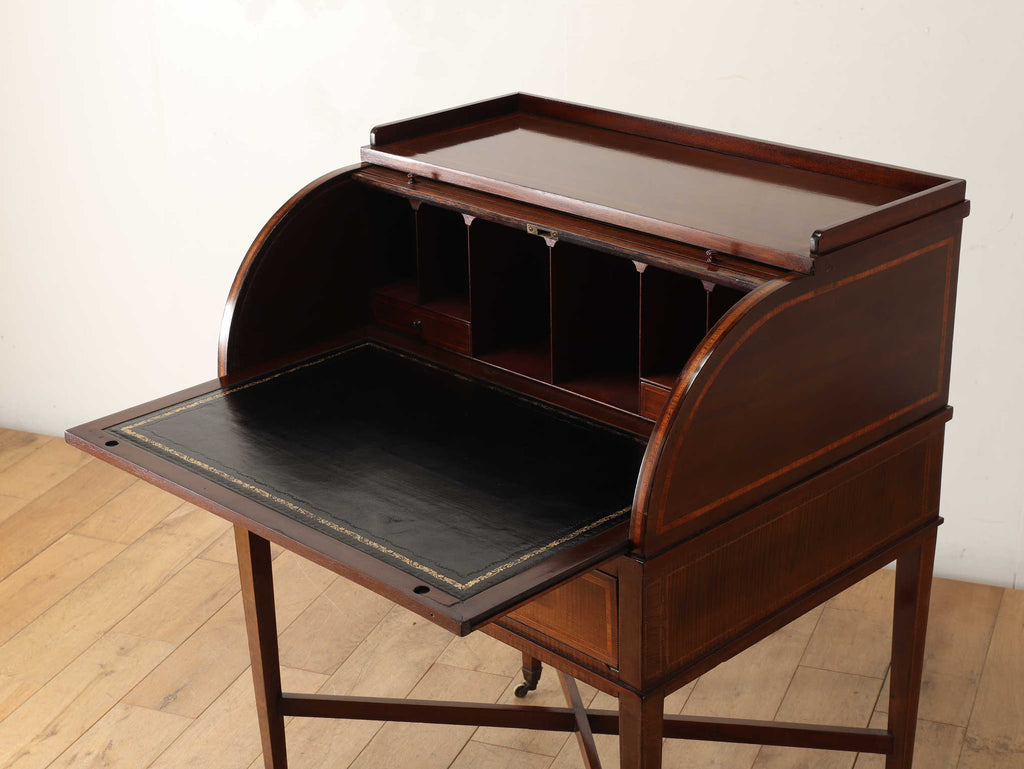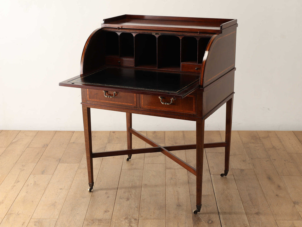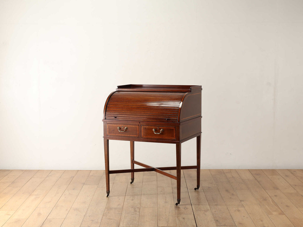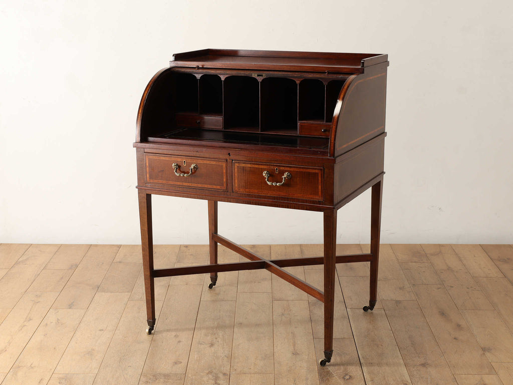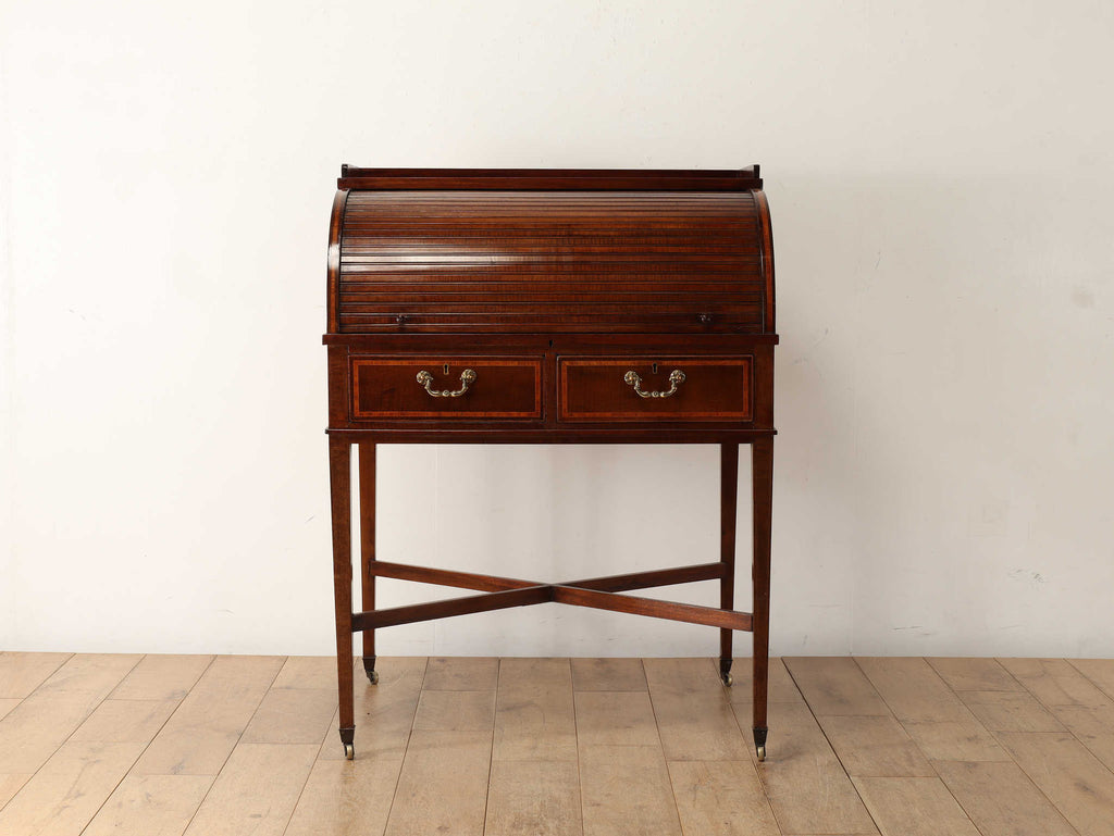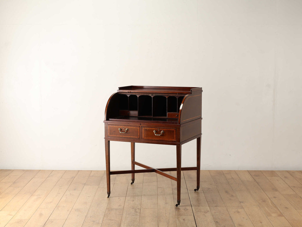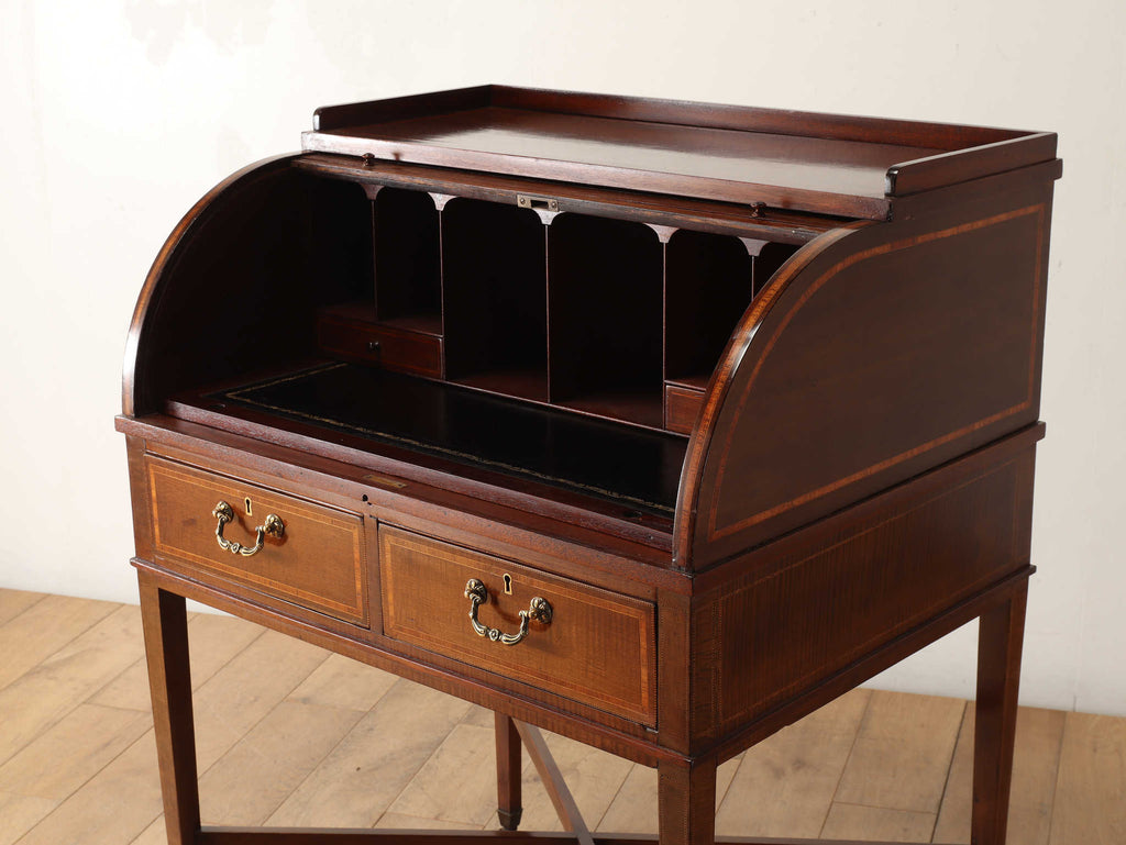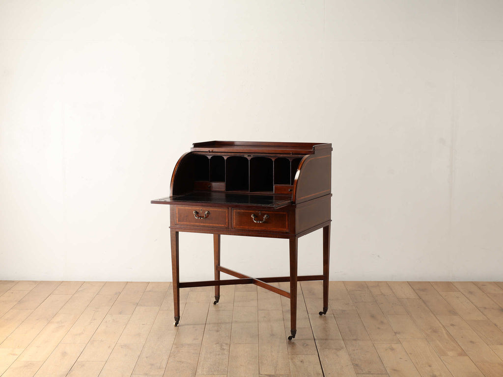 1910年代推定、イギリス製、要所に象嵌加工が施されたエドウォーディアン期のクオリティの高い、ビューローです。シンプルながらも良いマホガニー素材を使用しており、褐色に落ち着いた経年変化からは時代の流れと風合いを感じることができます。ロールトップ型のビューローは現在ではとても少なく、良いコンディションで入荷するのも珍しいです。開口部からの天板はイギリスでオーダーしたレザーで新しく張り替えられており、実用性も十分です。クラシックの空気を纏っていますが、そのシンプルなデザインからモダンな空間でも存在感を示してくれるでしょう。上部天板:W740/D295 引き出した際のデスク天板:W715/D495
