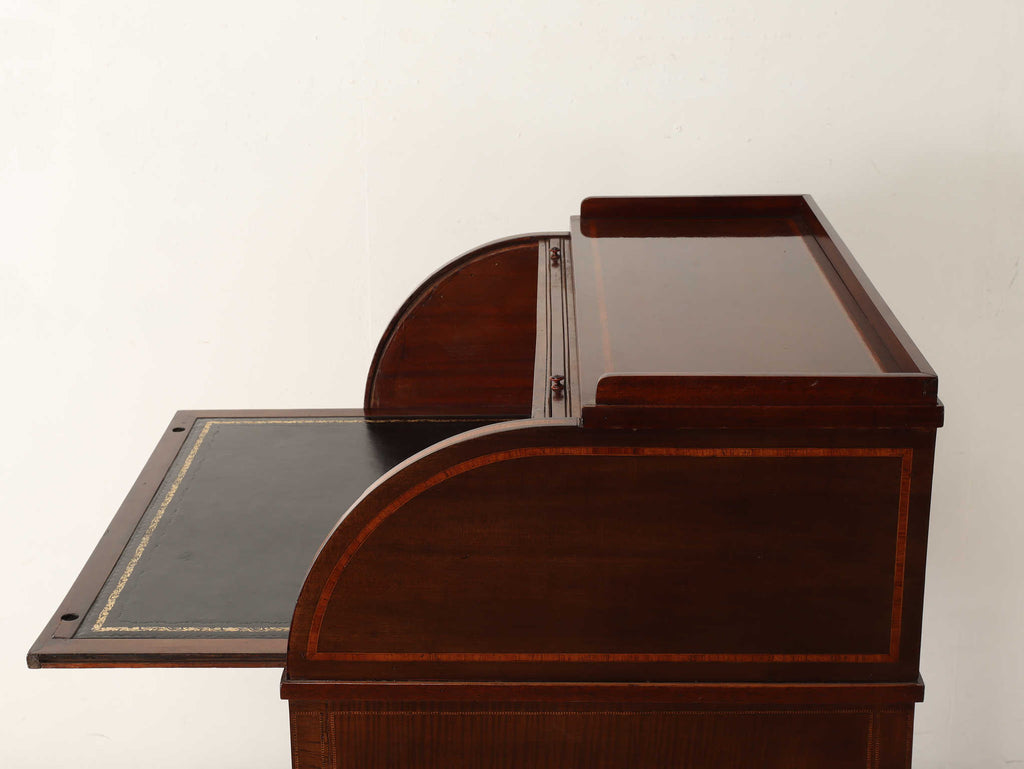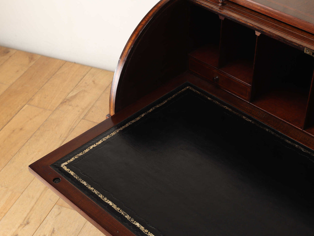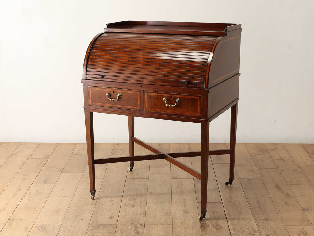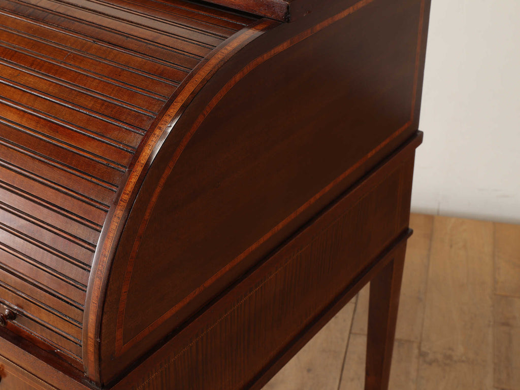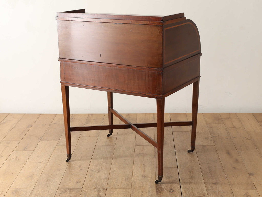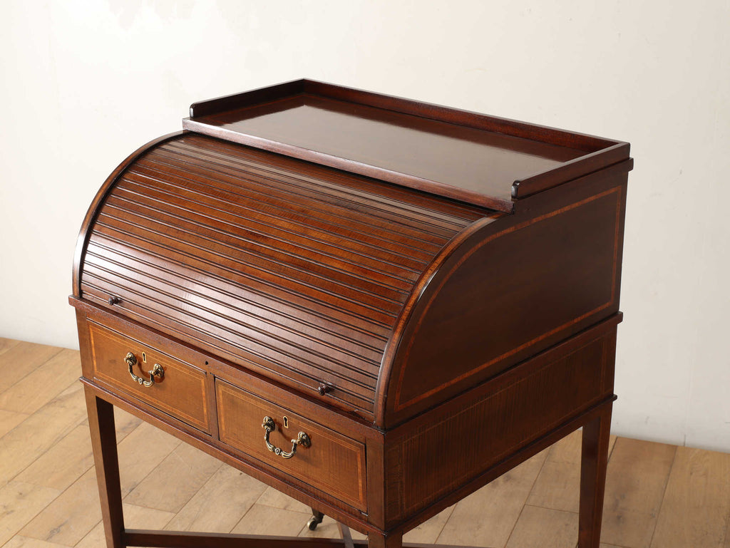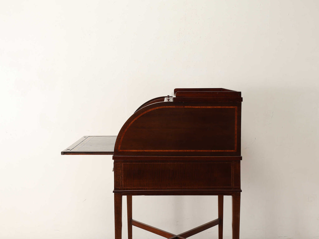 1910年代推定、イギリス製、要所に象嵌加工が施されたエドウォーディアン期のクオリティの高い、ビューローです。シンプルながらも良いマホガニー素材を使用しており、褐色に落ち着いた経年変化からは時代の流れと風合いを感じることができます。ロールトップ型のビューローは現在ではとても少なく、良いコンディションで入荷するのも珍しいです。開口部からの天板はイギリスでオーダーしたレザーで新しく張り替えられており、実用性も十分です。クラシックの空気を纏っていますが、そのシンプルなデザインからモダンな空間でも存在感を示してくれるでしょう。上部天板:W740/D295 引き出した際のデスク天板:W715/D495