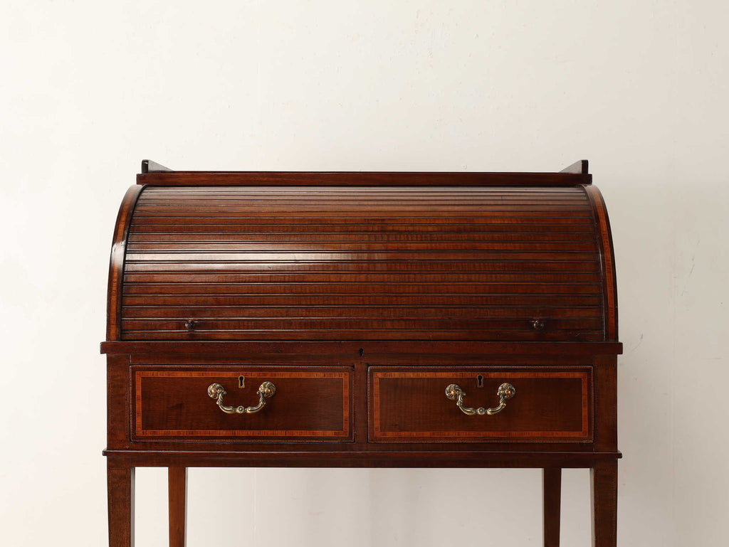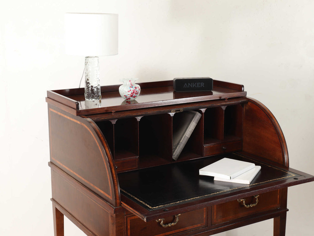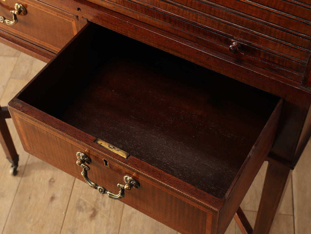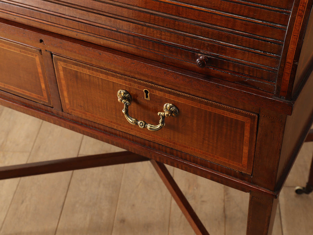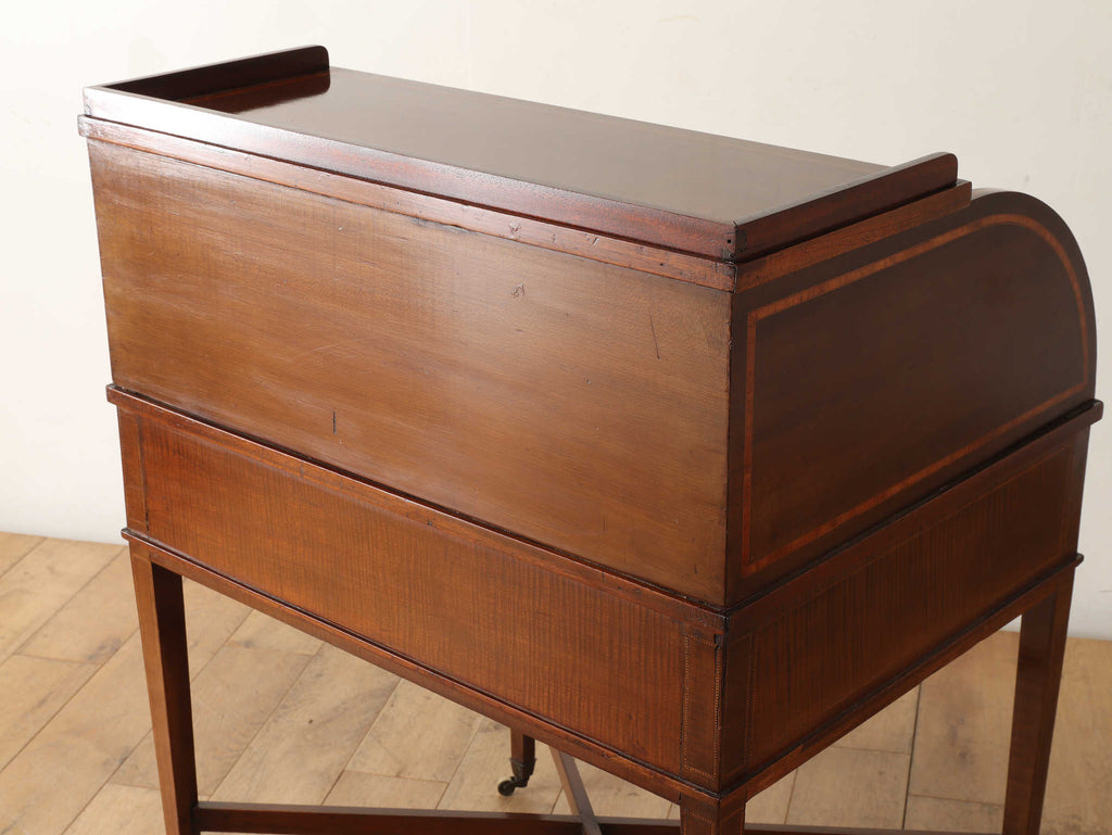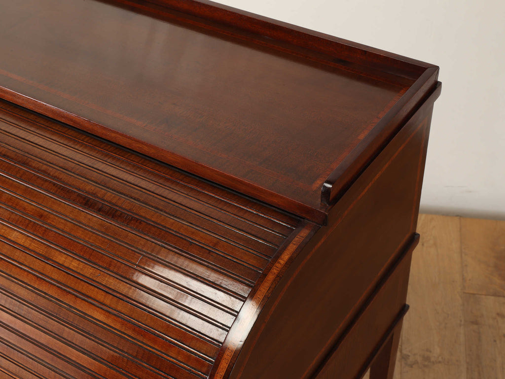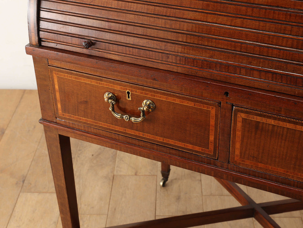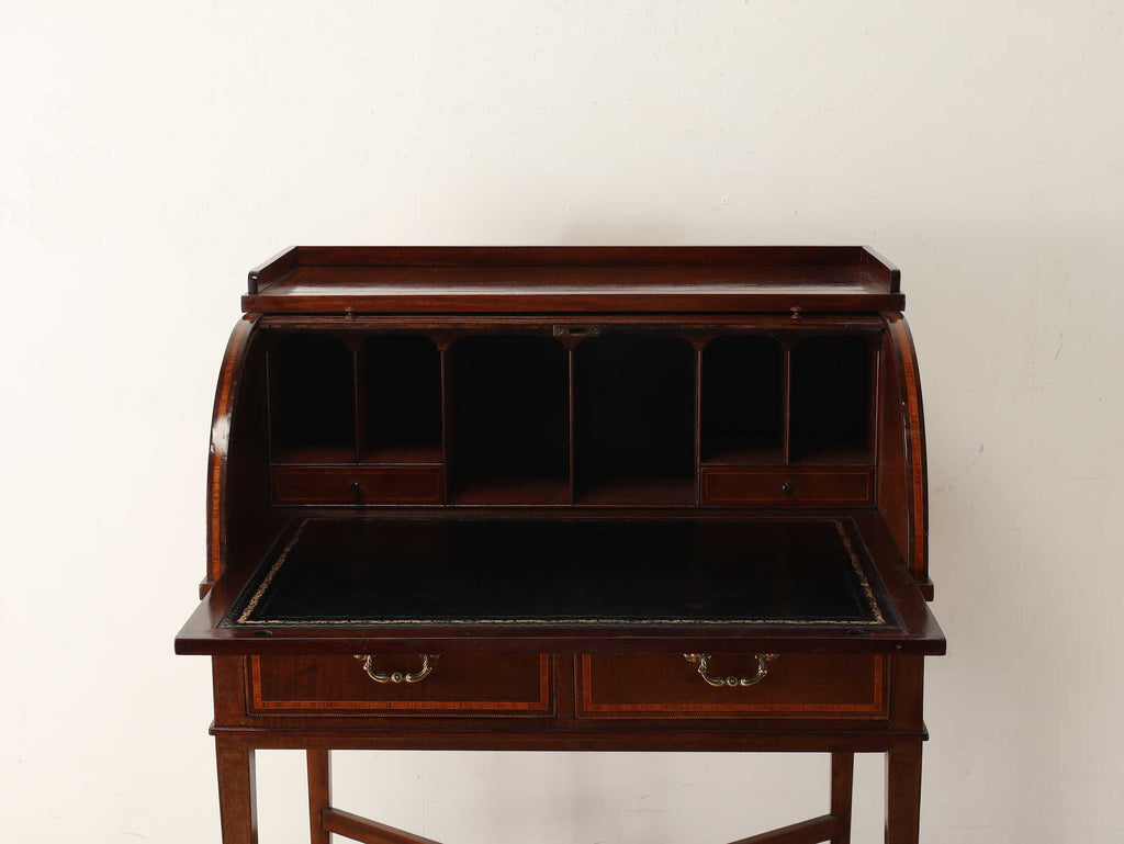 1910年代推定、イギリス製、要所に象嵌加工が施されたエドウォーディアン期のクオリティの高い、ビューローです。シンプルながらも良いマホガニー素材を使用しており、褐色に落ち着いた経年変化からは時代の流れと風合いを感じることができます。ロールトップ型のビューローは現在ではとても少なく、良いコンディションで入荷するのも珍しいです。開口部からの天板はイギリスでオーダーしたレザーで新しく張り替えられており、実用性も十分です。クラシックの空気を纏っていますが、そのシンプルなデザインからモダンな空間でも存在感を示してくれるでしょう。上部天板:W740/D295 引き出した際のデスク天板:W715/D495
