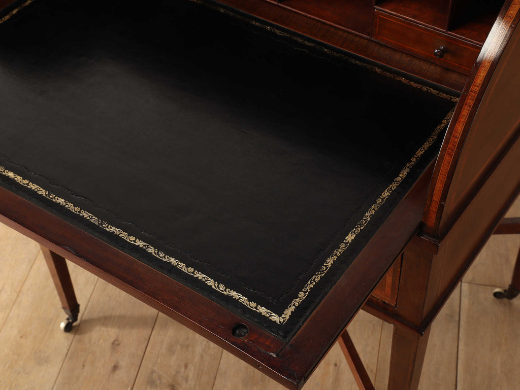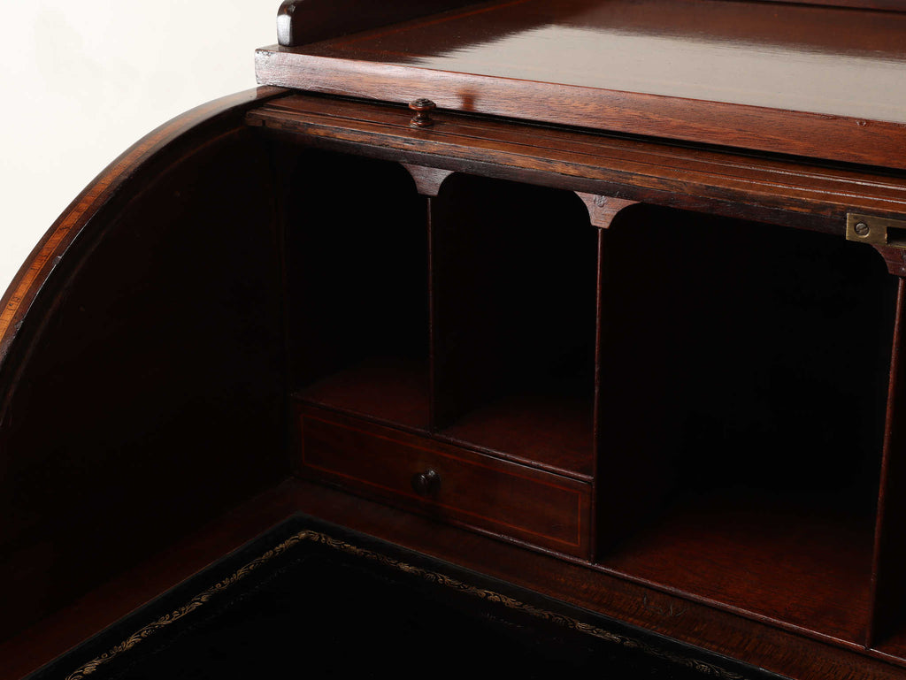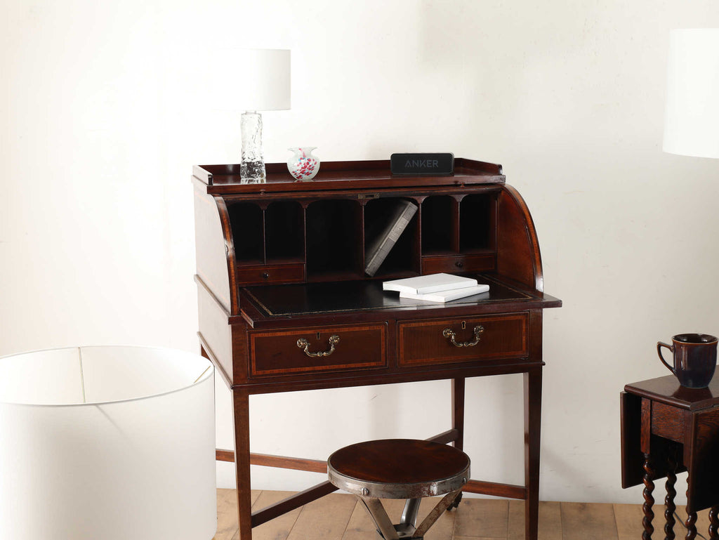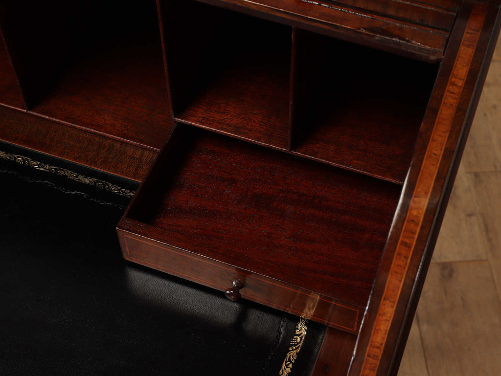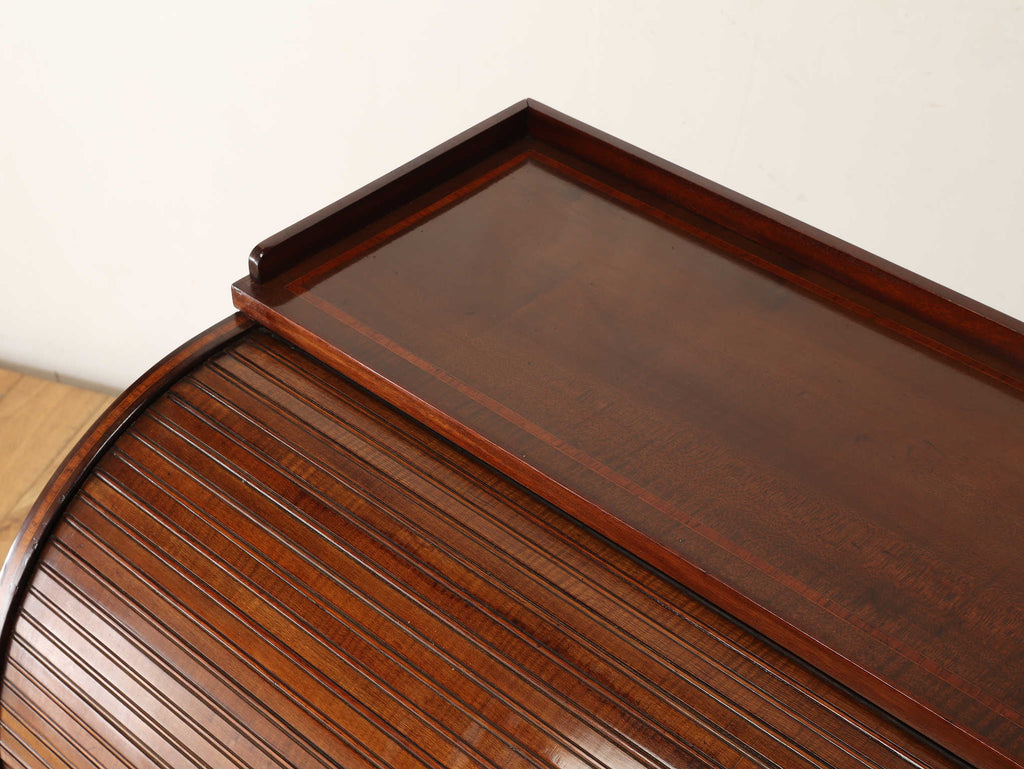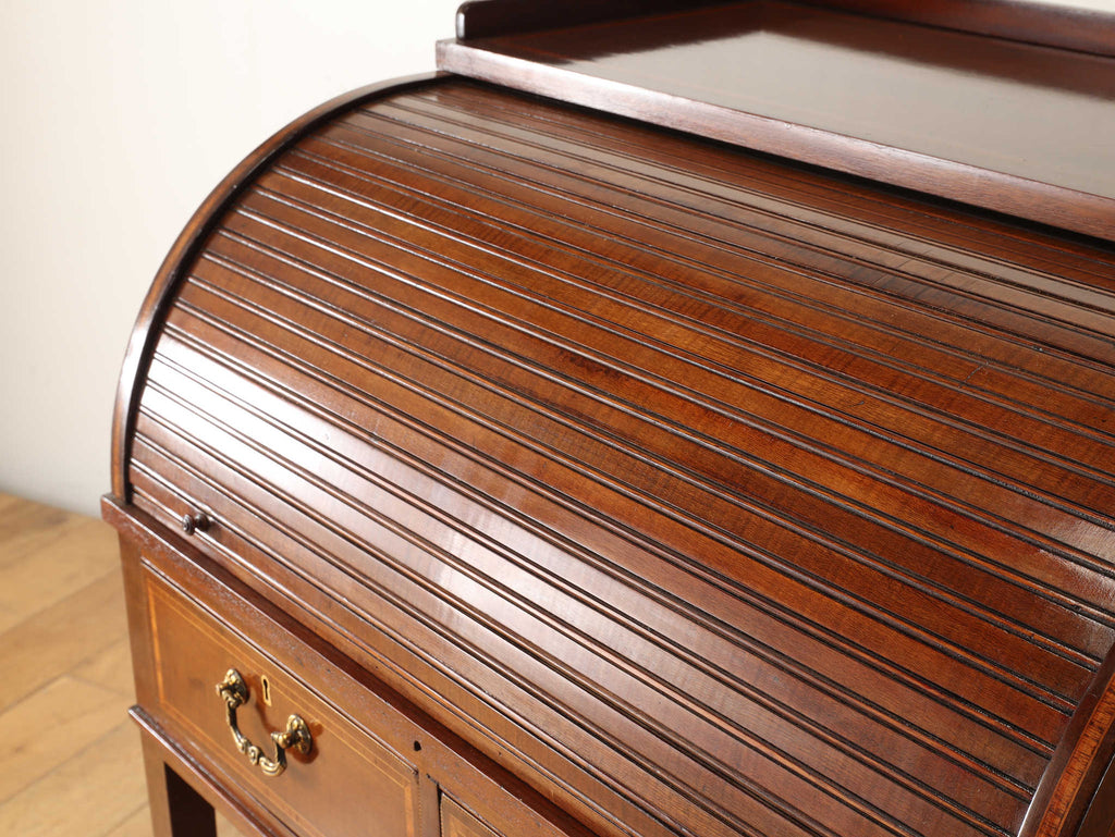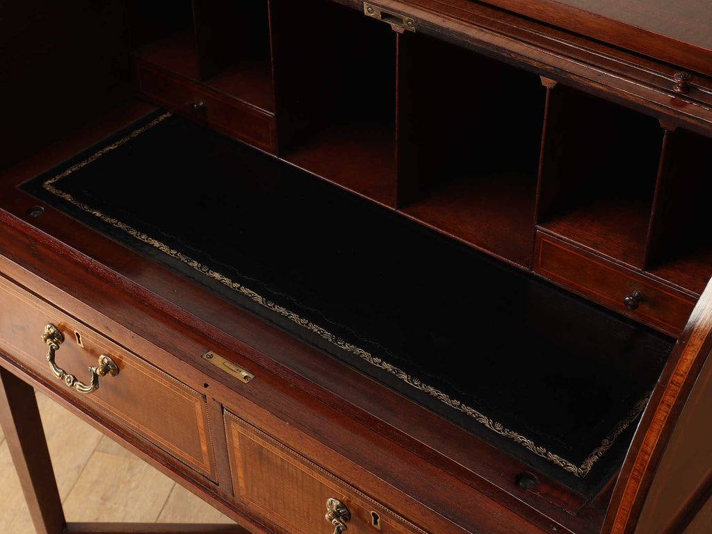 1910年代推定、イギリス製、要所に象嵌加工が施されたエドウォーディアン期のクオリティの高い、ビューローです。シンプルながらも良いマホガニー素材を使用しており、褐色に落ち着いた経年変化からは時代の流れと風合いを感じることができます。ロールトップ型のビューローは現在ではとても少なく、良いコンディションで入荷するのも珍しいです。開口部からの天板はイギリスでオーダーしたレザーで新しく張り替えられており、実用性も十分です。クラシックの空気を纏っていますが、そのシンプルなデザインからモダンな空間でも存在感を示してくれるでしょう。上部天板:W740/D295 引き出した際のデスク天板:W715/D495