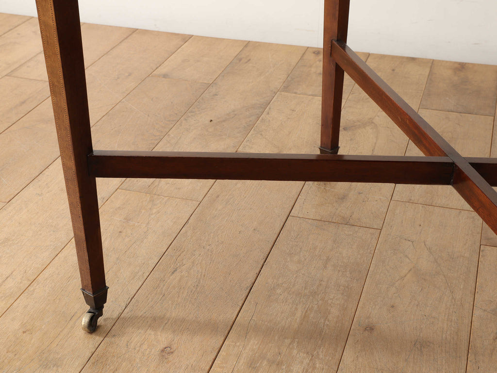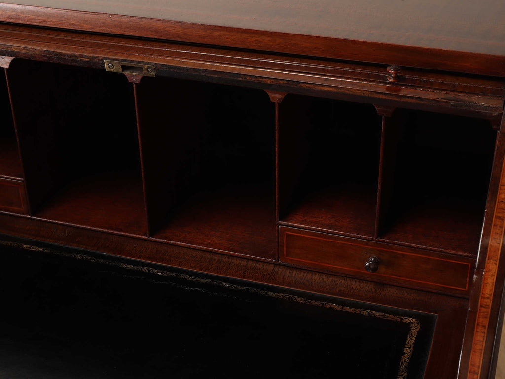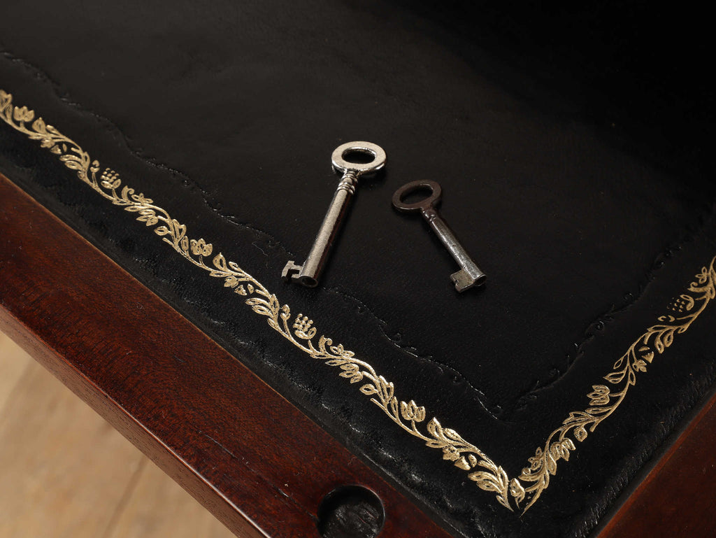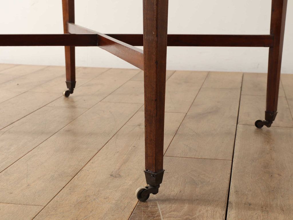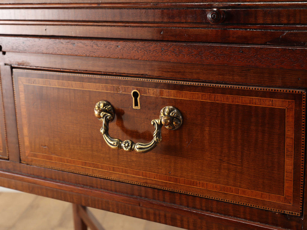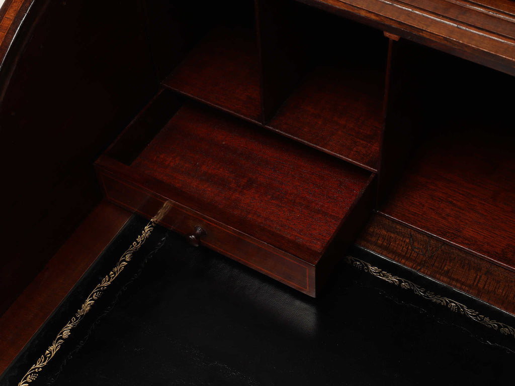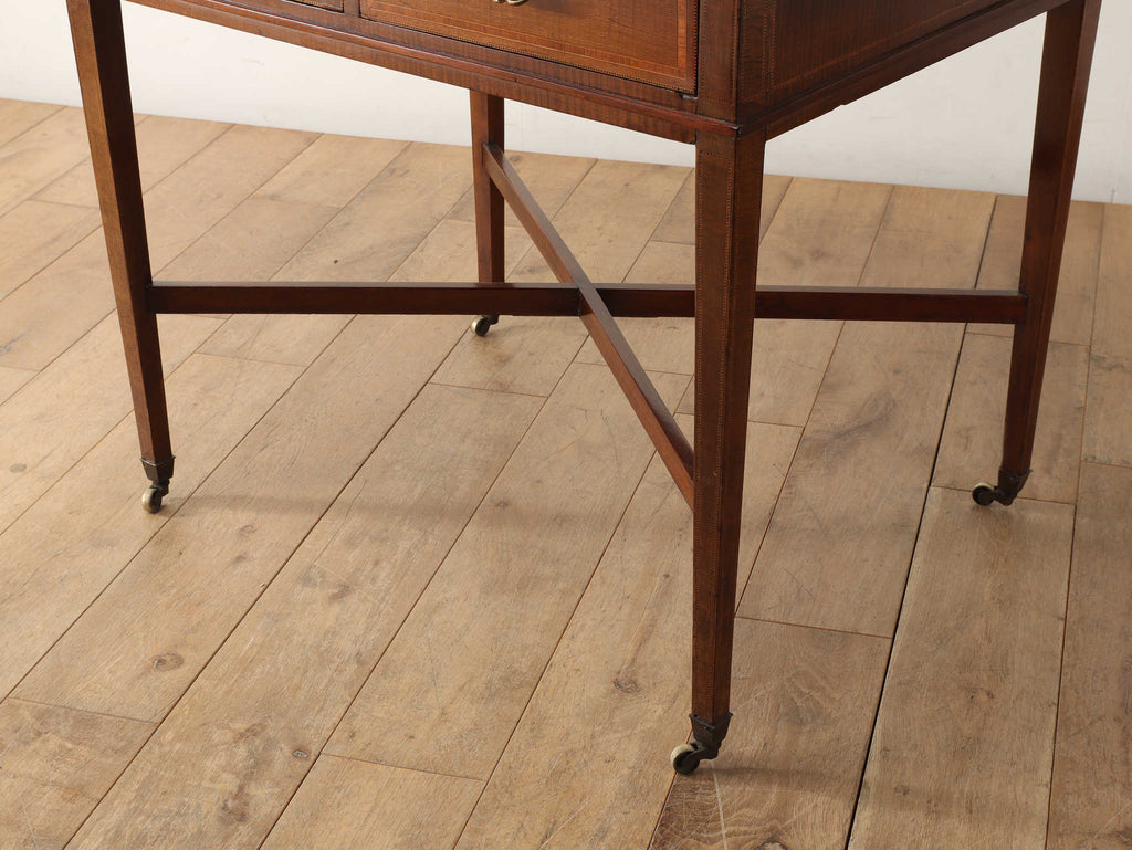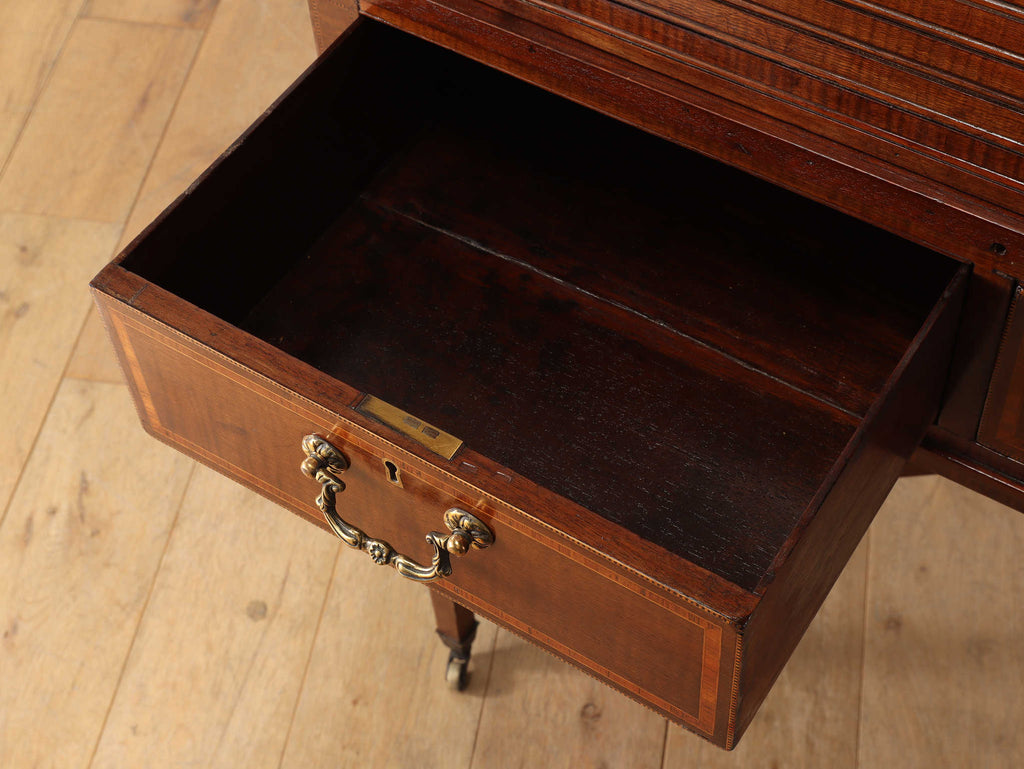 1910年代推定、イギリス製、要所に象嵌加工が施されたエドウォーディアン期のクオリティの高い、ビューローです。シンプルながらも良いマホガニー素材を使用しており、褐色に落ち着いた経年変化からは時代の流れと風合いを感じることができます。ロールトップ型のビューローは現在ではとても少なく、良いコンディションで入荷するのも珍しいです。開口部からの天板はイギリスでオーダーしたレザーで新しく張り替えられており、実用性も十分です。クラシックの空気を纏っていますが、そのシンプルなデザインからモダンな空間でも存在感を示してくれるでしょう。上部天板:W740/D295 引き出した際のデスク天板:W715/D495