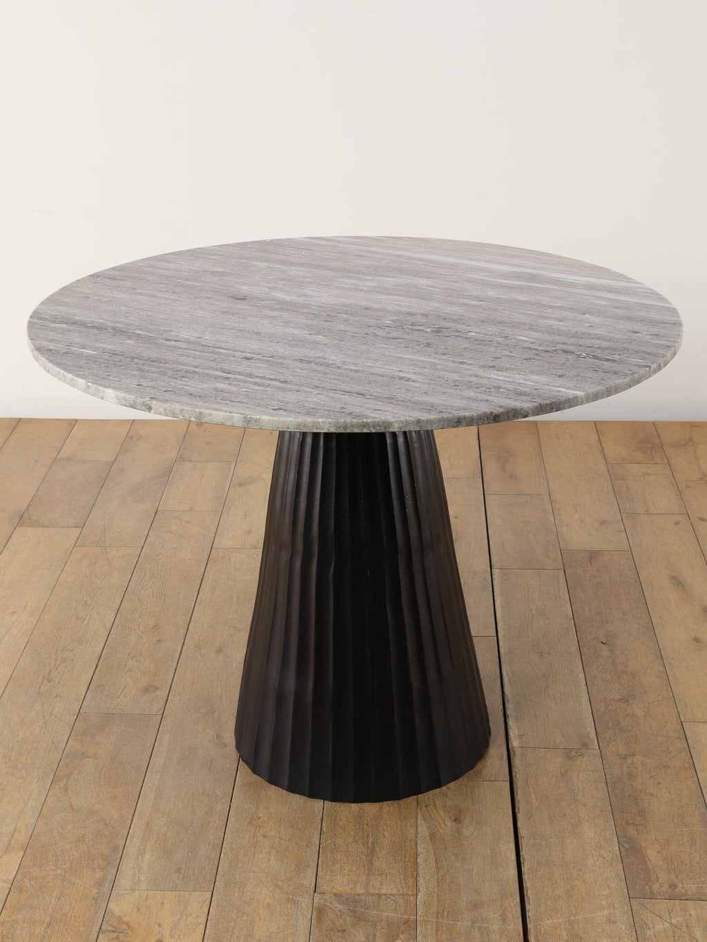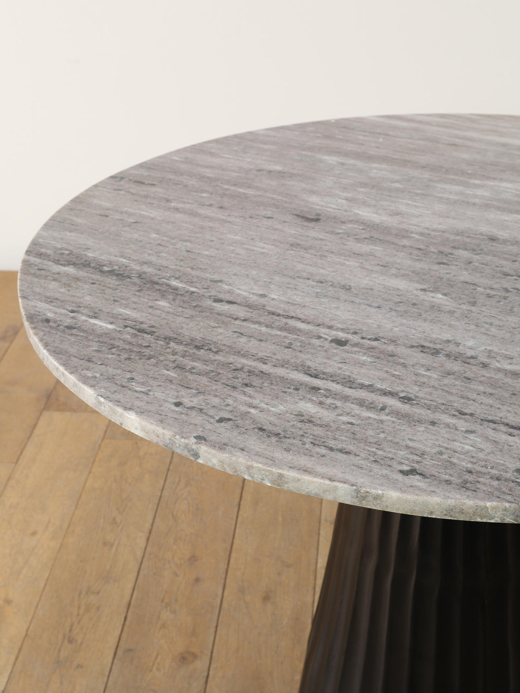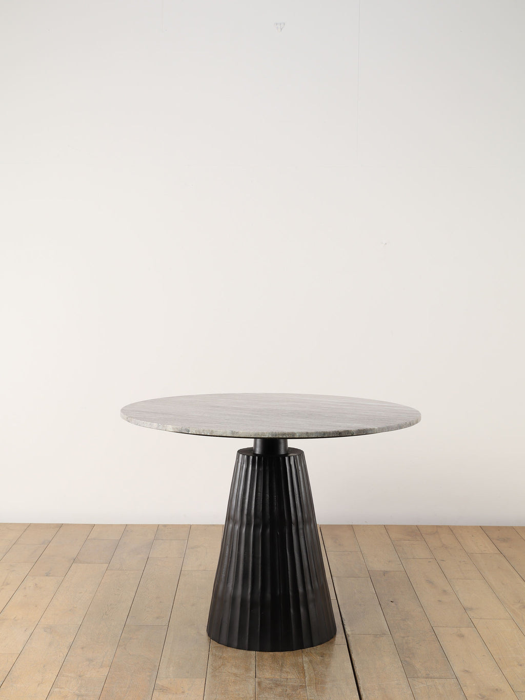 直径100cmのラウンド天板に、大理石を贅沢に用いたダイニングテーブル。マーブル特有の奥行きある模様と上品な艶が、空間に静かな緊張感と洗練をもたらします。円形のフォルムは動線を妨げにくく、2?4人で囲む食卓に程よい距離感を生み出します。重厚感のある天板を、彫刻的なベースがしっかりと支え、モダンで安定感のある佇まいに。ダイニングとしてはもちろん、ラウンジやミーティングスペースにも映え、日常の時間を上質なシーンへと引き上げる一台です。