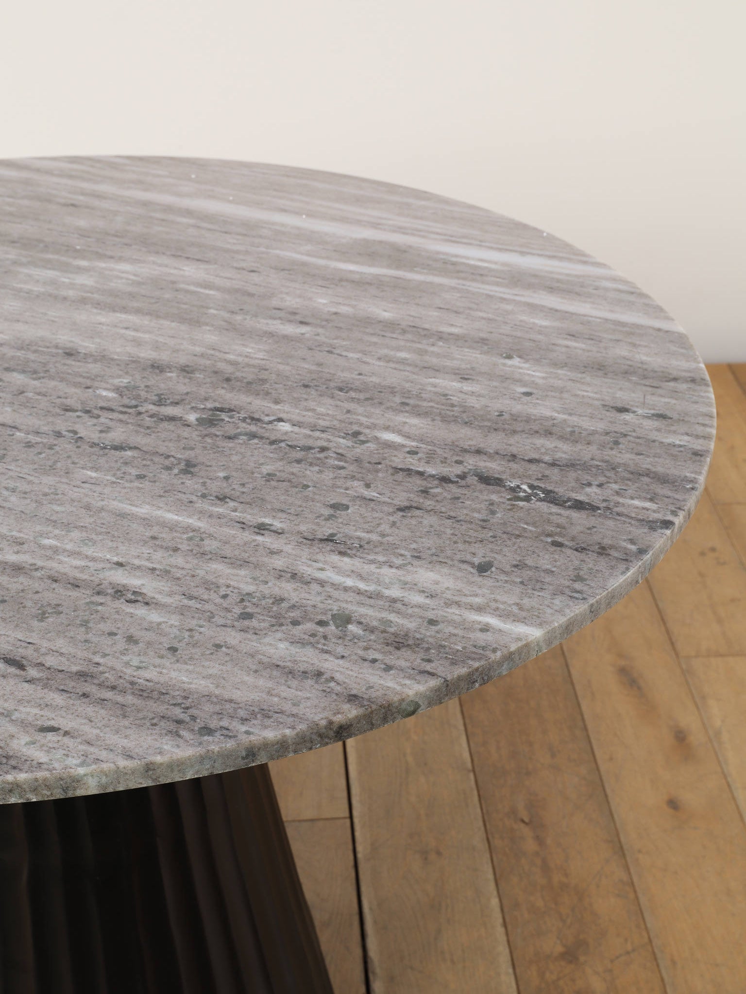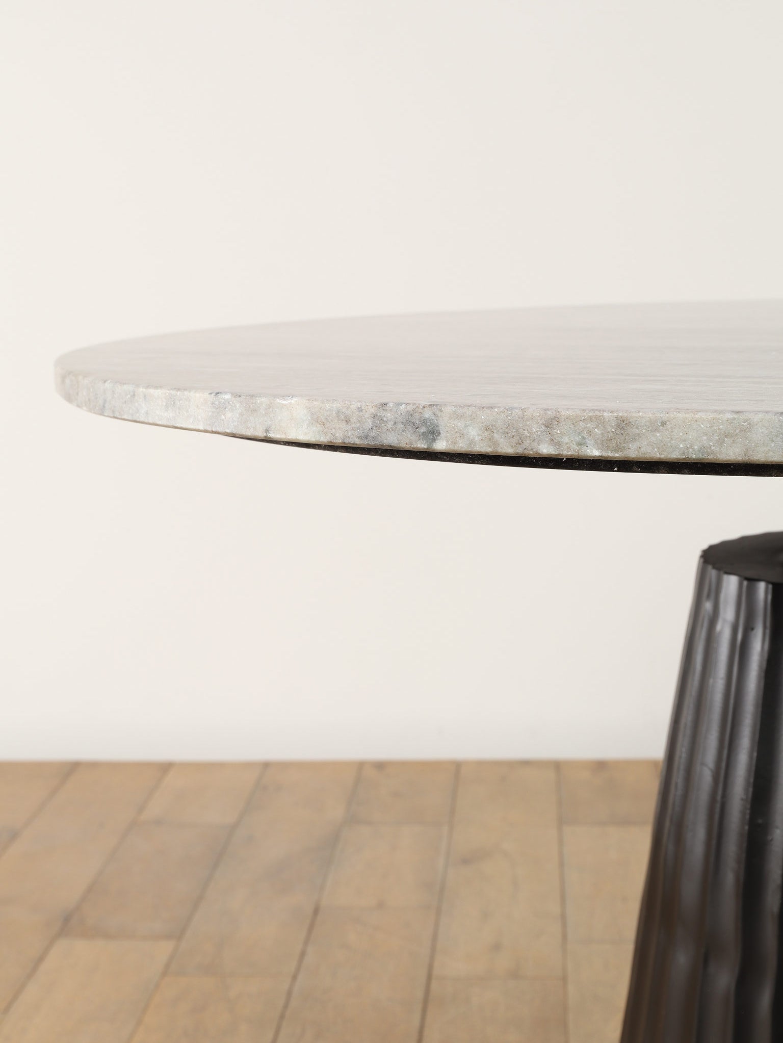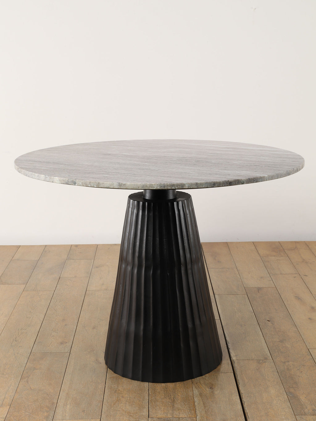 直径100cmのラウンド天板に、大理石を贅沢に用いたダイニングテーブル。マーブル特有の奥行きある模様と上品な艶が、空間に静かな緊張感と洗練をもたらします。円形のフォルムは動線を妨げにくく、2?4人で囲む食卓に程よい距離感を生み出します。重厚感のある天板を、彫刻的なベースがしっかりと支え、モダンで安定感のある佇まいに。ダイニングとしてはもちろん、ラウンジやミーティングスペースにも映え、日常の時間を上質なシーンへと引き上げる一台です。