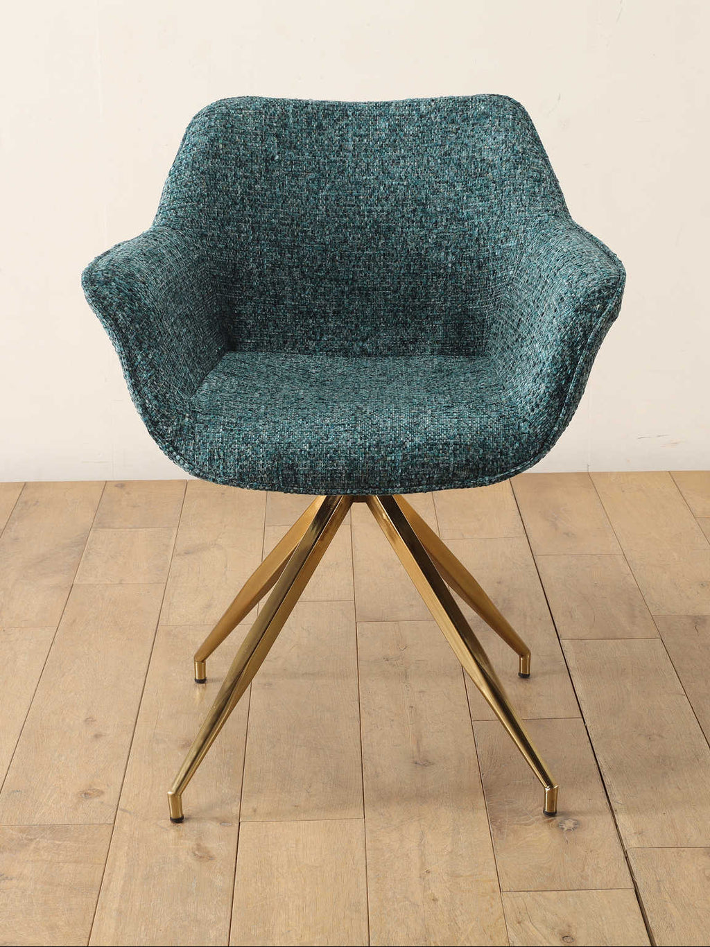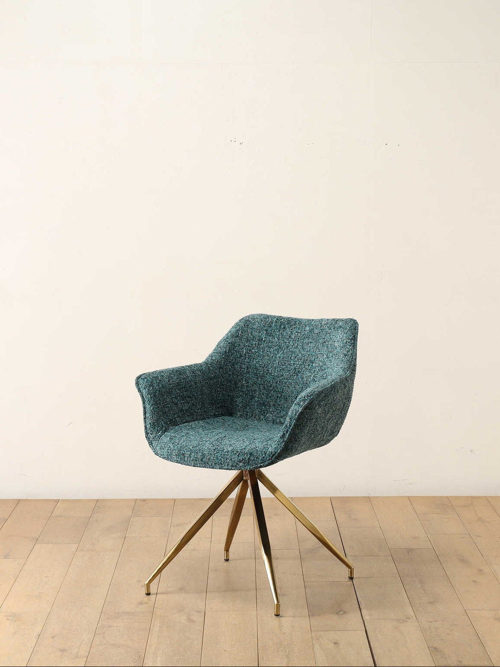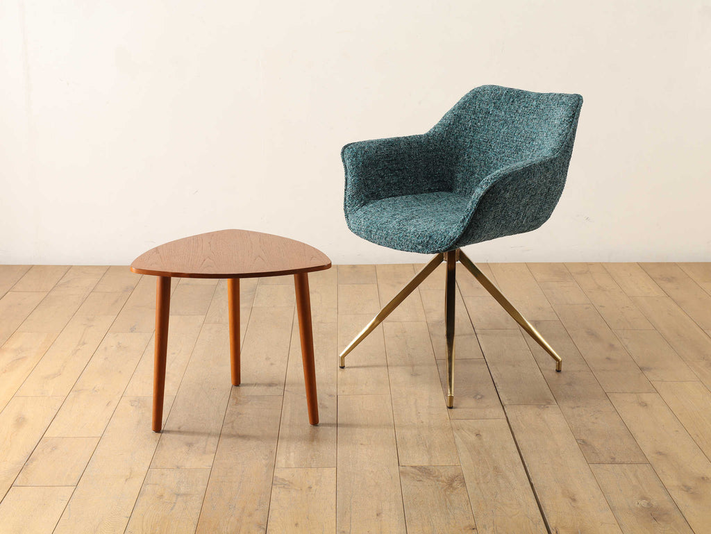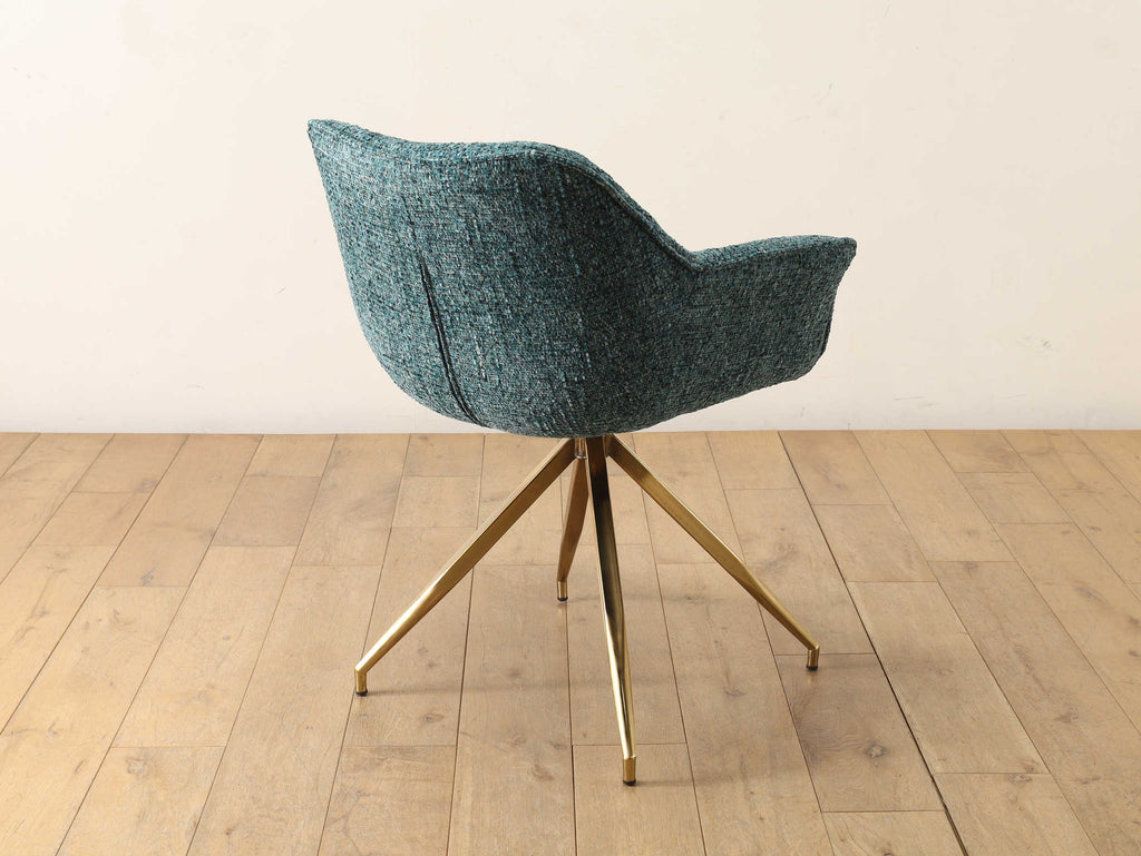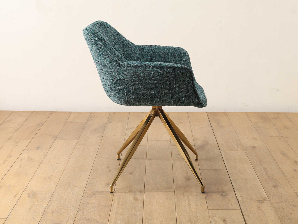 美しいカーブを描くシートとスタイリッシュな脚部が特徴的なアームチェア。グリーン系のツイード生地は高級感を演出しながらも、インテリアのアクセントカラーとして際立ち、メタリックなゴールドの脚が、モダンで洗練された印象をプラスしてくれます。ダイニングやオフィス、ラウンジとさまざまなシーンで活用いただけるアイテムです。
