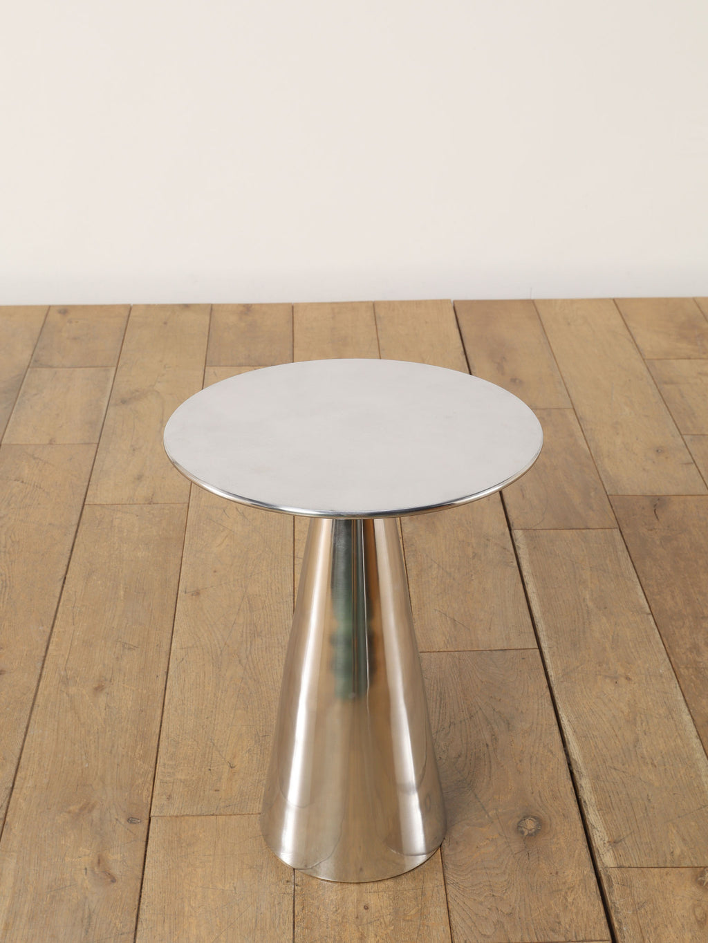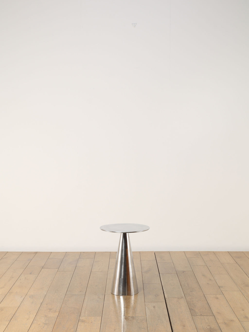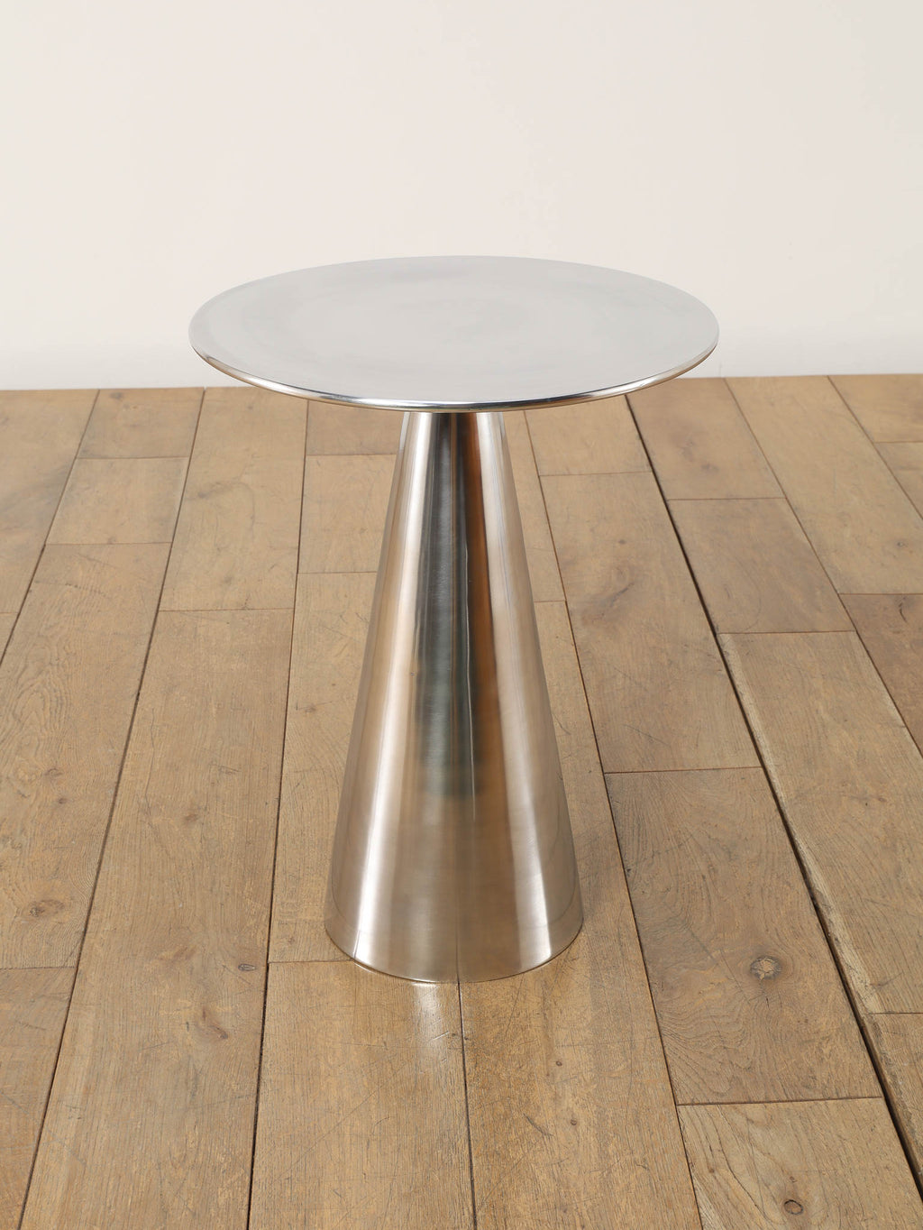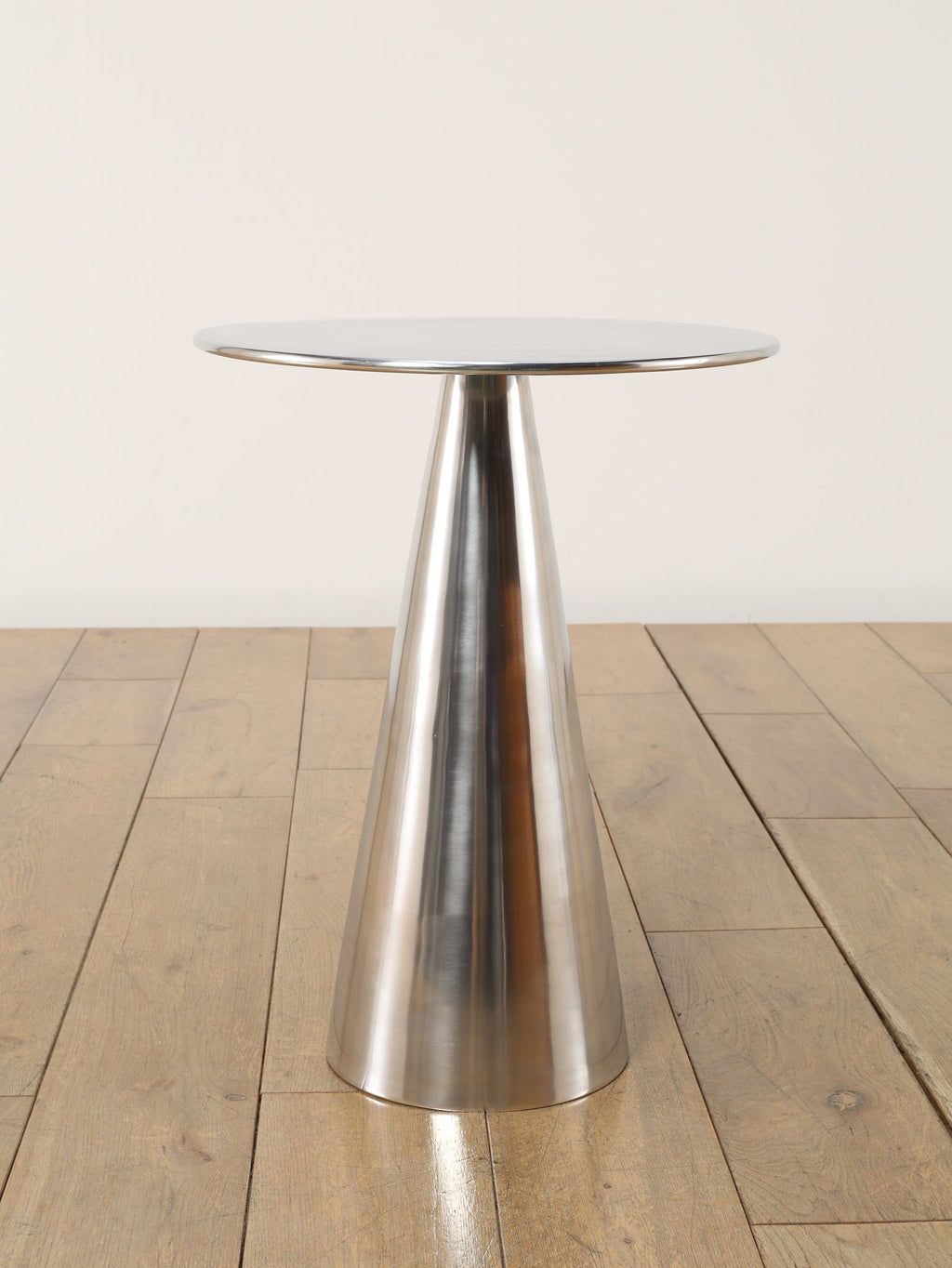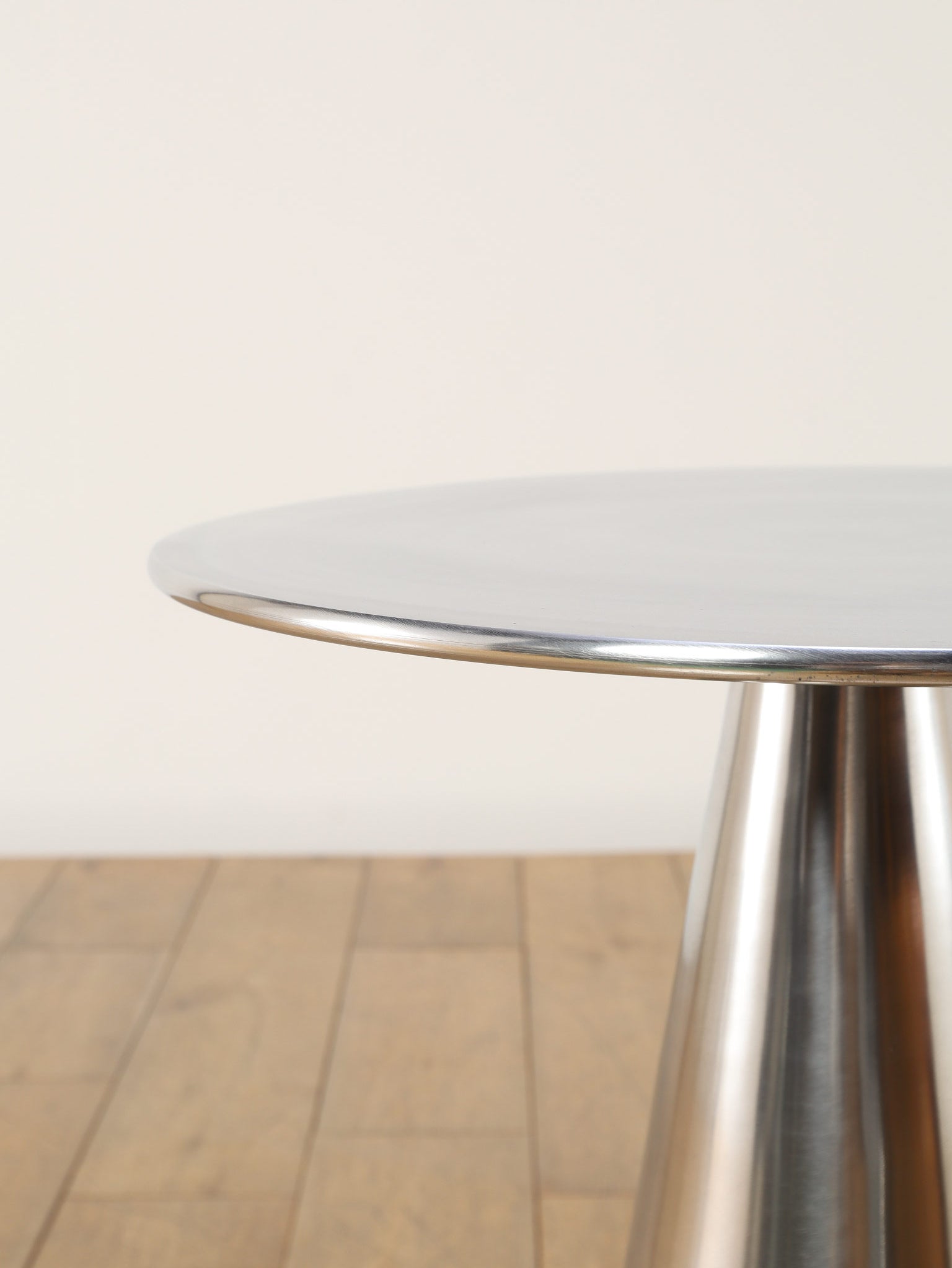 シャープな円形天板と、すっきりとしたコーン型ベースが美しいサイドテーブル。取り入れやすいサイズ感で、ソファやラウンジチェアの横に自然に収まります。無駄を削ぎ落としたフォルムは空間を圧迫せず、置く場所を選ばないのも魅力。天板にグラスや照明、花器を置くだけで、ミニマルながら洗練されたシーンが生まれます。モダンなインテリアはもちろん、ヴィンテージ家具と合わせても程よい緊張感を添え、空間全体を引き締めてくれる一台です。